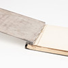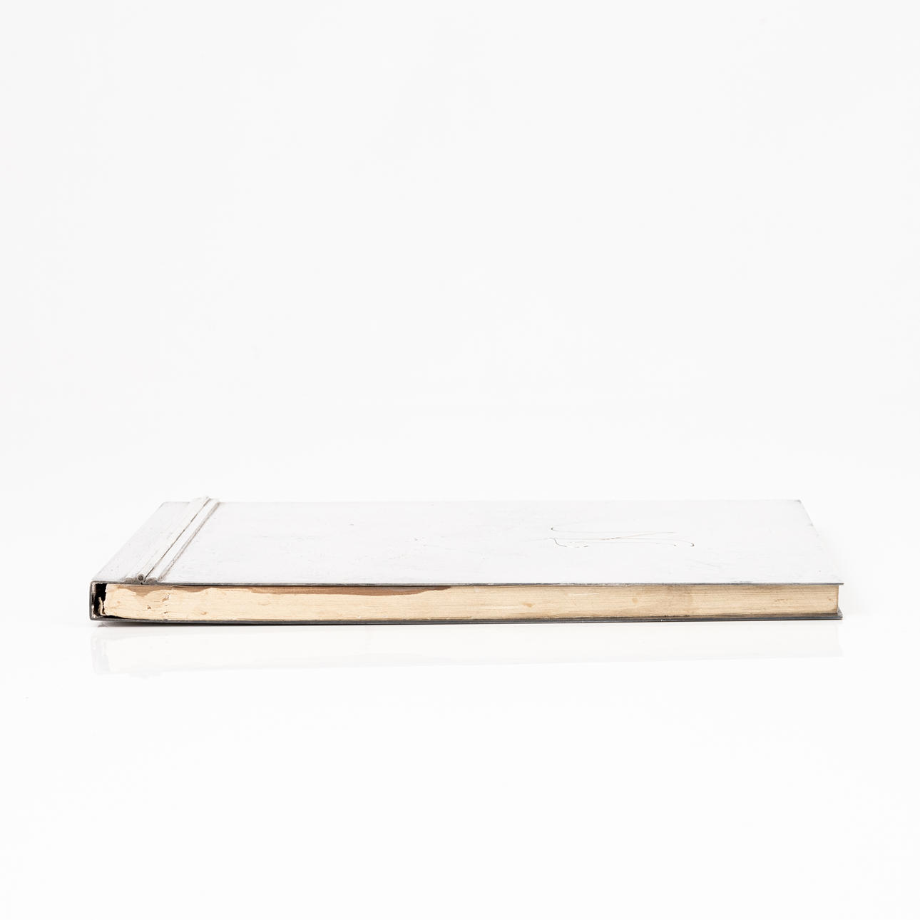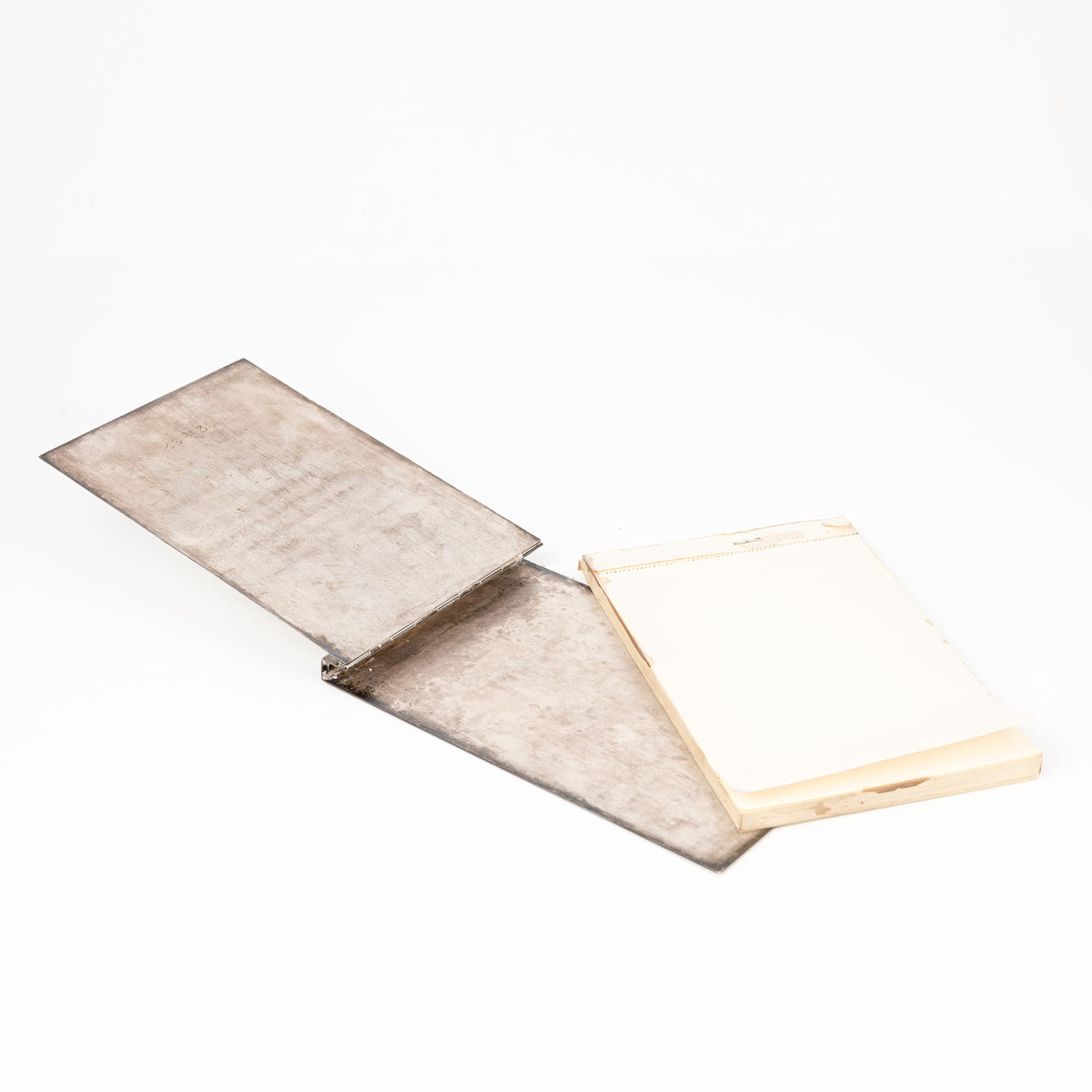 Brugsslitage, front med indgraveret monogram, indvendigt omslag med indgraveret dato. Blokken med pletter.