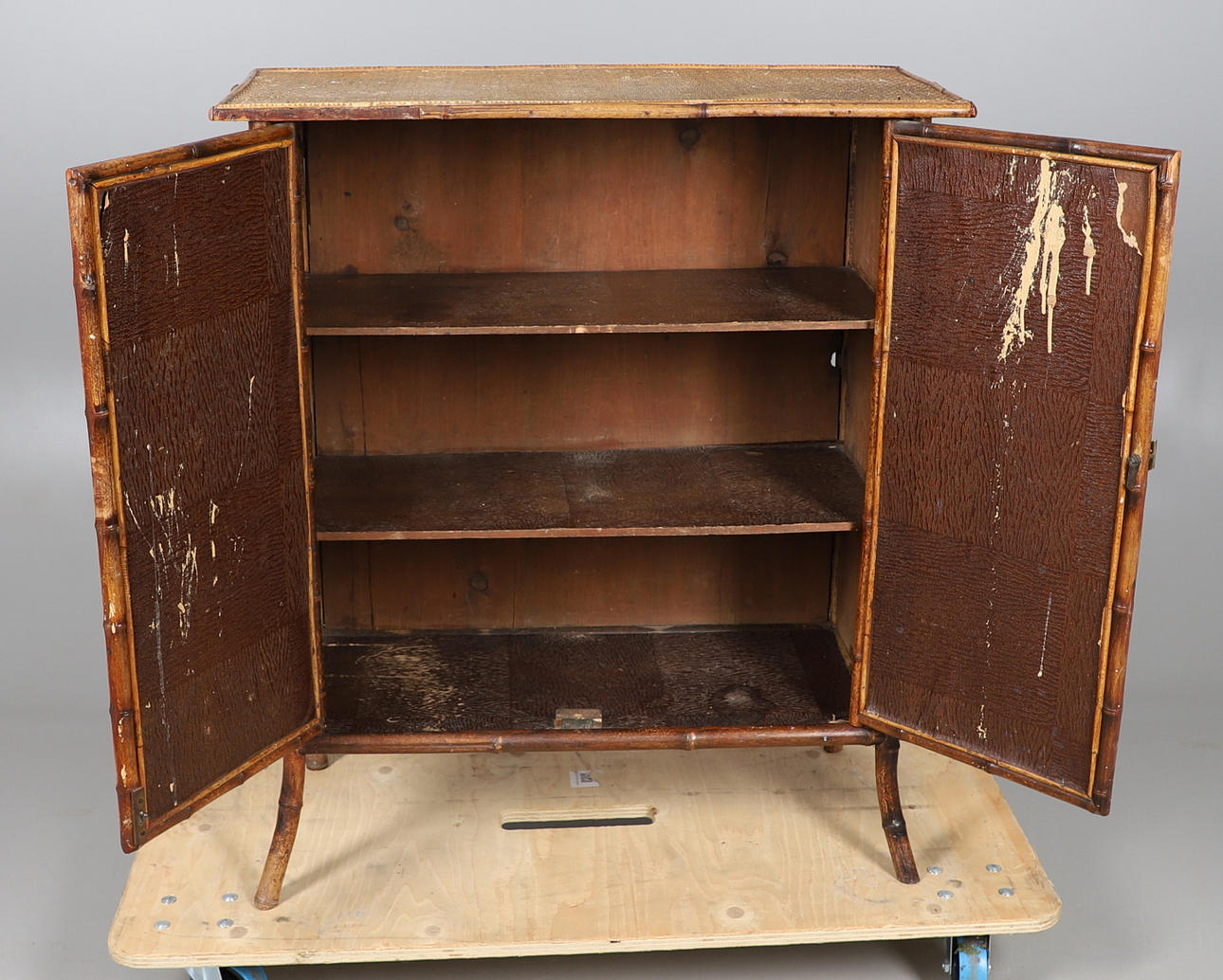 Dobbeltdørs bambusskab med spredte forben og to indvendige hylder. Højde 100cm x Bredde 87cm x Dybde 39cm.