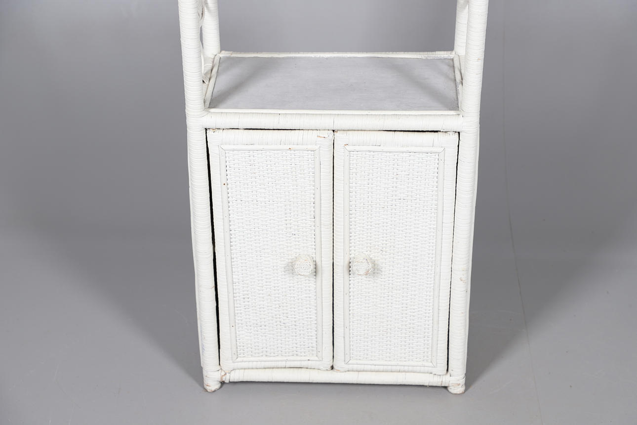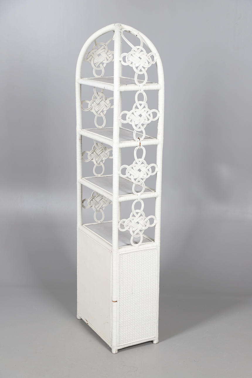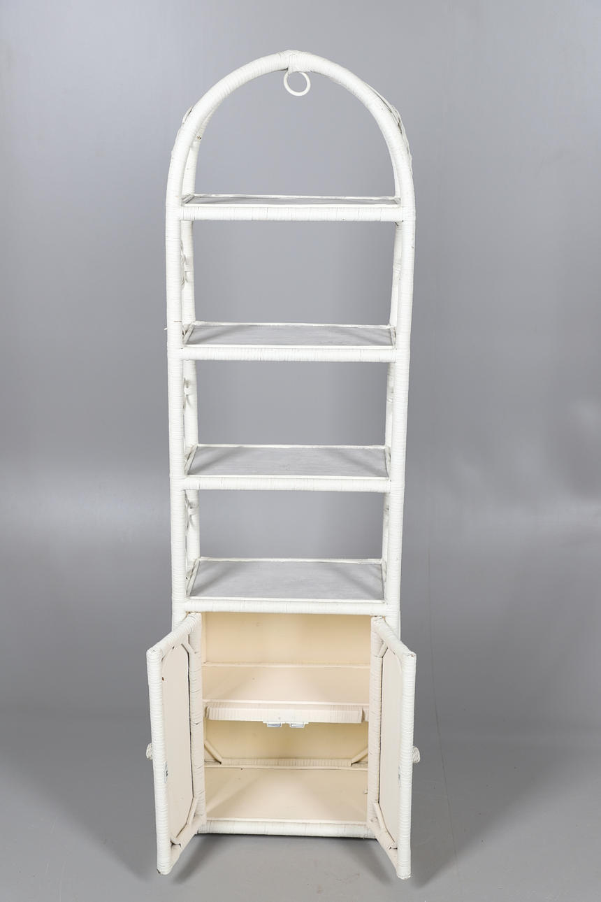 Med fire faste hylder oven på et lille to-dørs skab. Højde 155cm, bredde 44cm, dybde 26cm.