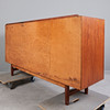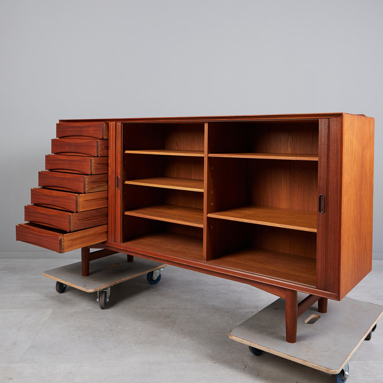 Lakeret teakkonstruktion med syv skuffer, øverste skuffe udstyret med aftagelig hylde og to skydedøre, med to rum og fem hylder på indersiden, med producentens badge på bagsiden, H.115cm, L.183cm, W.50cm.