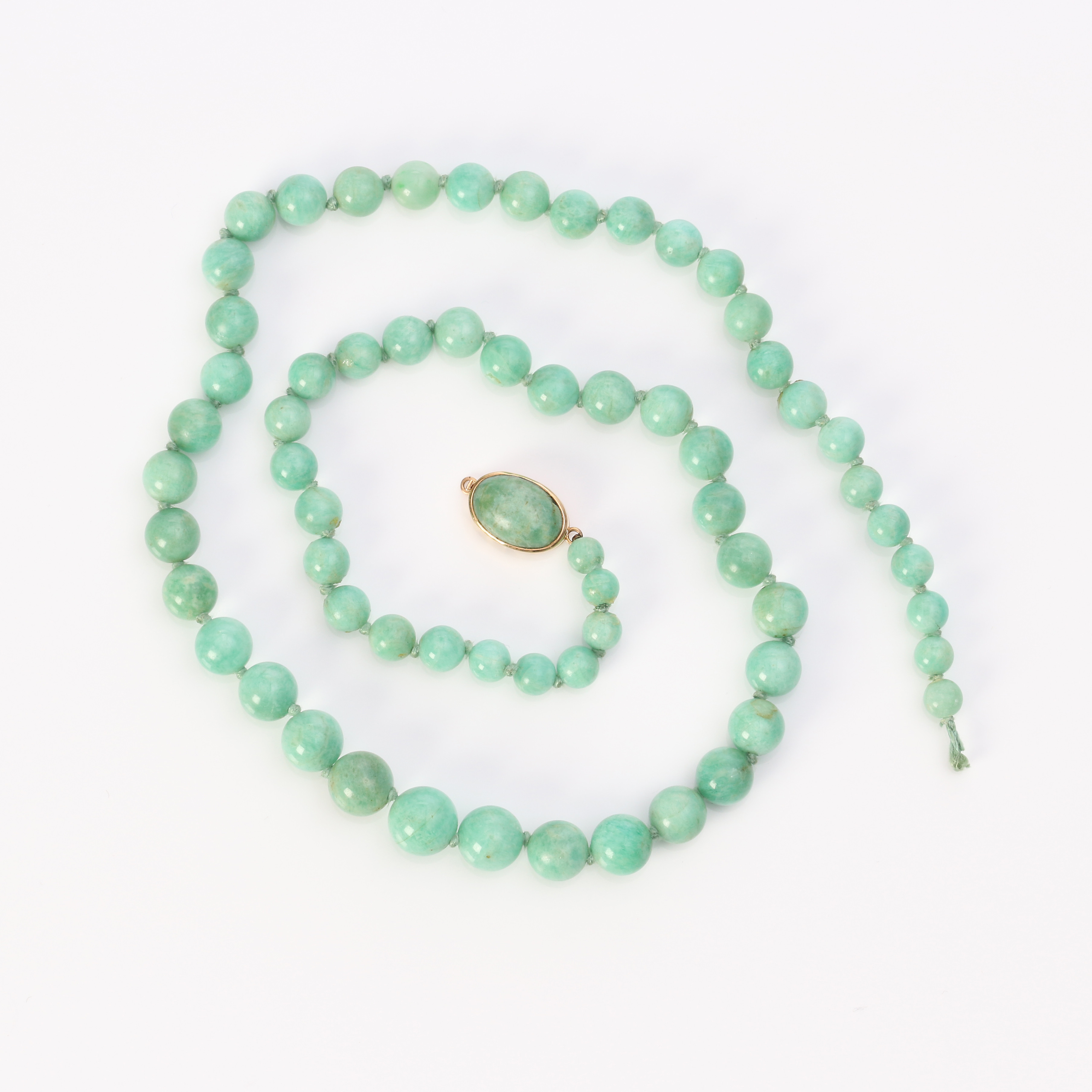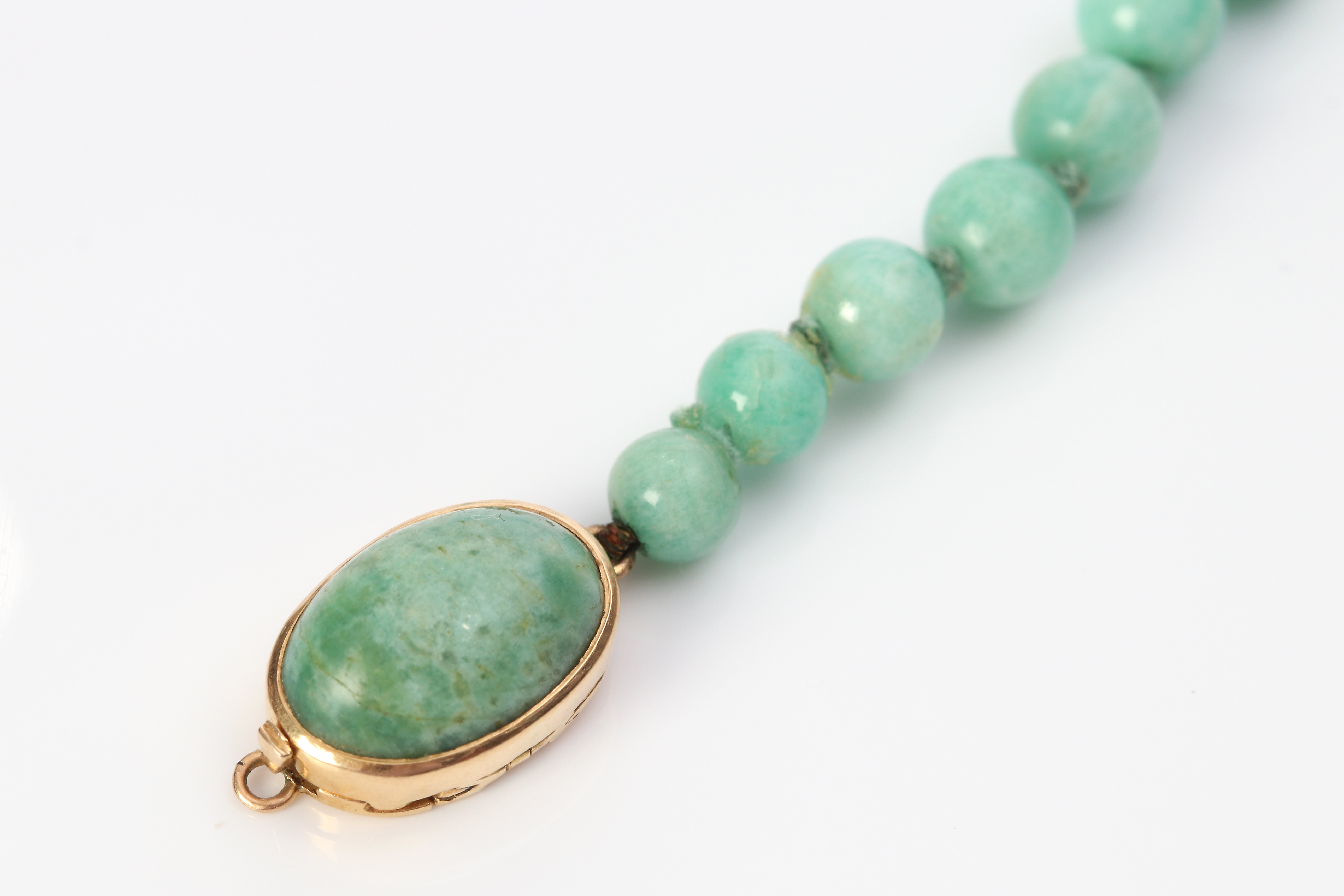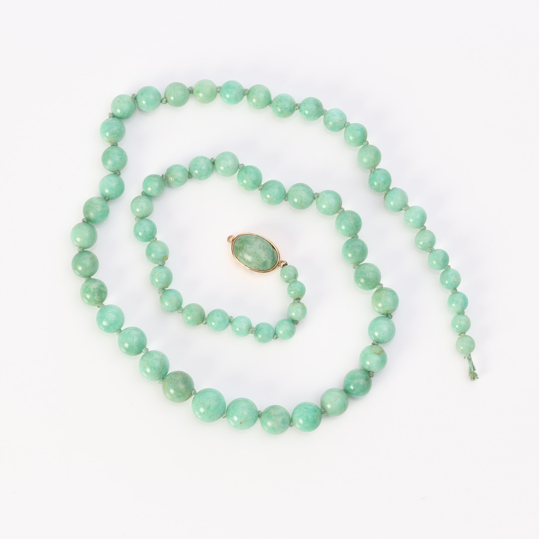 3778048. HALSKÆDE. Bolde af grøn beryl, låse i guld.