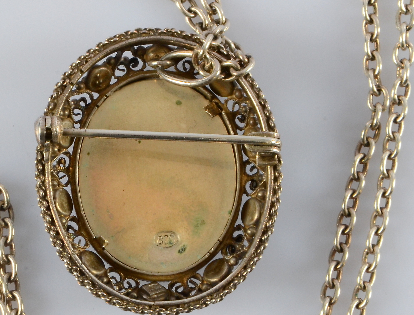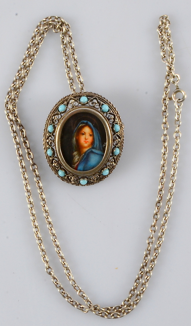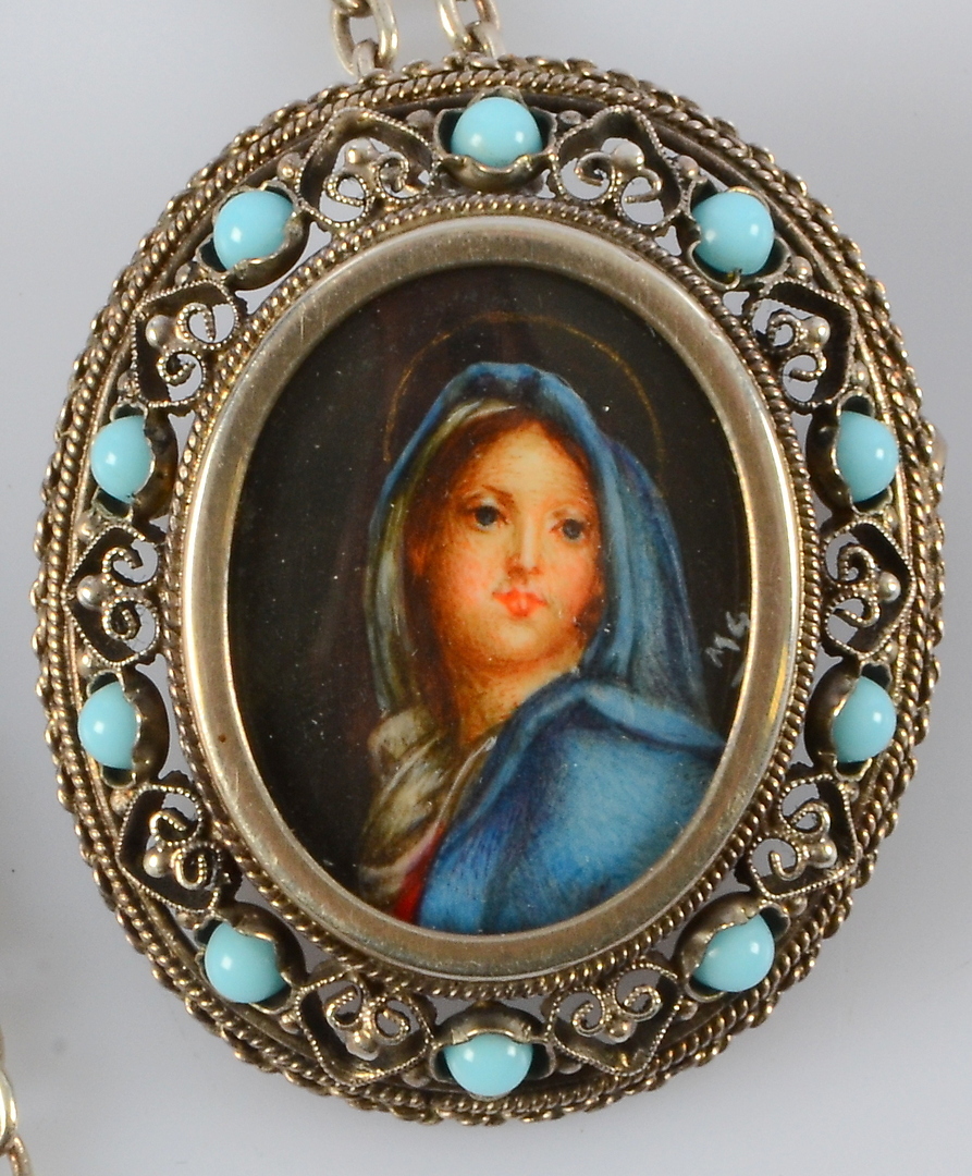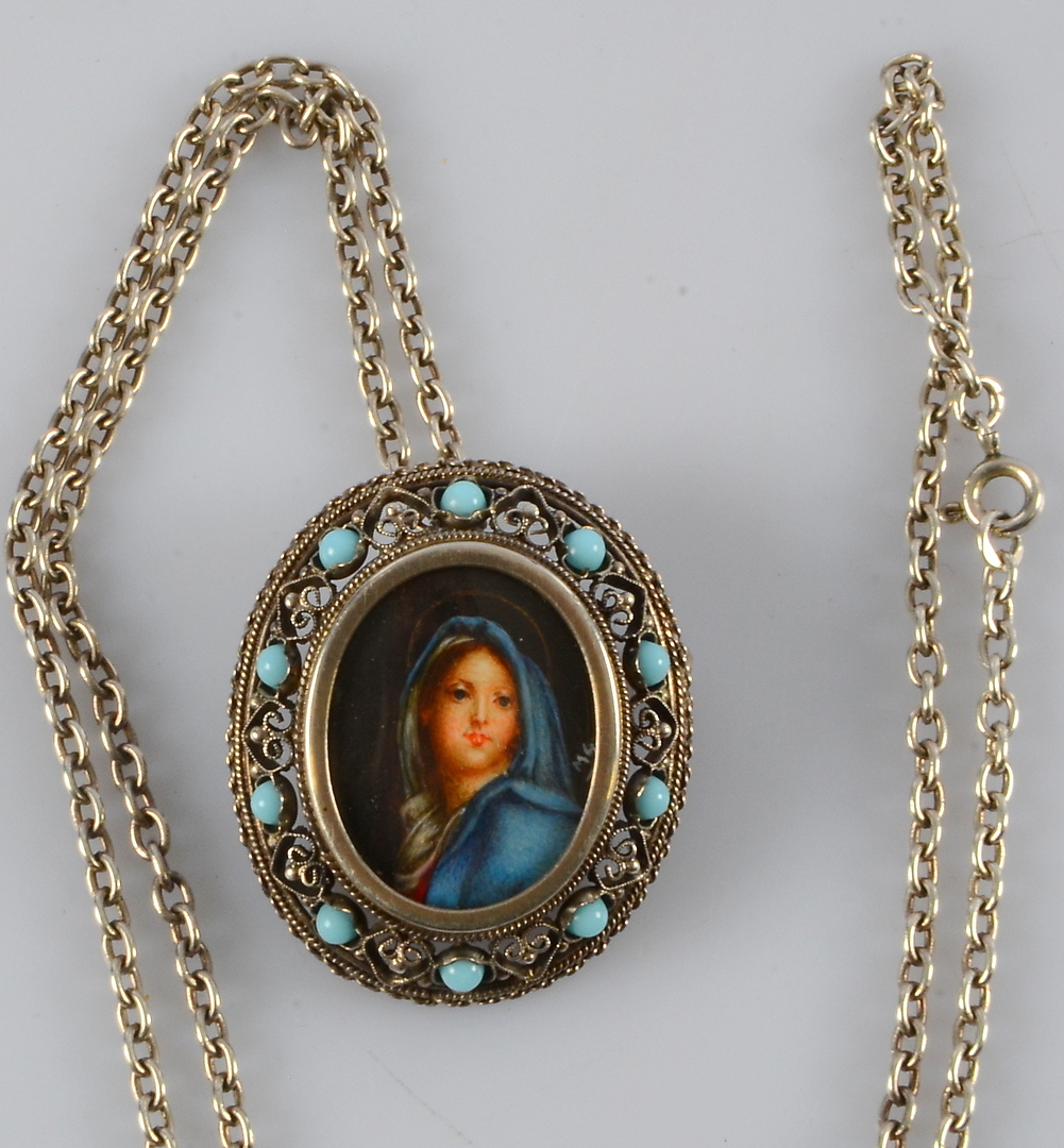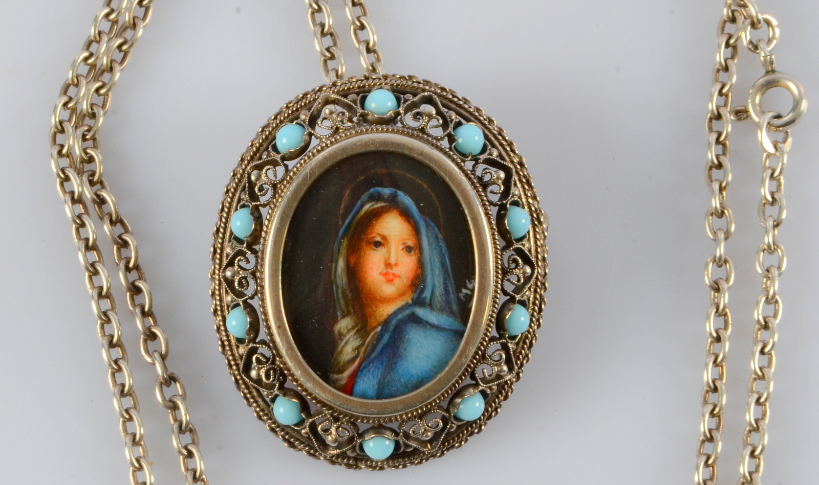 377941. SØLVBROCHE MED STEN OG MINIATURMALERING.