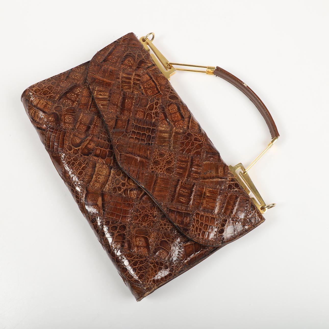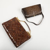 1 håndtaske, kunstigt krokodilleskind med lommespejl i rum, ca. 13 x 23 cm, dybde ca. 6 cm. 1 håndtaske, evt. Bon Gout, ca. 17 x 28, dybde ca. 5 cm.