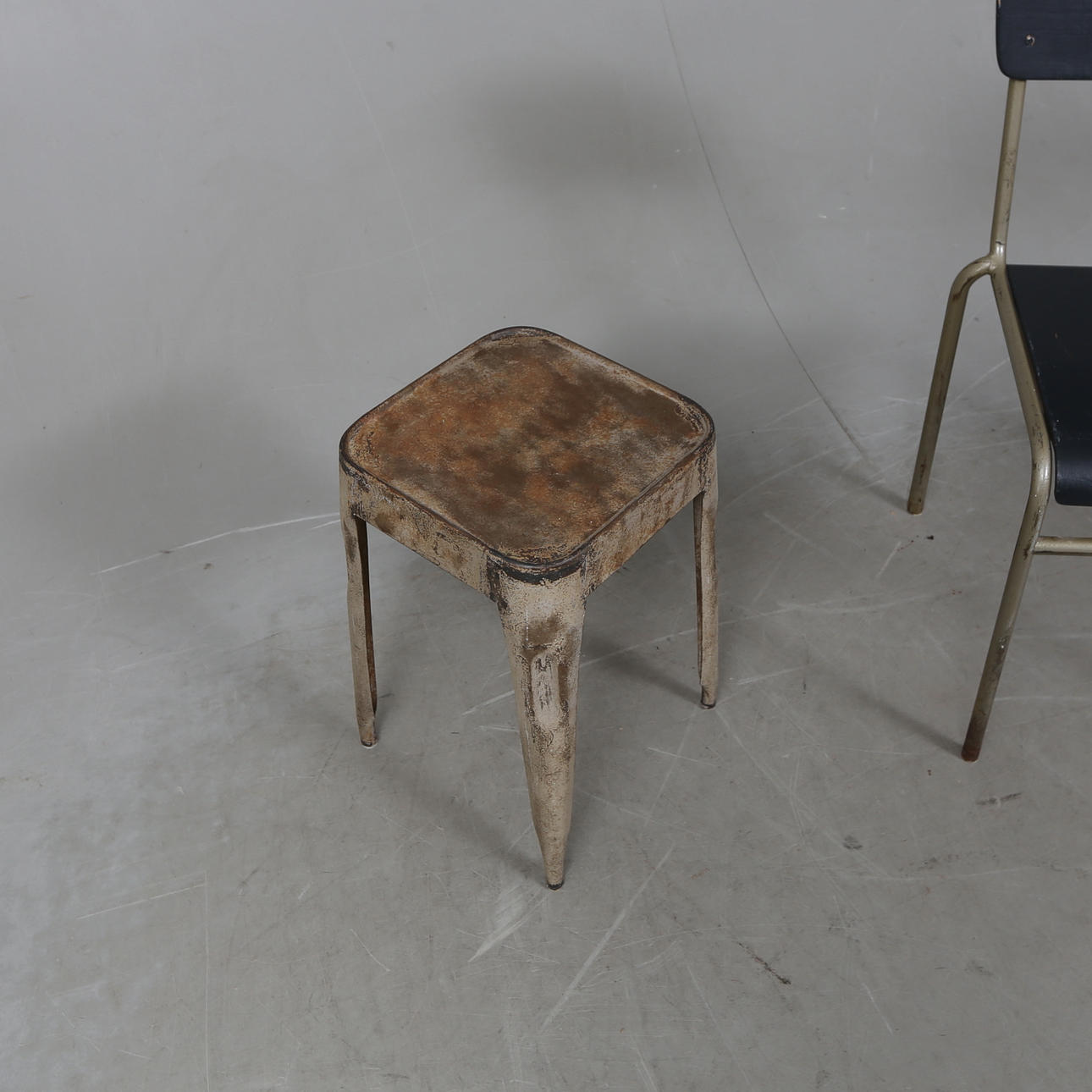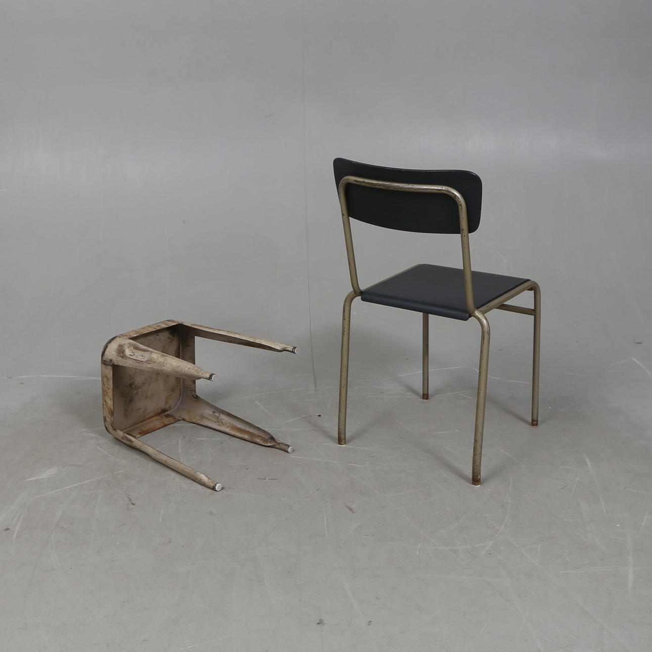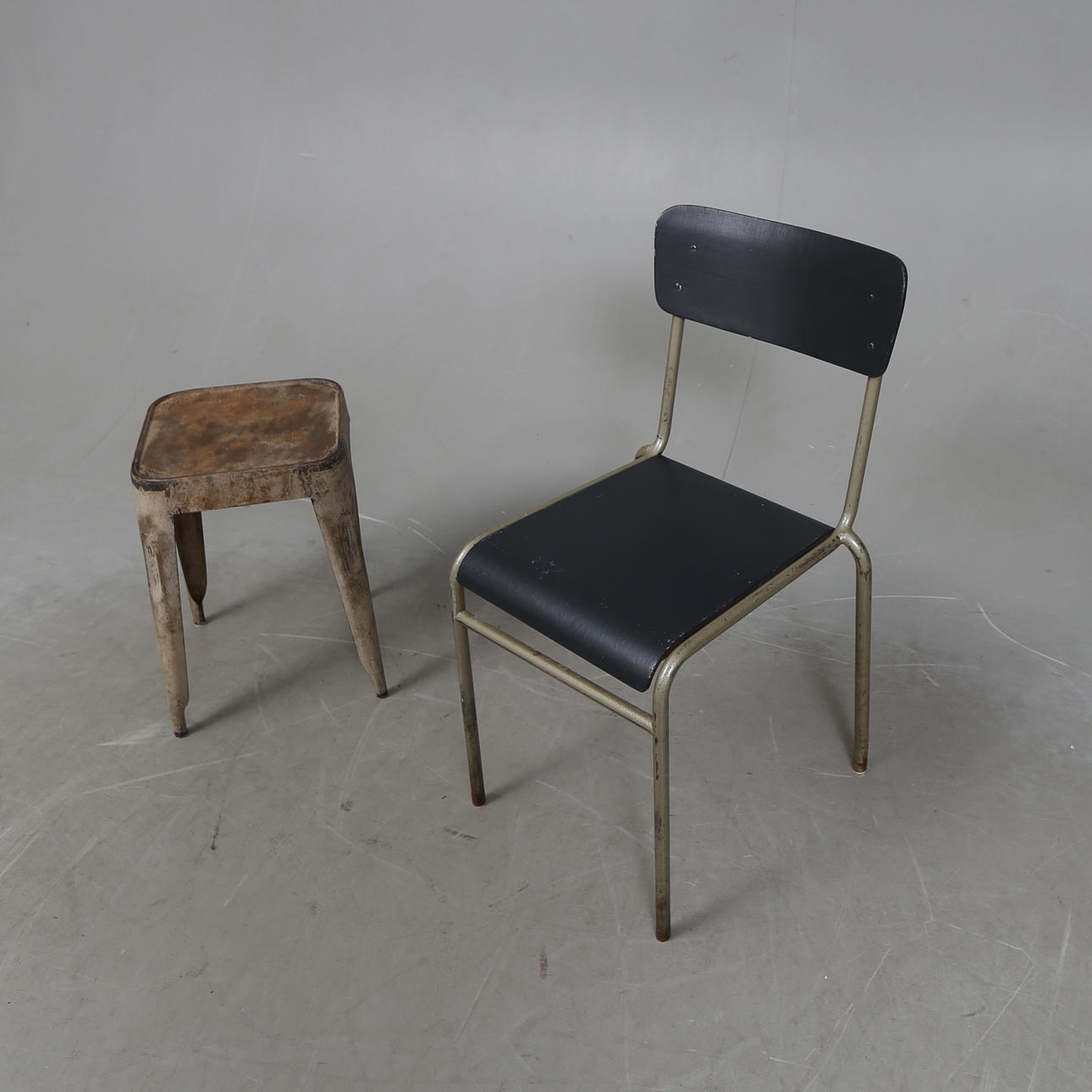 Skammeret i metal, stolen i stål og malet træ.