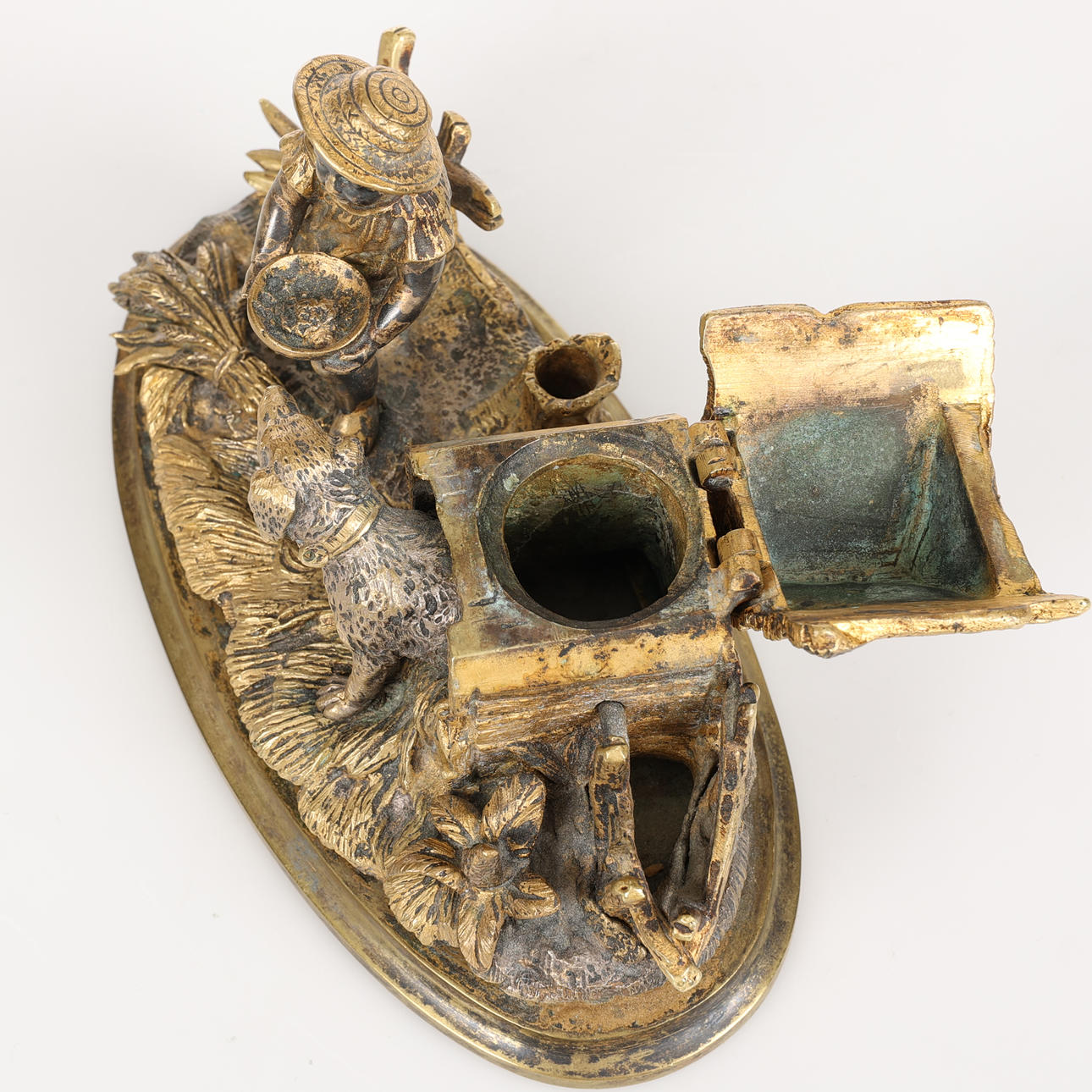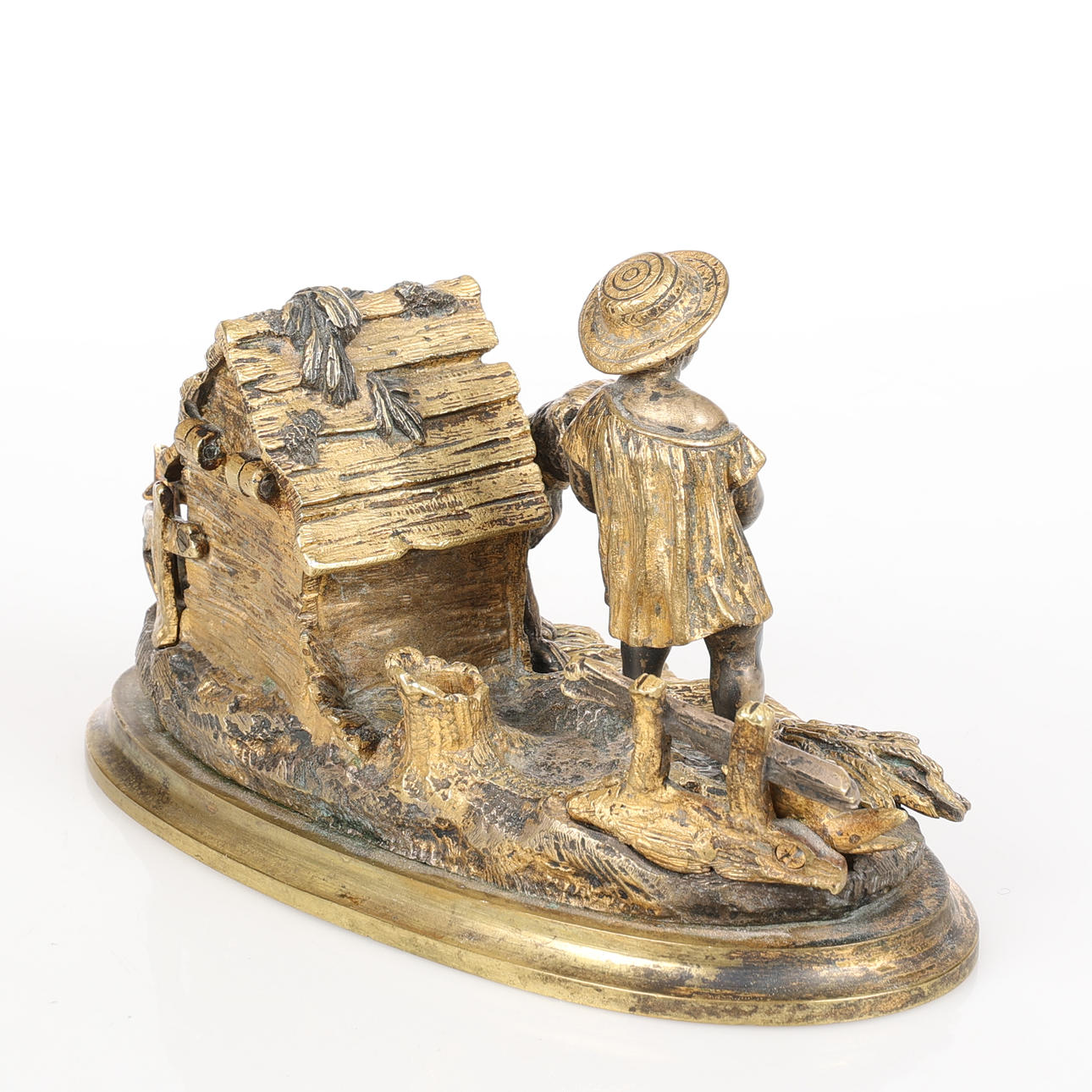 Dreng fodrer hund. Blækkop i hundehuset, pennestativ i stubben. længde 18 cm, højde 11 cm.
