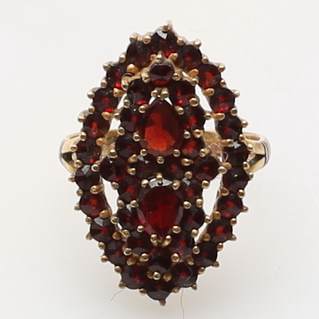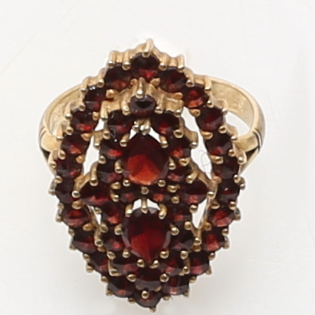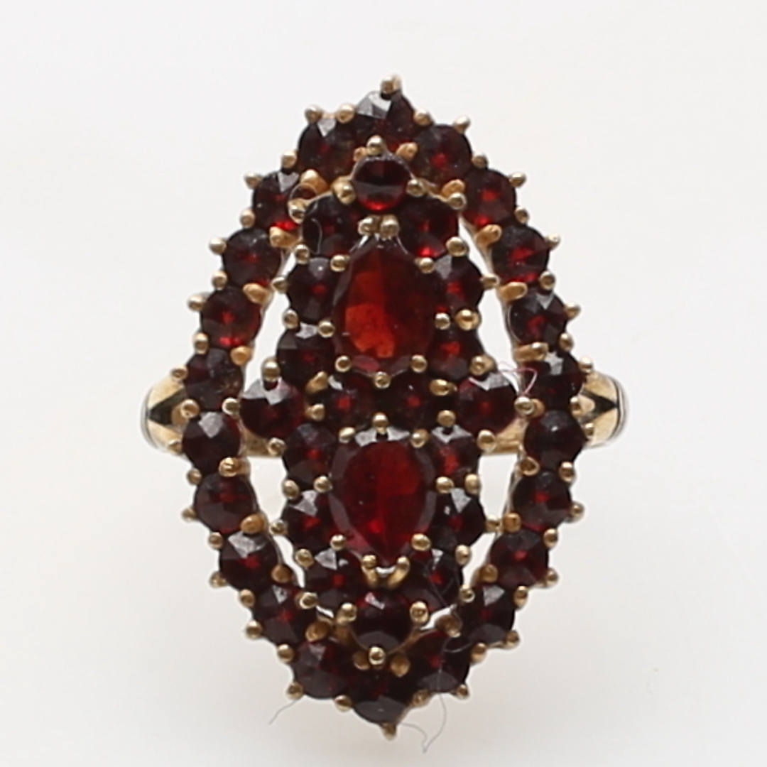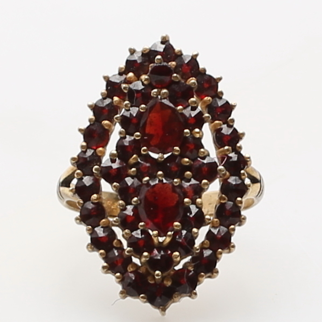 380071. RING, forgyldt sølv, granater, totalvægt 3,2 gram.