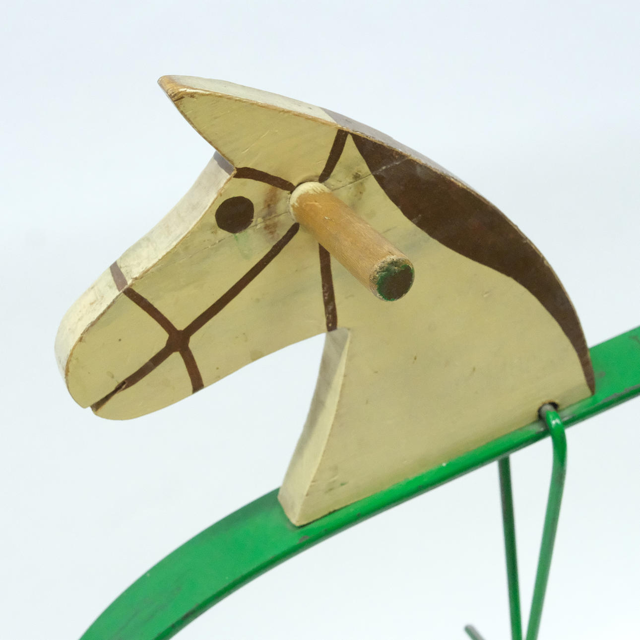 Gyngehest i træ og metal, højde 54cm, længde 60cm.