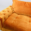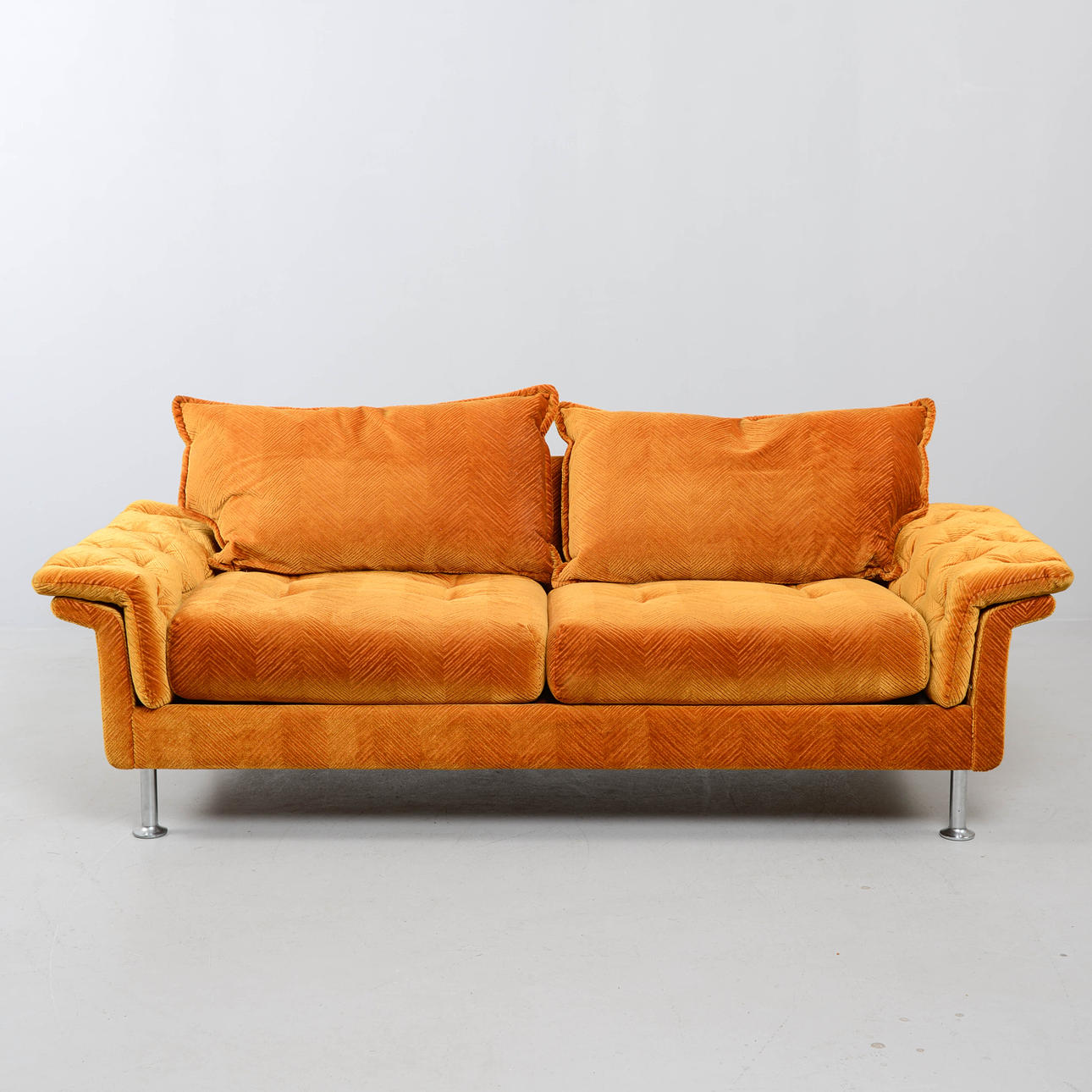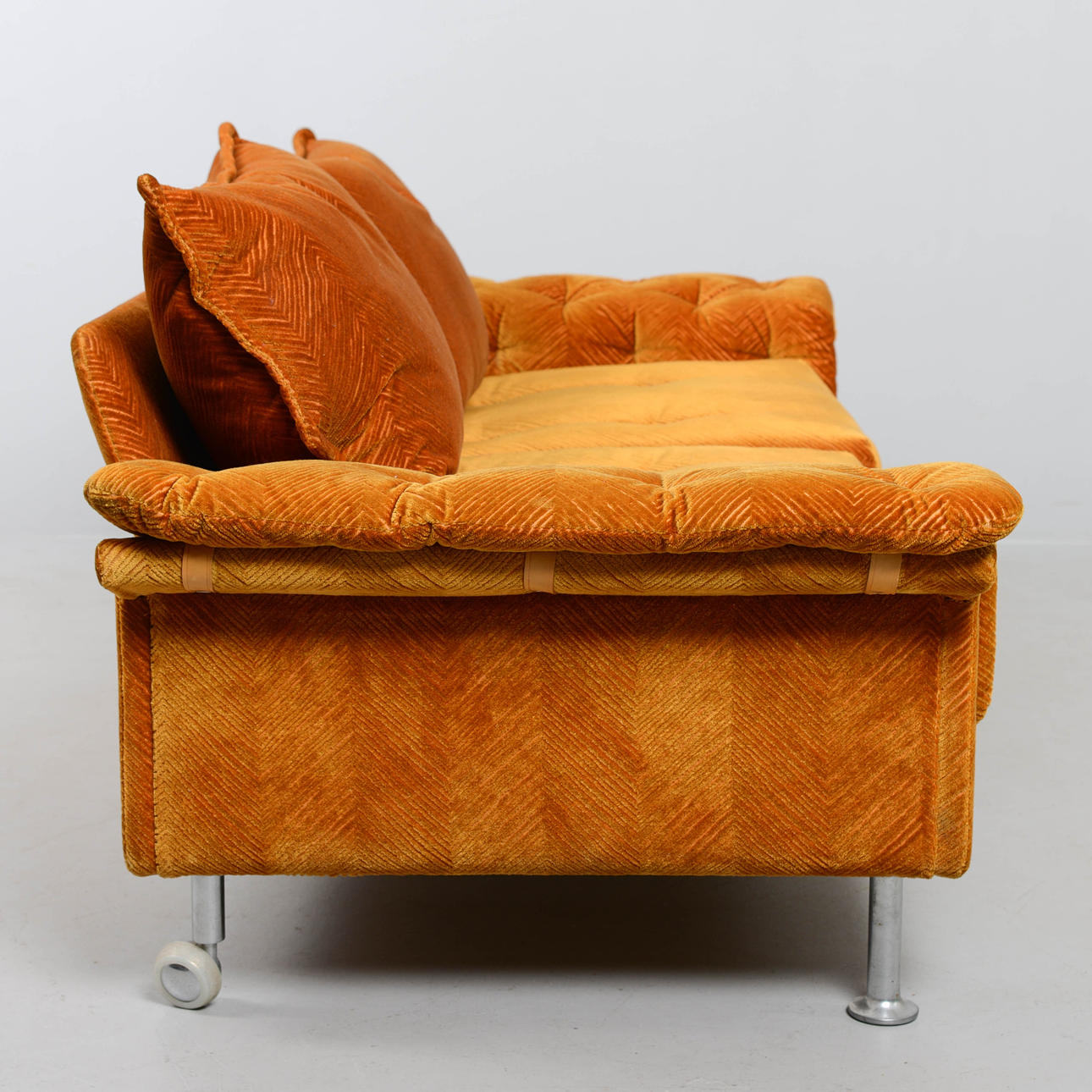 Sennepsgul plyspolstring. Metalben. Længde 180 cm. Højde 63 cm. Dybde 83 cm.