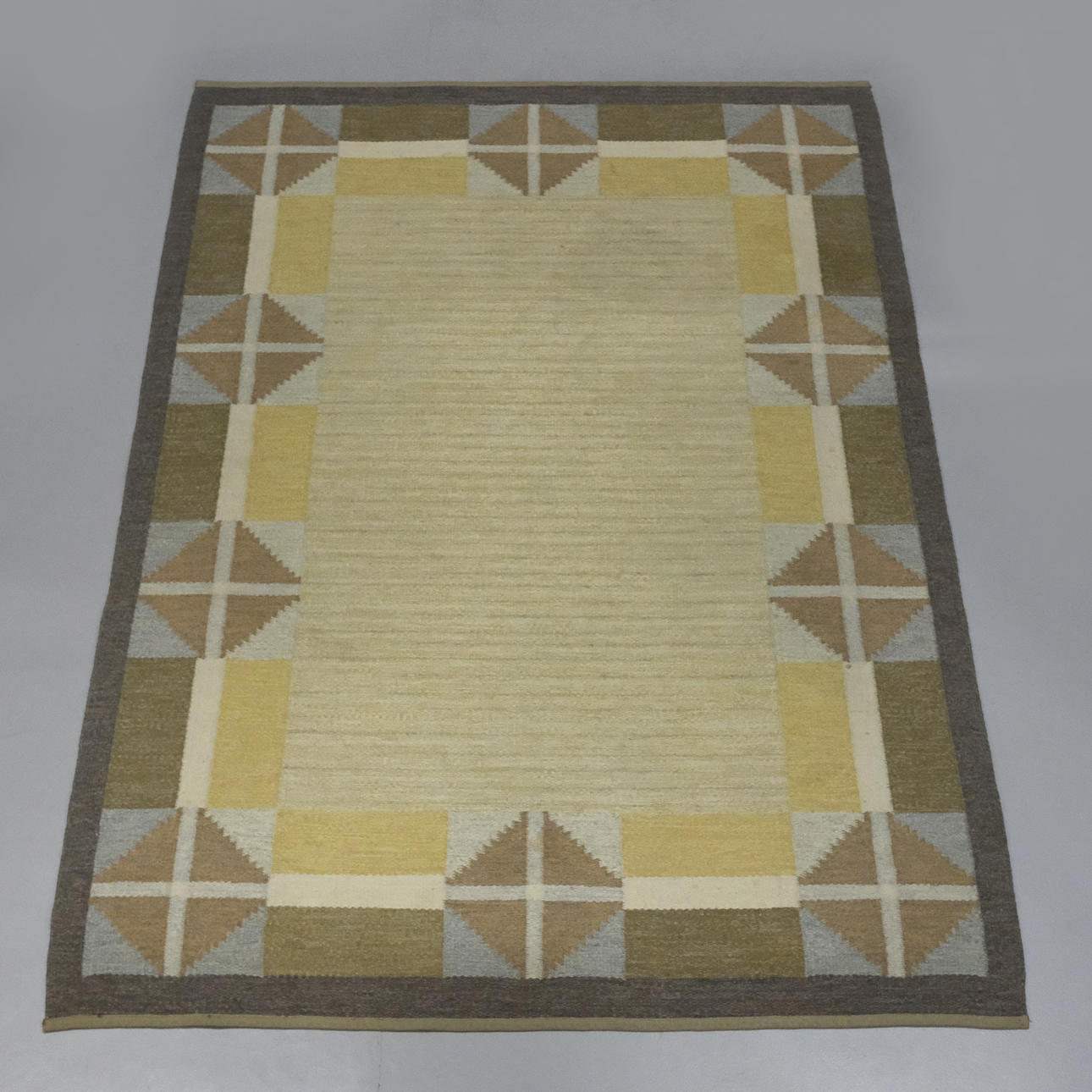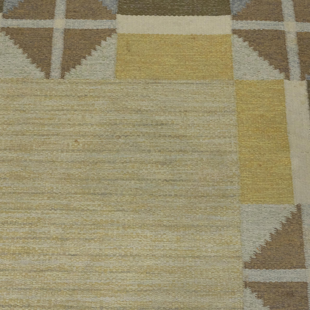 Geometrisk indretning i gule, brune og blå toner, anden halvdel af det 20. århundrede, kortsider med stofkanter, 245x165 cm.