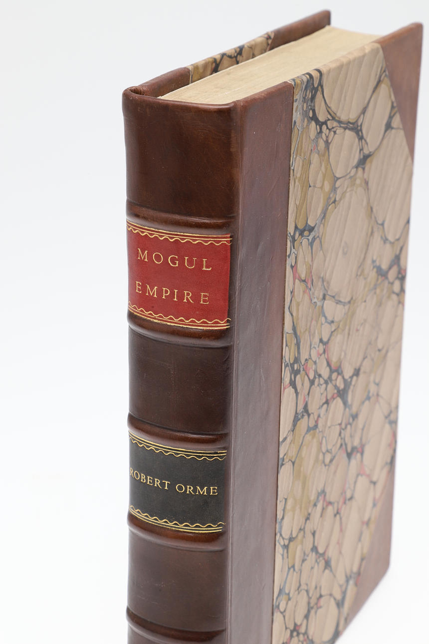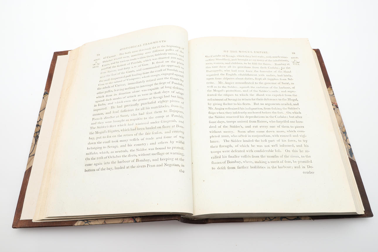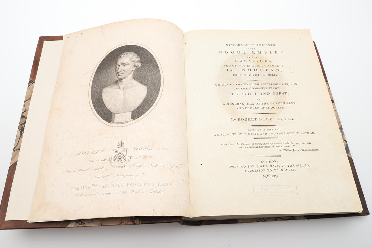 Robert Orme. Historiske fragmenter af Mogulimperiet, af Morattoerne og af de engelske koncerner i Indostan, anden udgave, portrætfrontispids, 3 indgraverede kort, 2 foldede, indgraverede portrætter, indgraveret dedikationsvignet, moderne periode halvkalv, 4to, London: F. Wingrave, 1805.