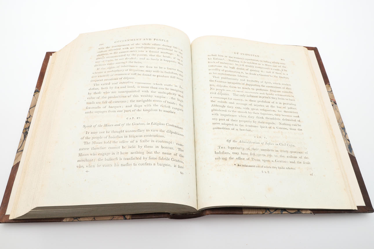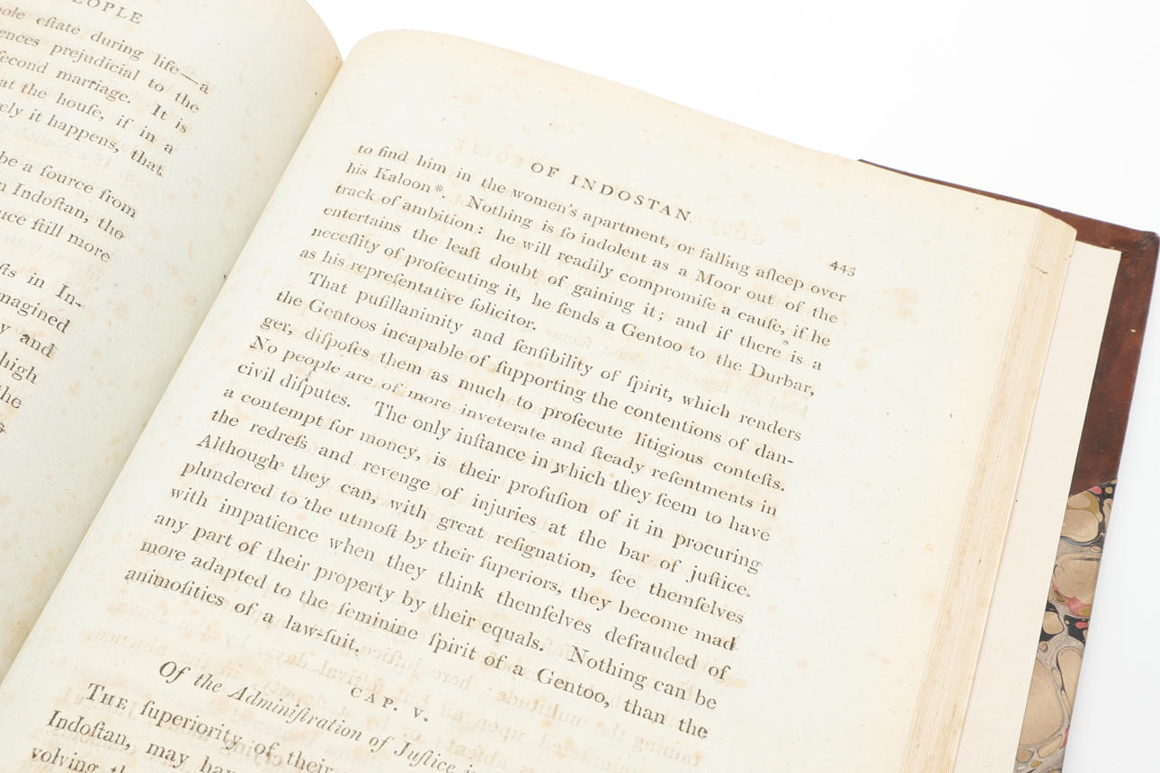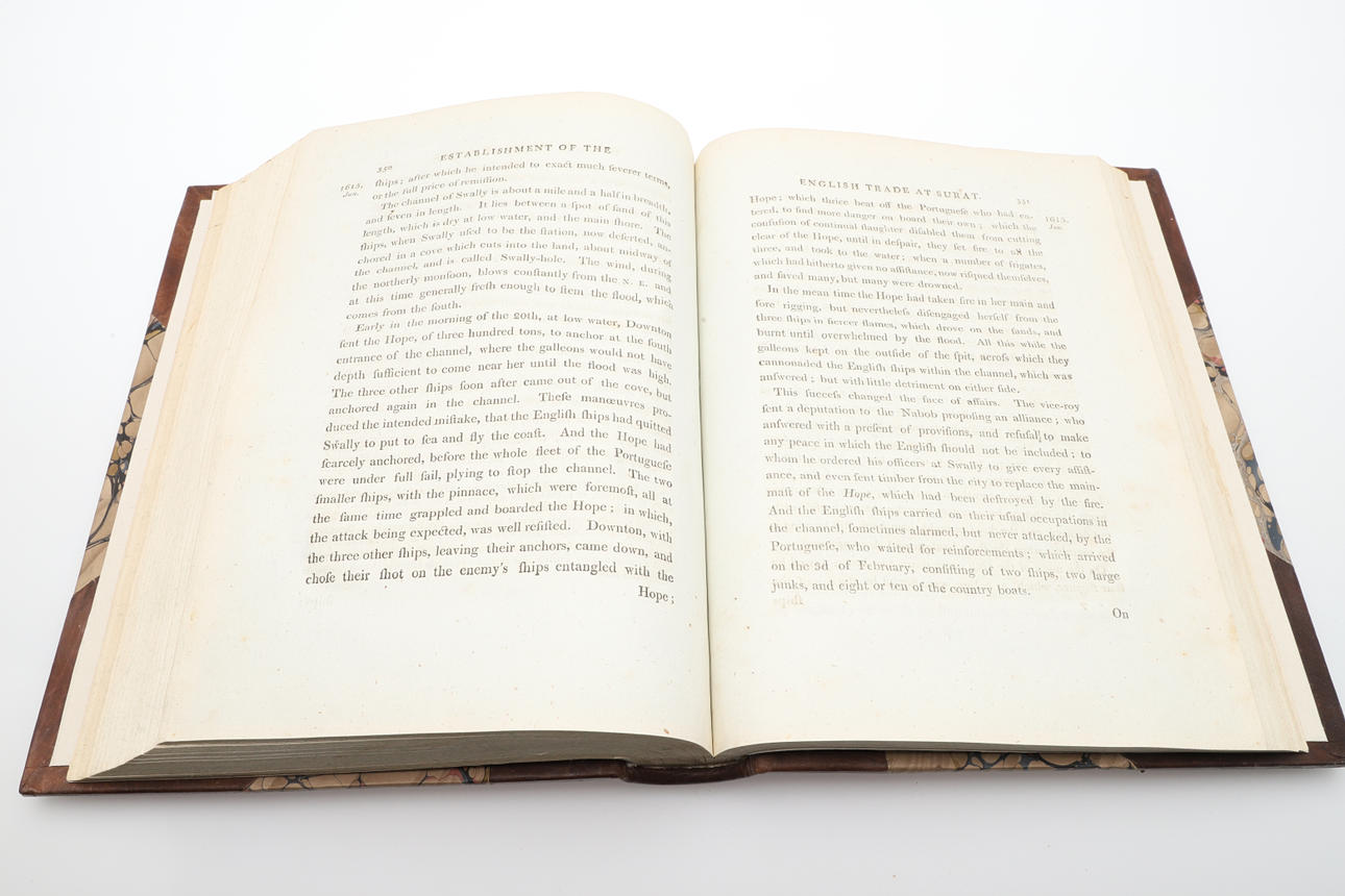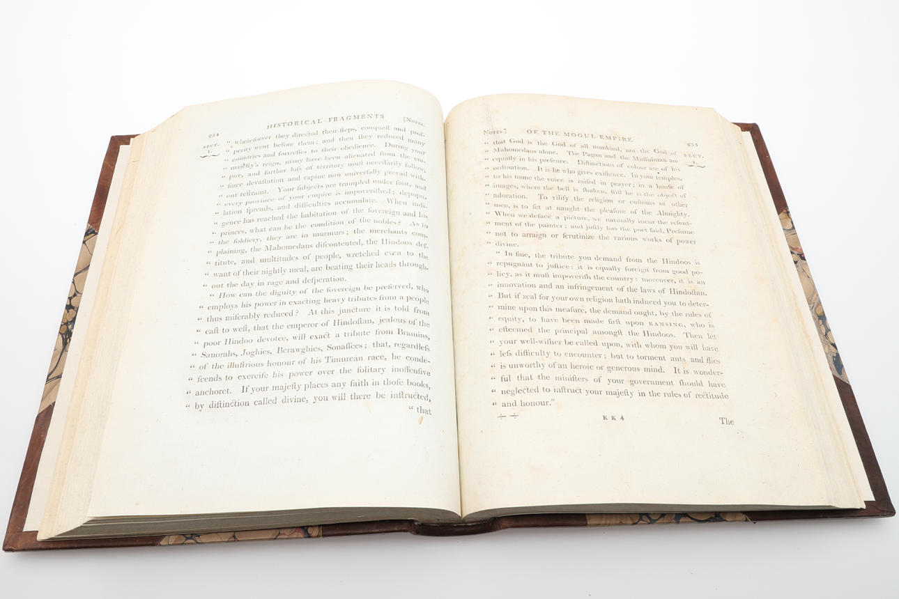 Robert Orme. Historiske fragmenter af Mogulimperiet, af Morattoerne og af de engelske koncerner i Indostan, anden udgave, portrætfrontispids, 3 indgraverede kort, 2 foldede, indgraverede portrætter, indgraveret dedikationsvignet, moderne periode halvkalv, 4to, London: F. Wingrave, 1805.