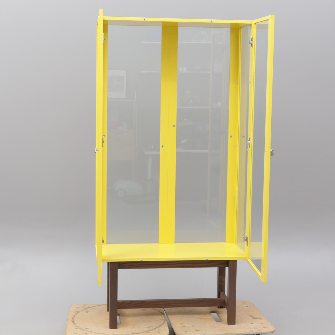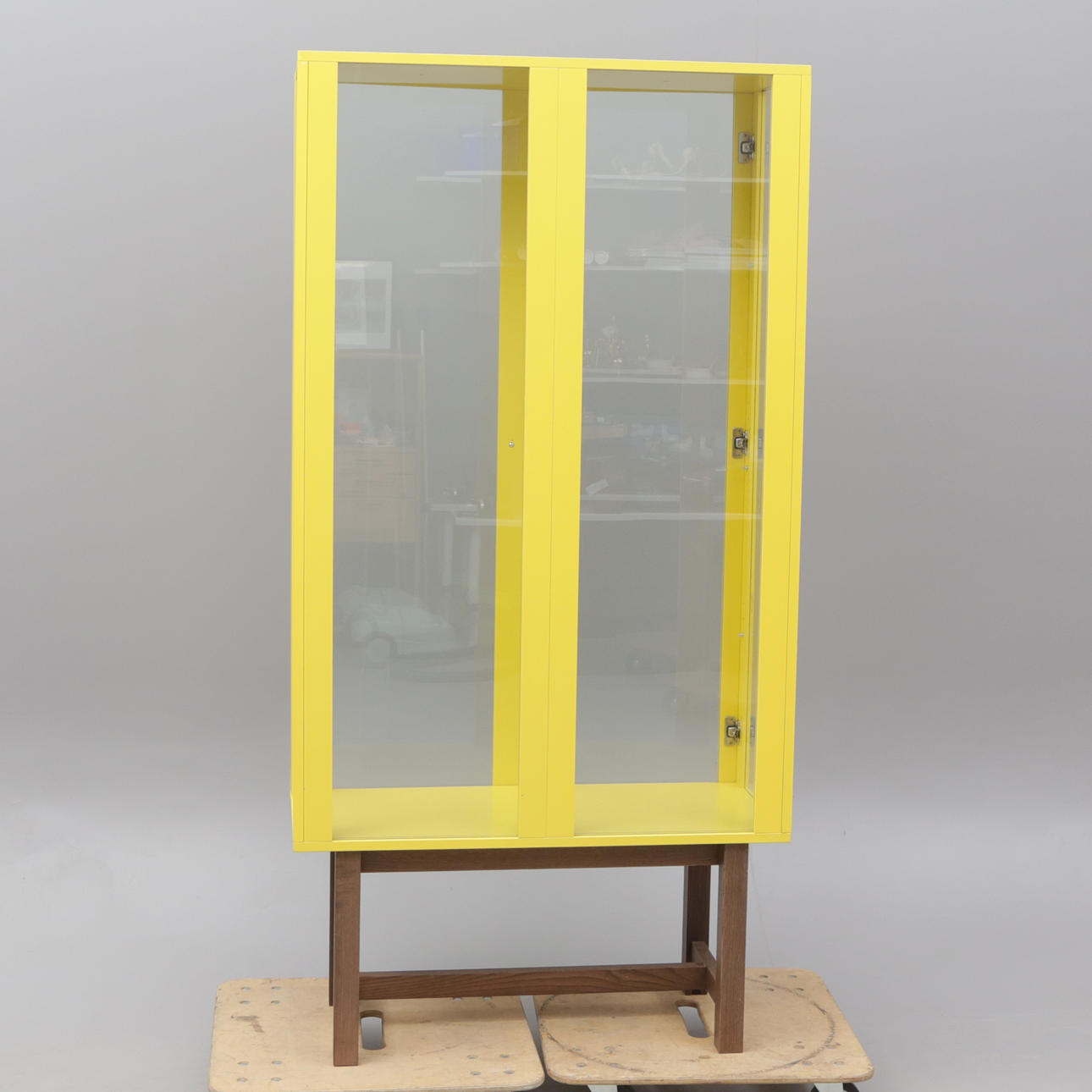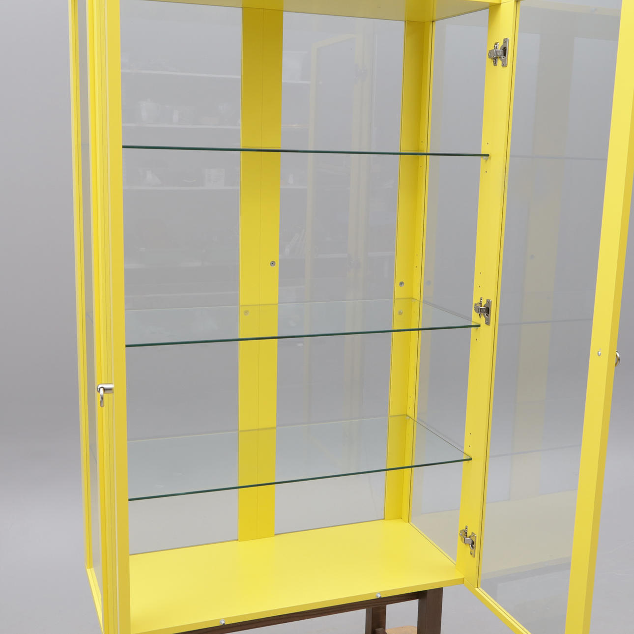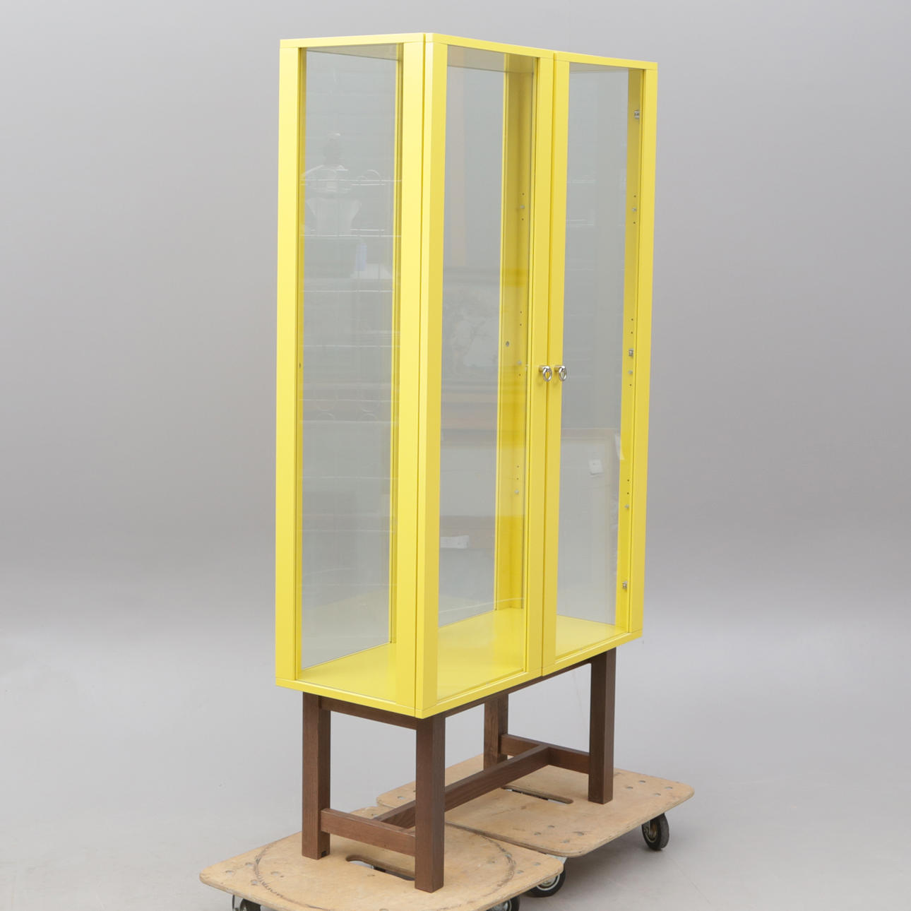 Et glas vitrineskab, Ikea „Stockholm“.