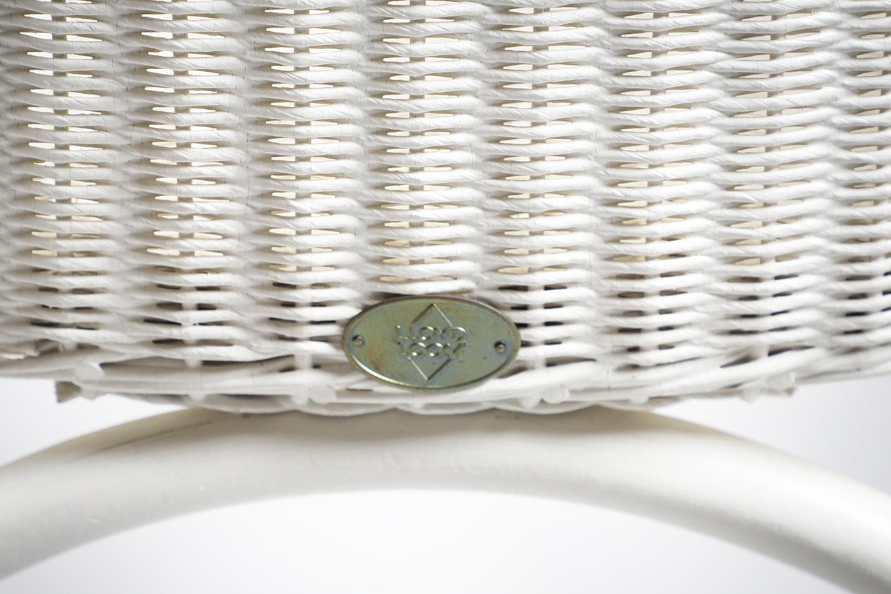 Hvidmalet med producentens etiket på undersiden. Sædehøjde 46cm, Total højde 84.5cm.