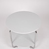 Bord med hvidmalede brædder og stålrørramme på kuglefødder. Diameter 60 cm, højde 60 cm.