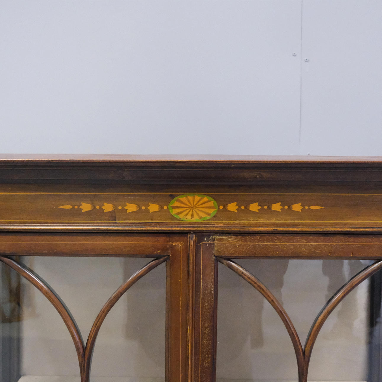Mahogni, intarsia og delvis glasdøre.