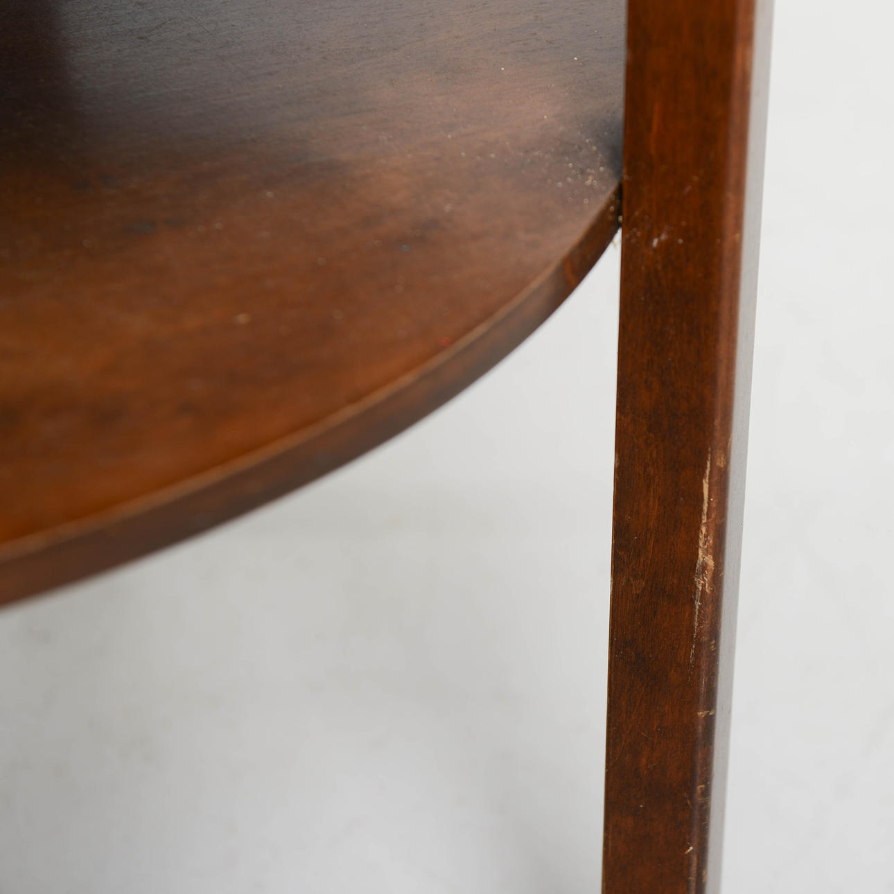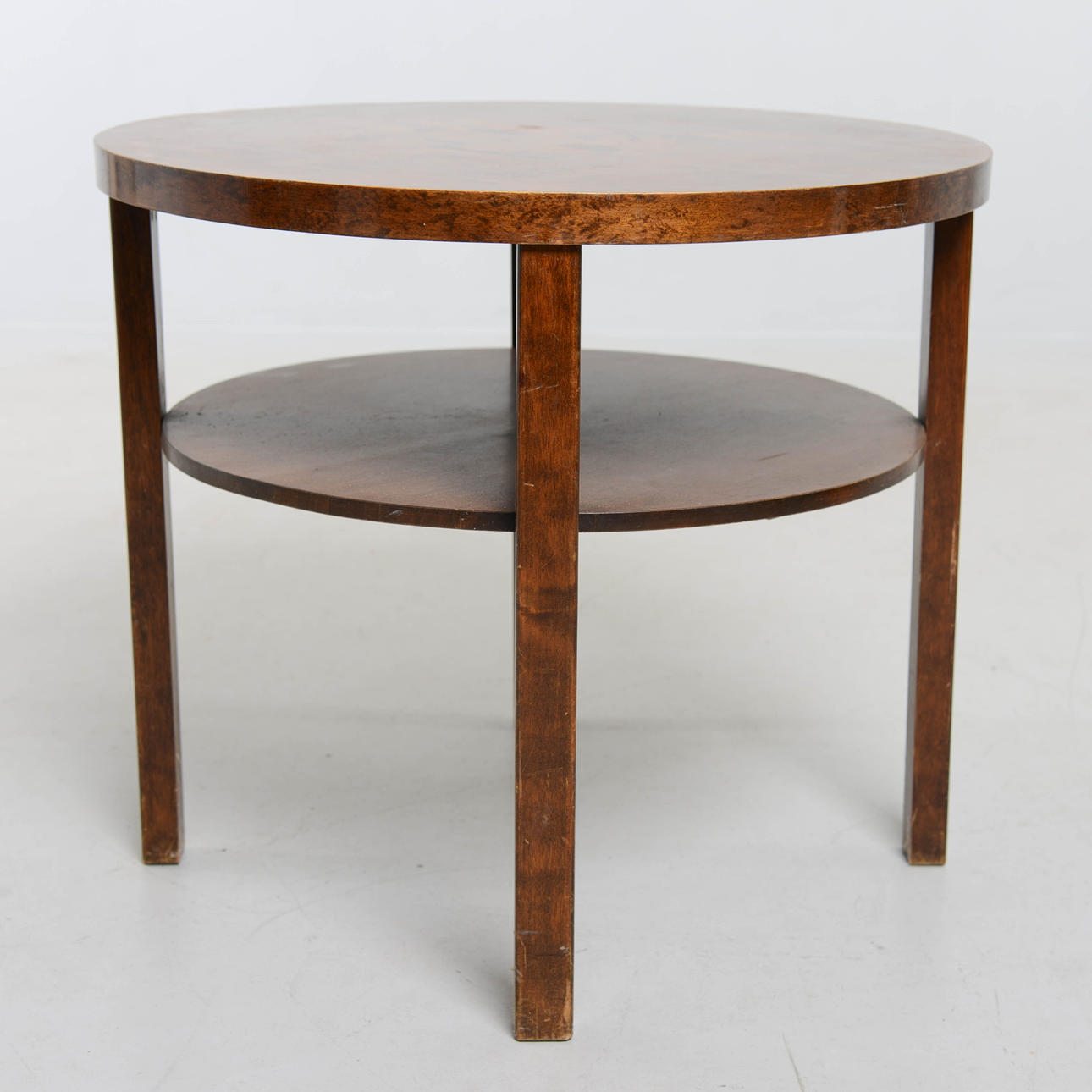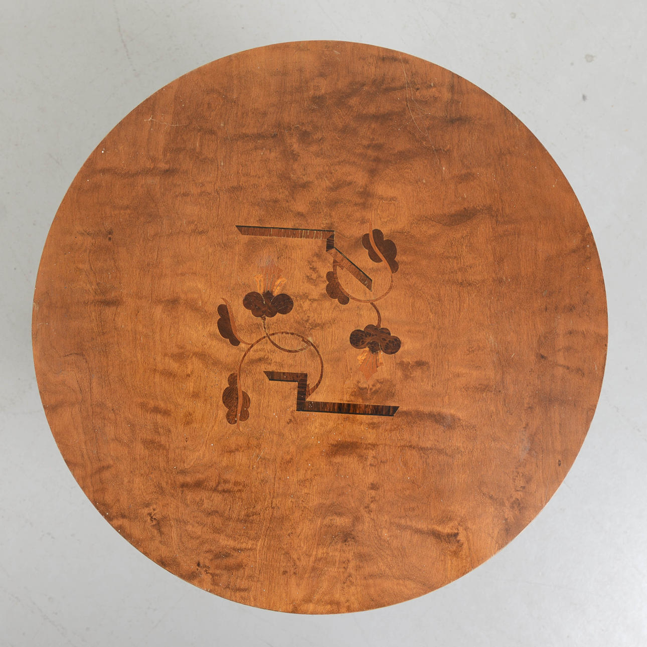 Rundt bord med underliggende hylde, top med intarsia-indretning.