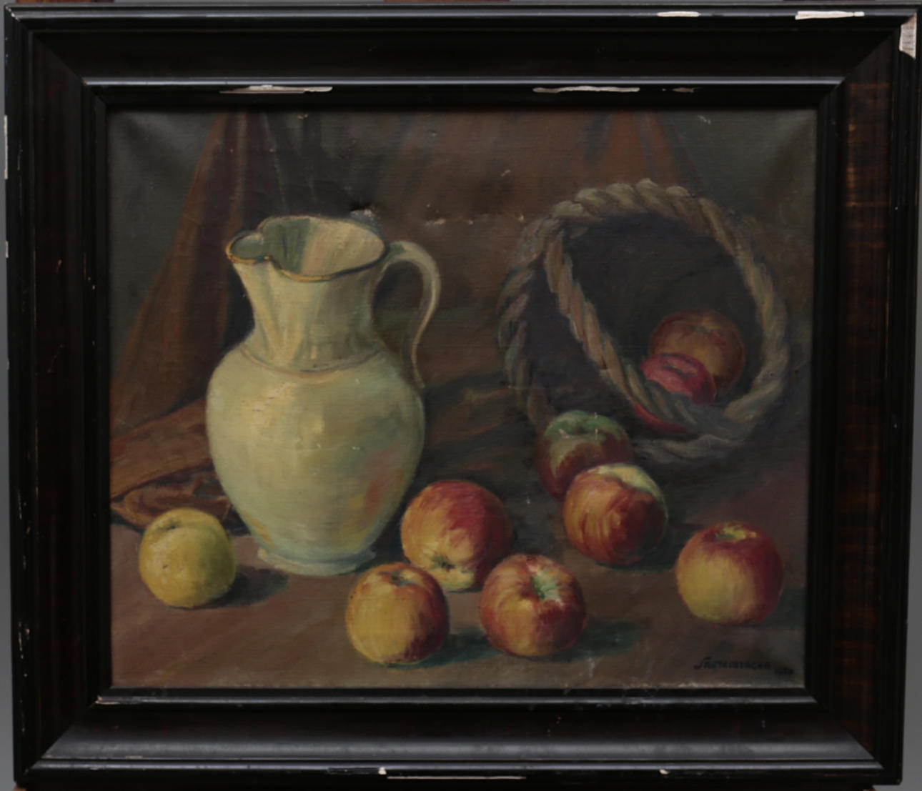 Overflade snavs og beskadigelse af understøtningen. Træramme malet med fejl.