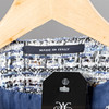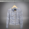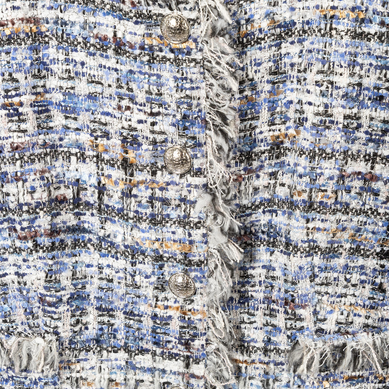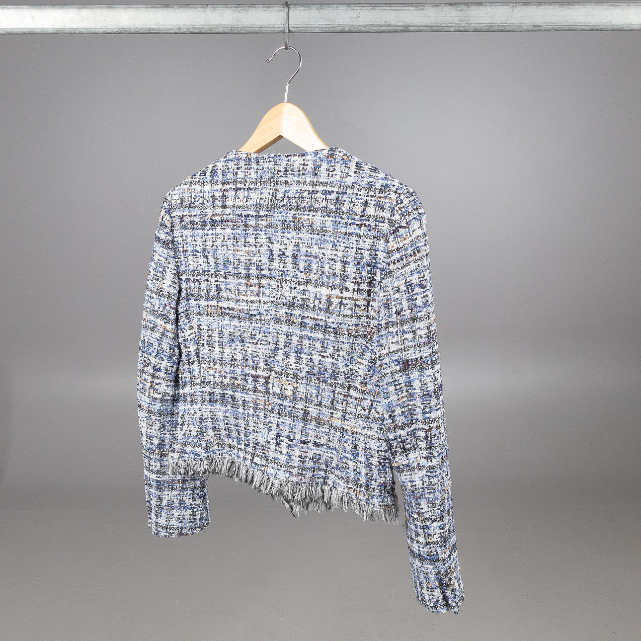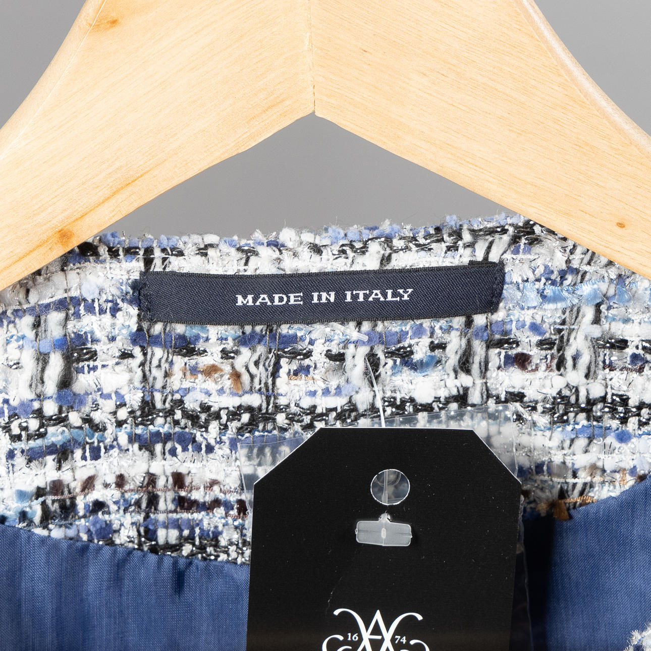 Jakke i blå toner med antydninger af sølv. Hvide metalknapper foran, indvendig blå polyesterforing. Mærket MADE IN ITALY.