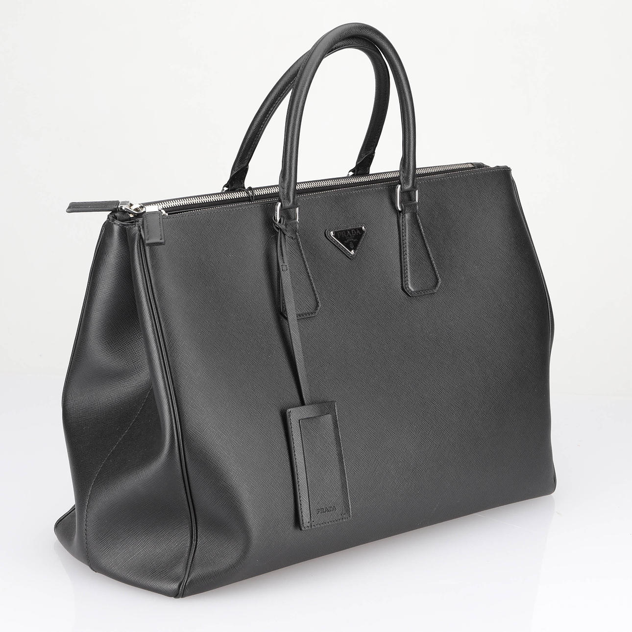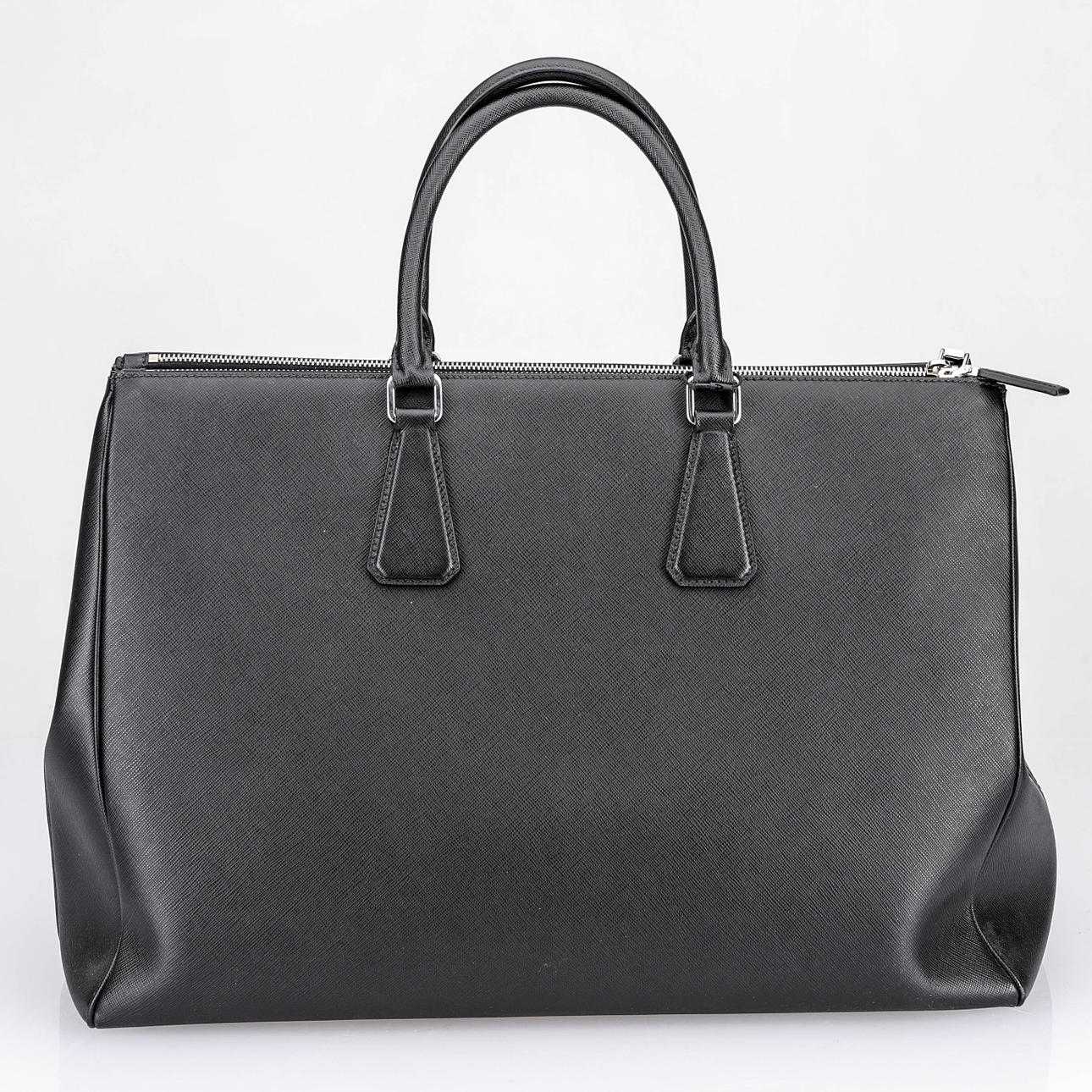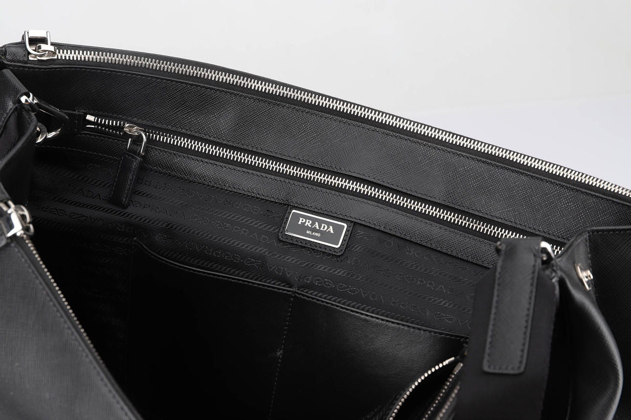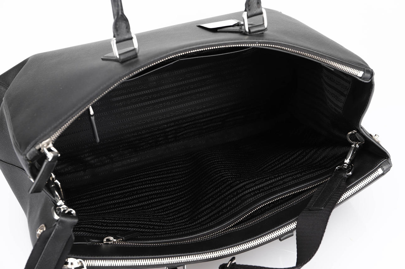 Sort saffino læder. Detaljer i sølvfarvet metal. Tre rum, hvoraf to med lynlås. Tekstil skulderrem. Adressemærke. Indvendigt fire lommer, hvoraf to med lynlås. Mærket Prada Milano. Certifikater.