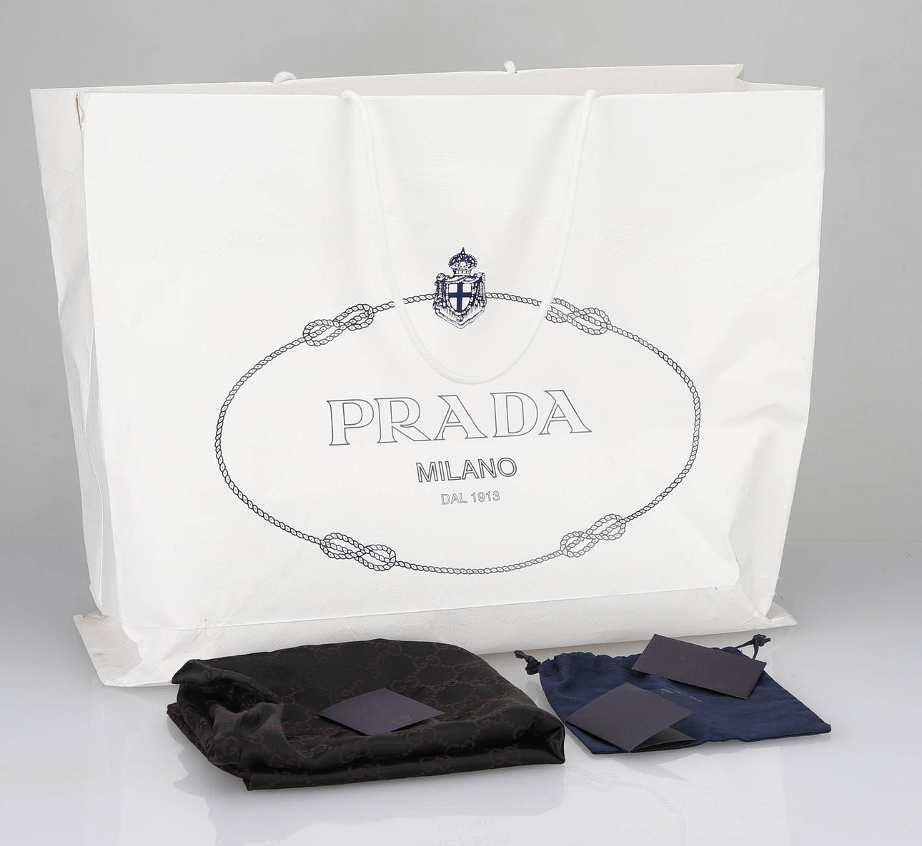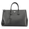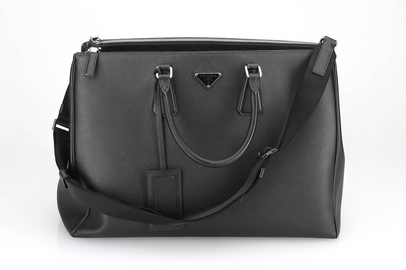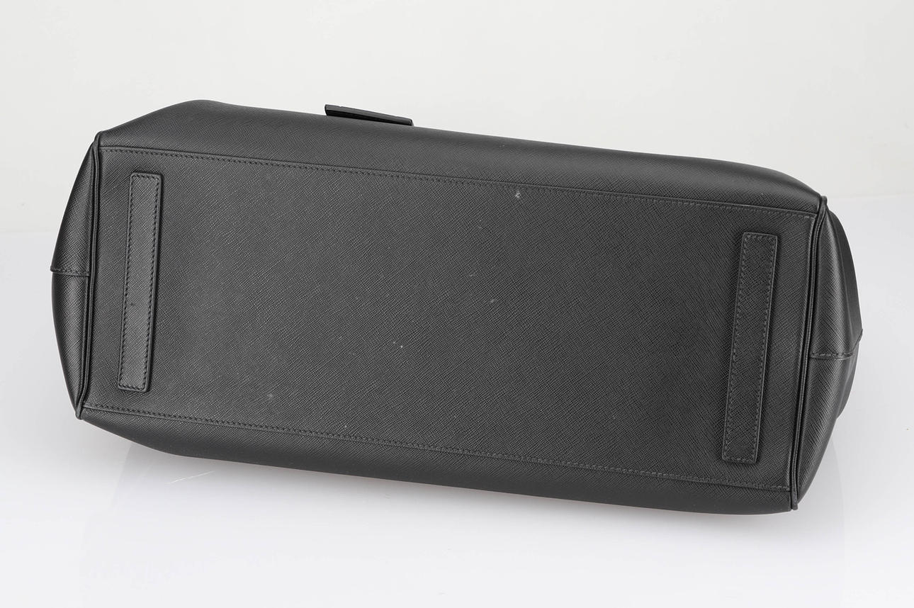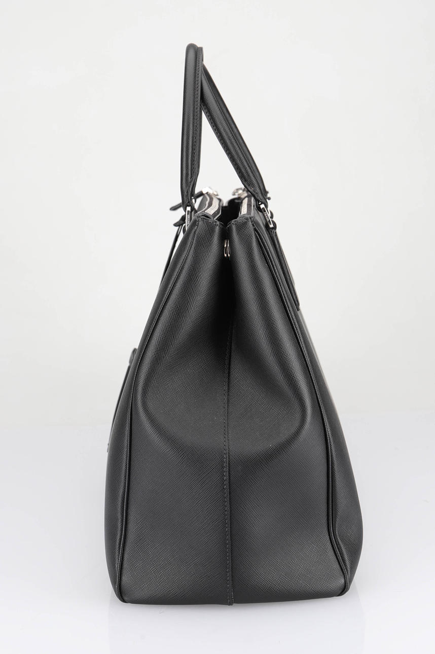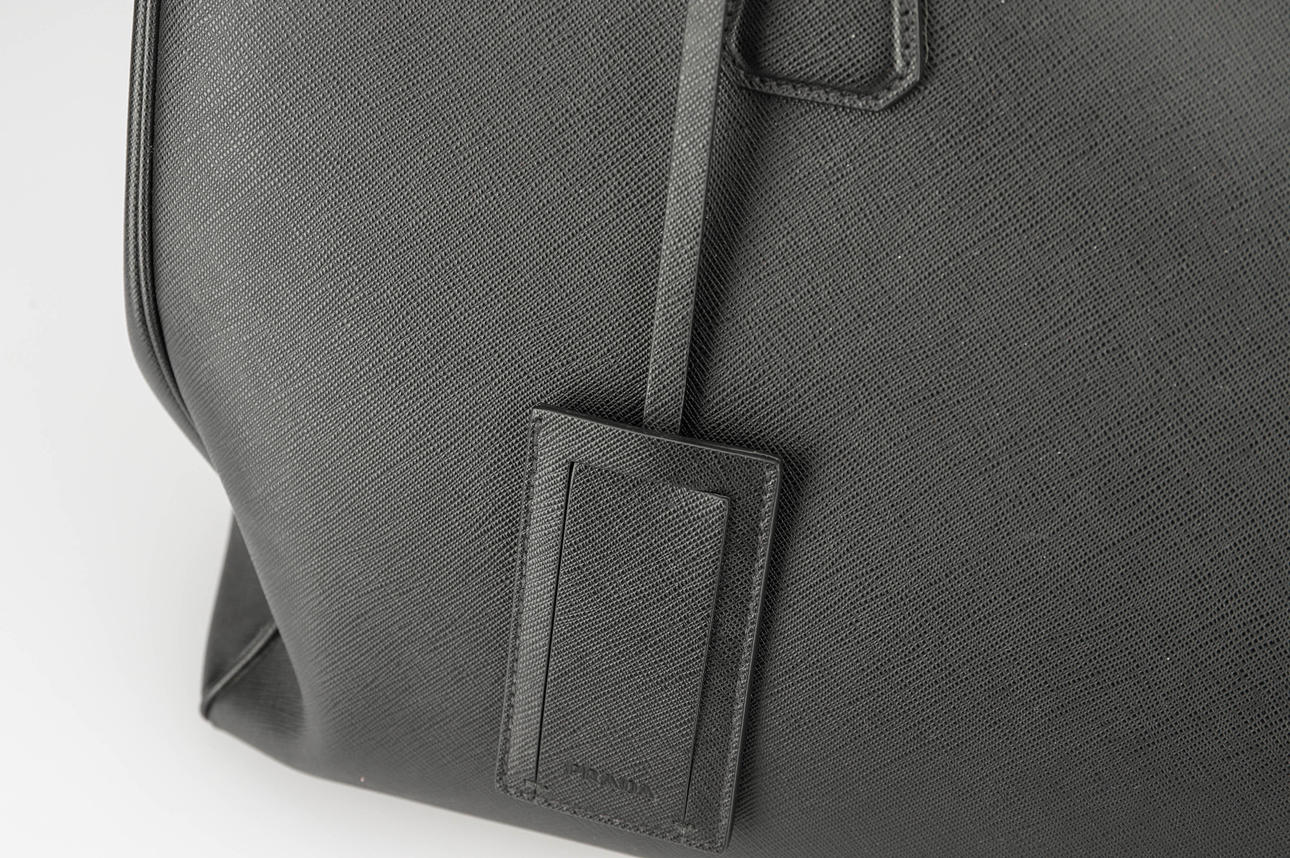 Sort saffino læder. Detaljer i sølvfarvet metal. Tre rum, hvoraf to med lynlås. Tekstil skulderrem. Adressemærke. Indvendigt fire lommer, hvoraf to med lynlås. Mærket Prada Milano. Certifikater.