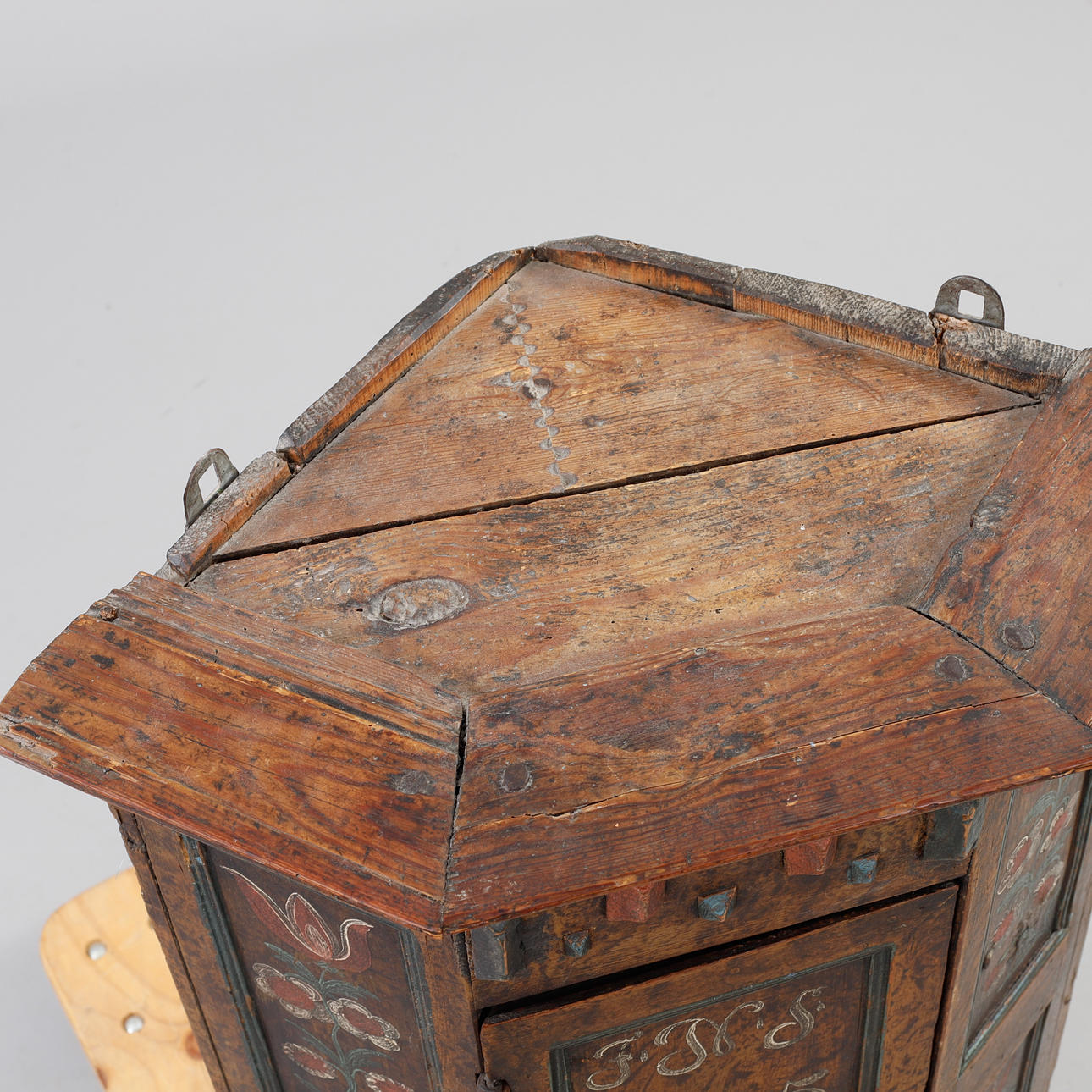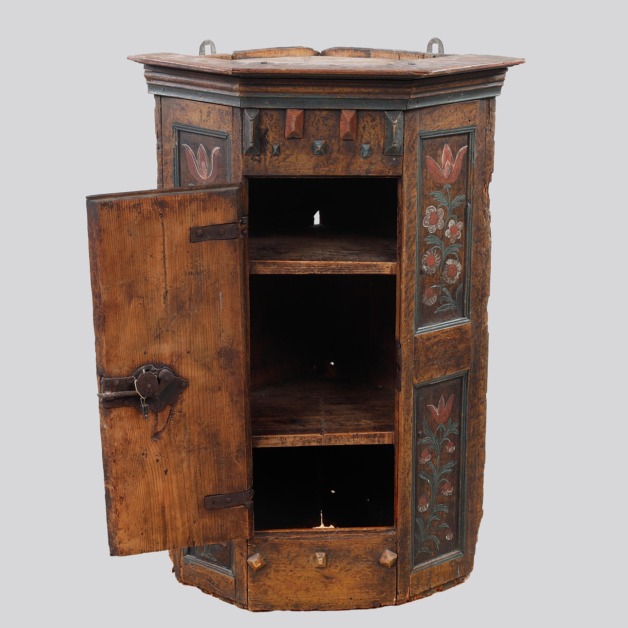 Hjørneskab, malet træ, jernbeslag. Højde ca. 95, bredde ca. 64, dybde ca. 40 cm.