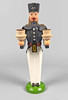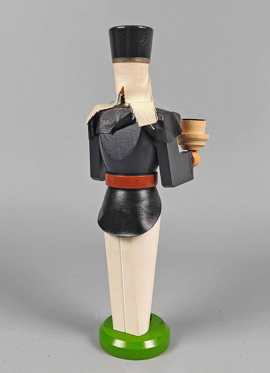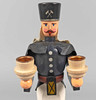 Trædrejet, udskåret og malet i farve, minearbejder i klassisk uniform af Erzbjergene med 2 trælysdyser, stående på en rund base, højde ca. 23 cm, håndlavet, Erzgebirge.