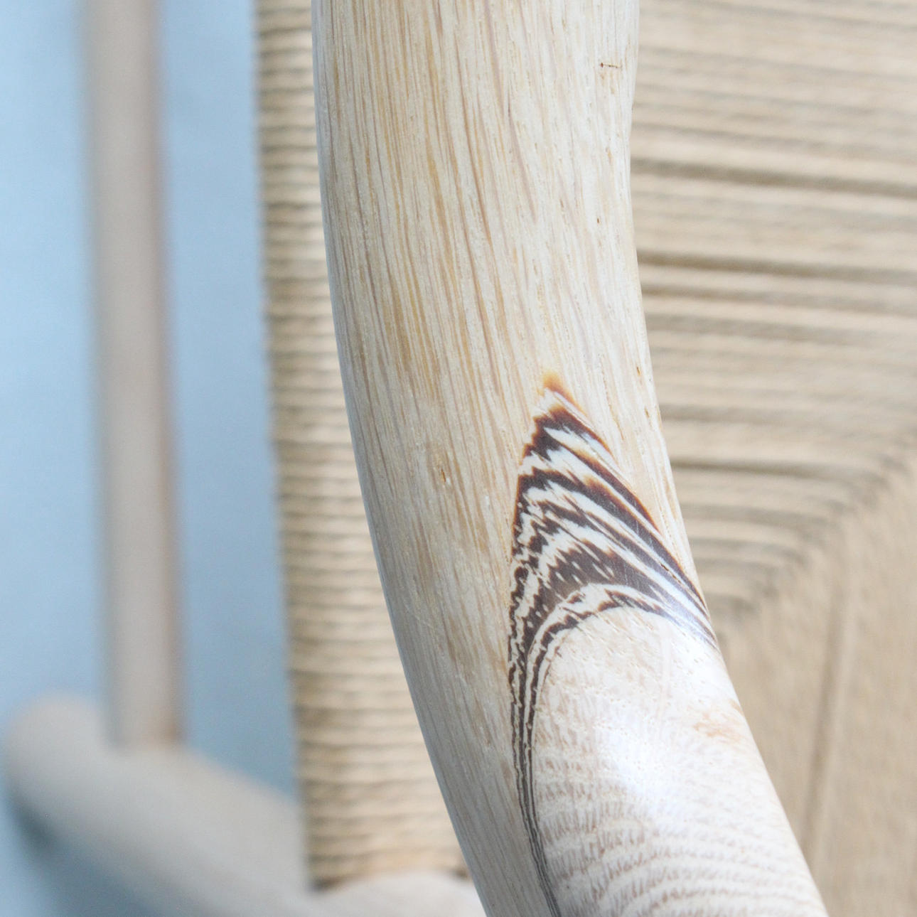 spisestuestol med en asketræramme med afrundet ryglæn og et kurvesæde, med producentens navn på undersiden,