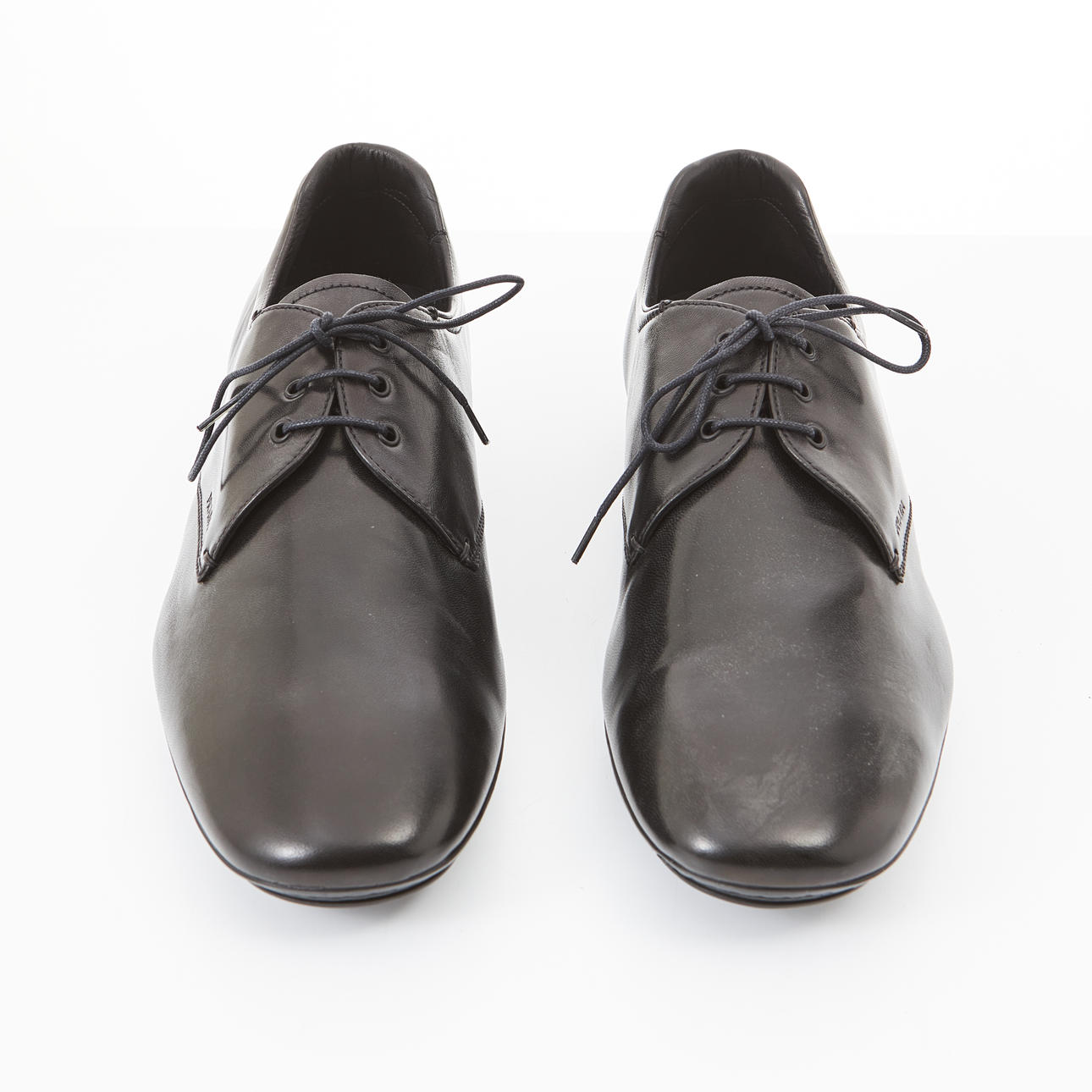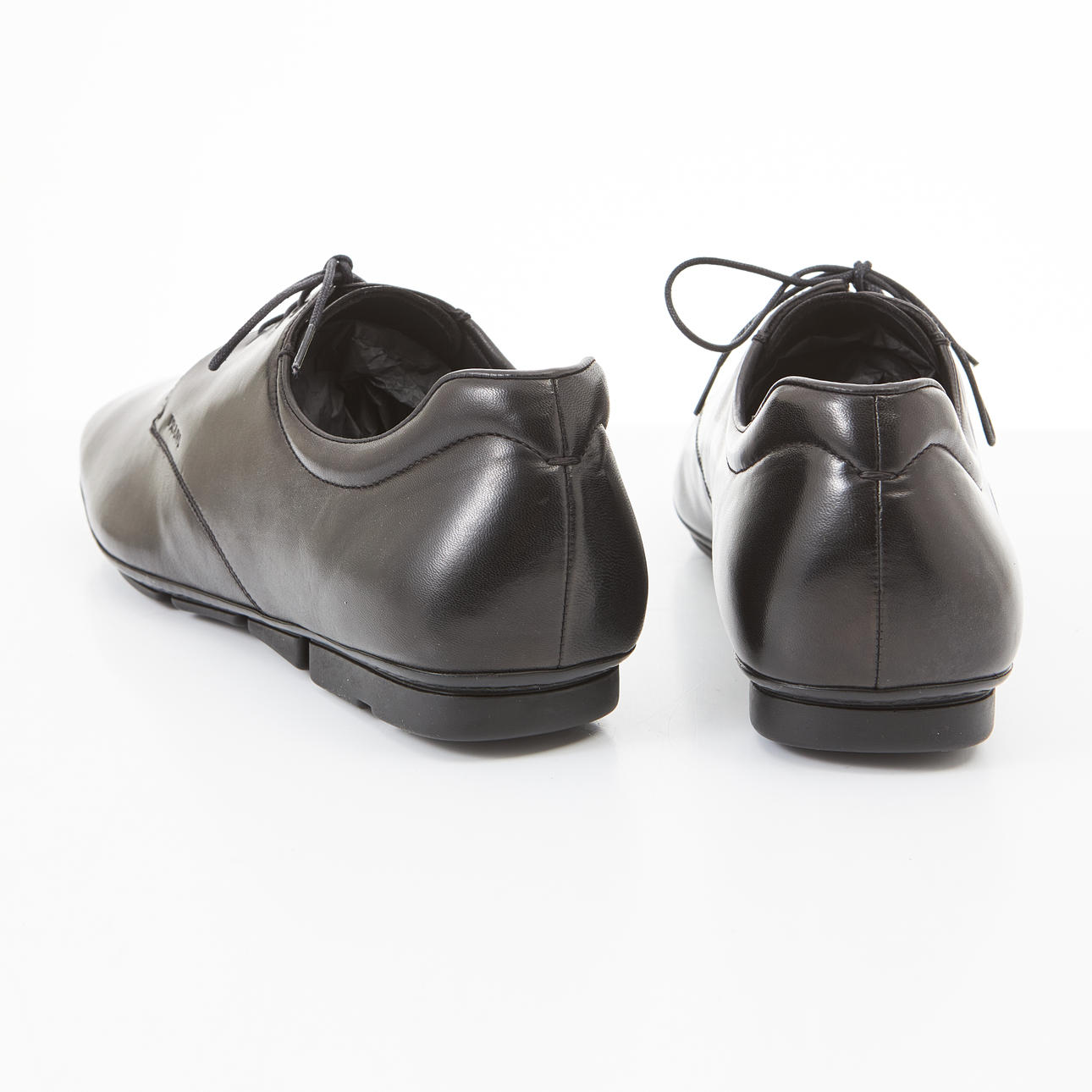 Sko i sort nappa læder, lav sål i sort gummi, mærket „Prada“, str. 10, medfølger skopose og skoæske, kartonmål ca. 13,35x21cm.