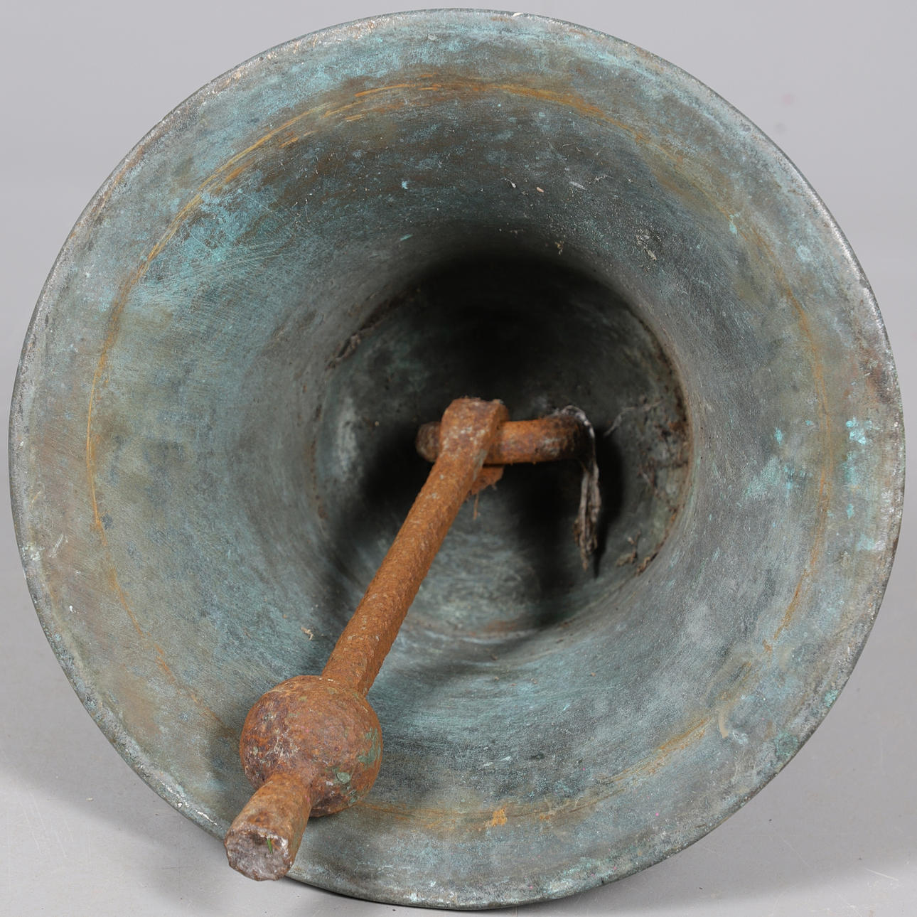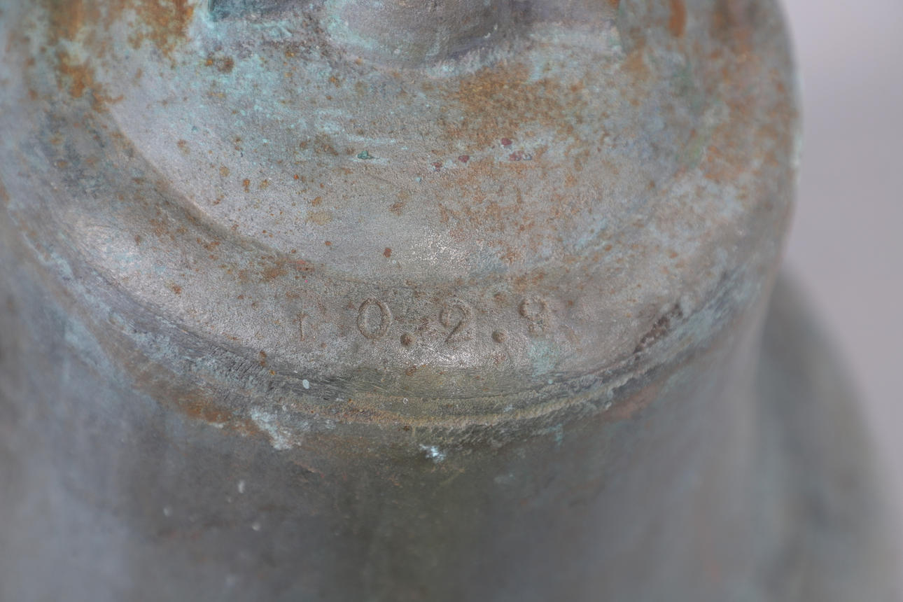 En stor skoleklokke i bronze, med en imponeret dato (muligvis 10.2.9), og med sin klapper. 39 cm høj.