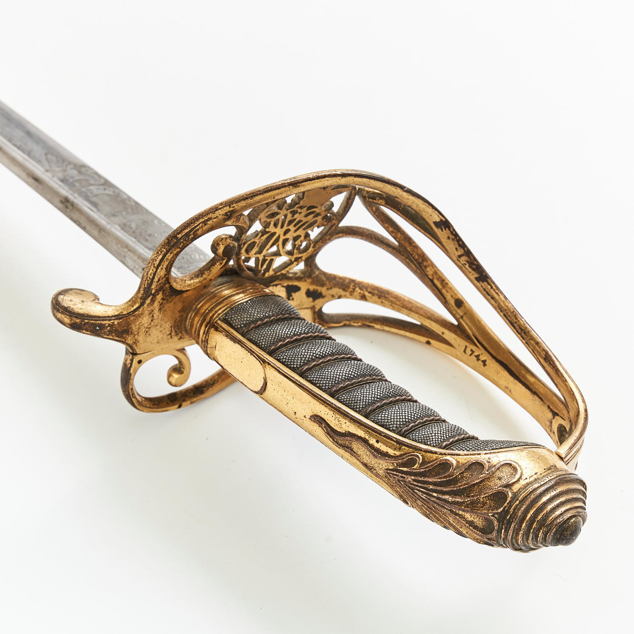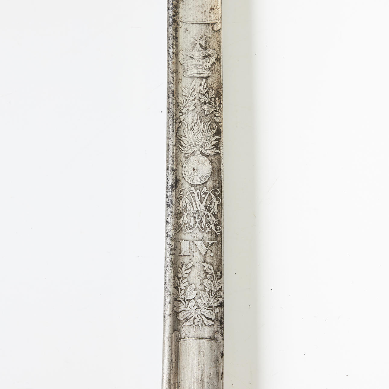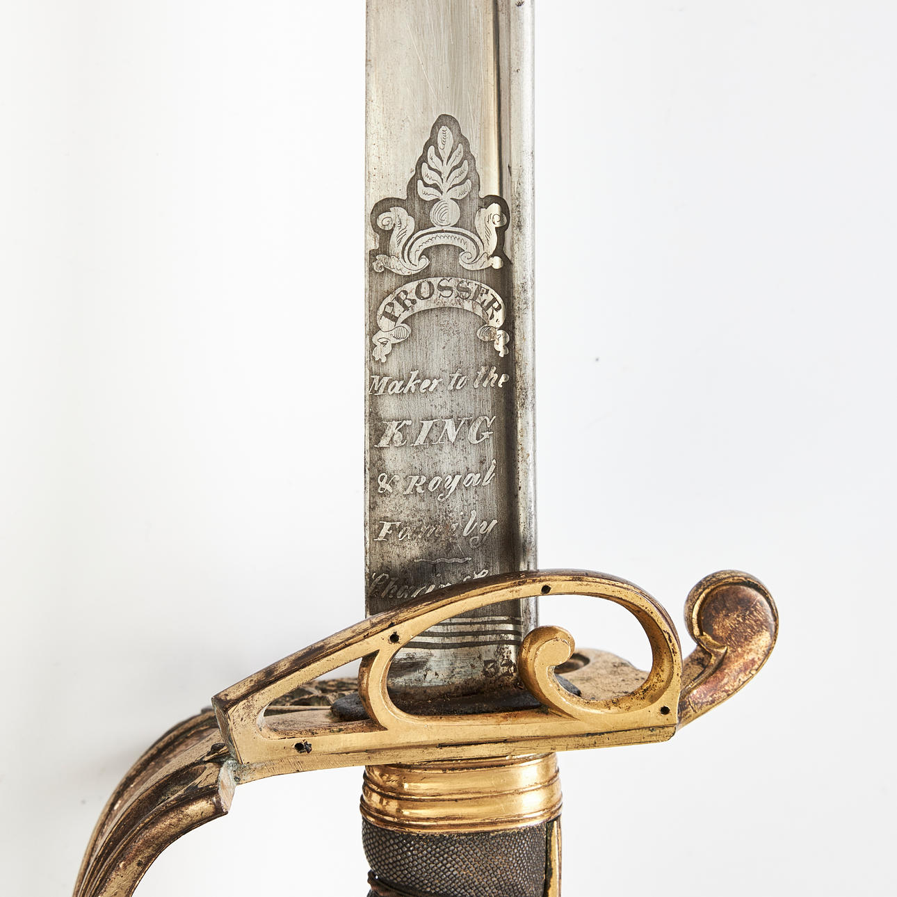 Bladet med William IV's monogram. Mærket „Prosser maker to the King & Royal family London“ Beslag af forgyldt messing med kongens monogram. Det indre af parerpladen er foldbart.