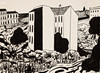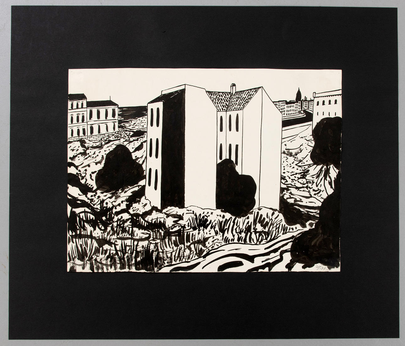 Werner Heldt (1904-1954), Berlin am Meer, blæktegning, 1949, monogrammet og dateret med blyant nederst til højre, ca. 36 x 49 cm (arkstørrelse), løst monteret på sort bagplade, med bagplade ca. 60 x 70 cm.