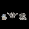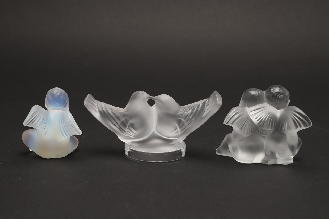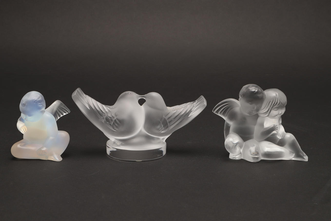 Tre moderne stykker Lalique-glas, herunder 'Lovebirds' (Deux Colombes), de to fugle kysser og på en cirkulær base (15 cm på tværs), 'Twin Angels' (Deux Angelots, 8,5 cm høj) og en figur af en kerub eller engel (7 cm høj). To med kasser. (3).