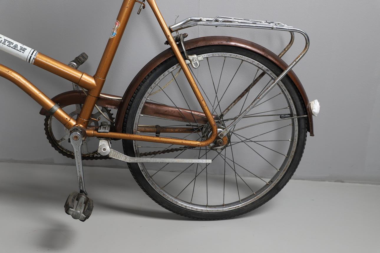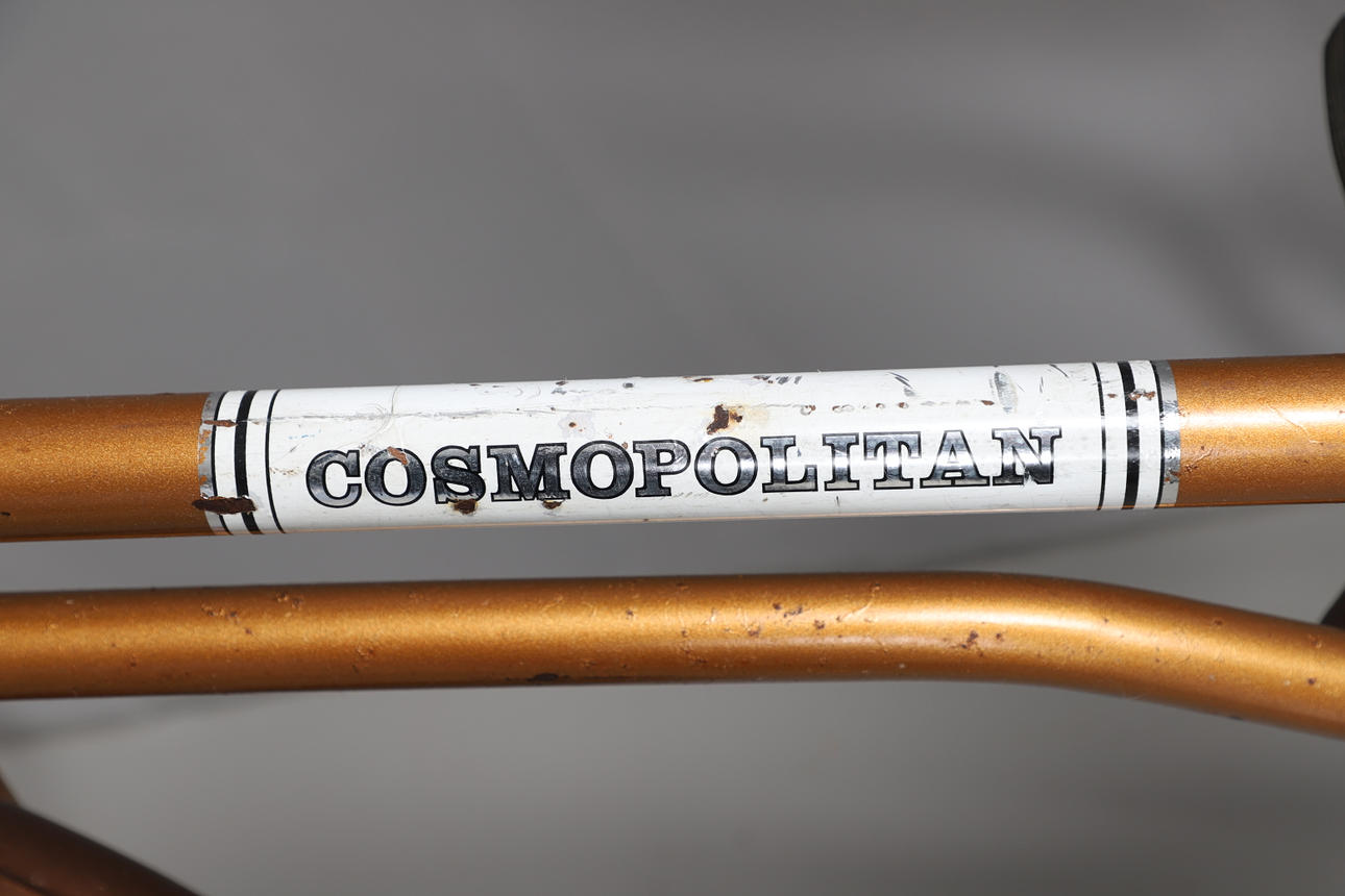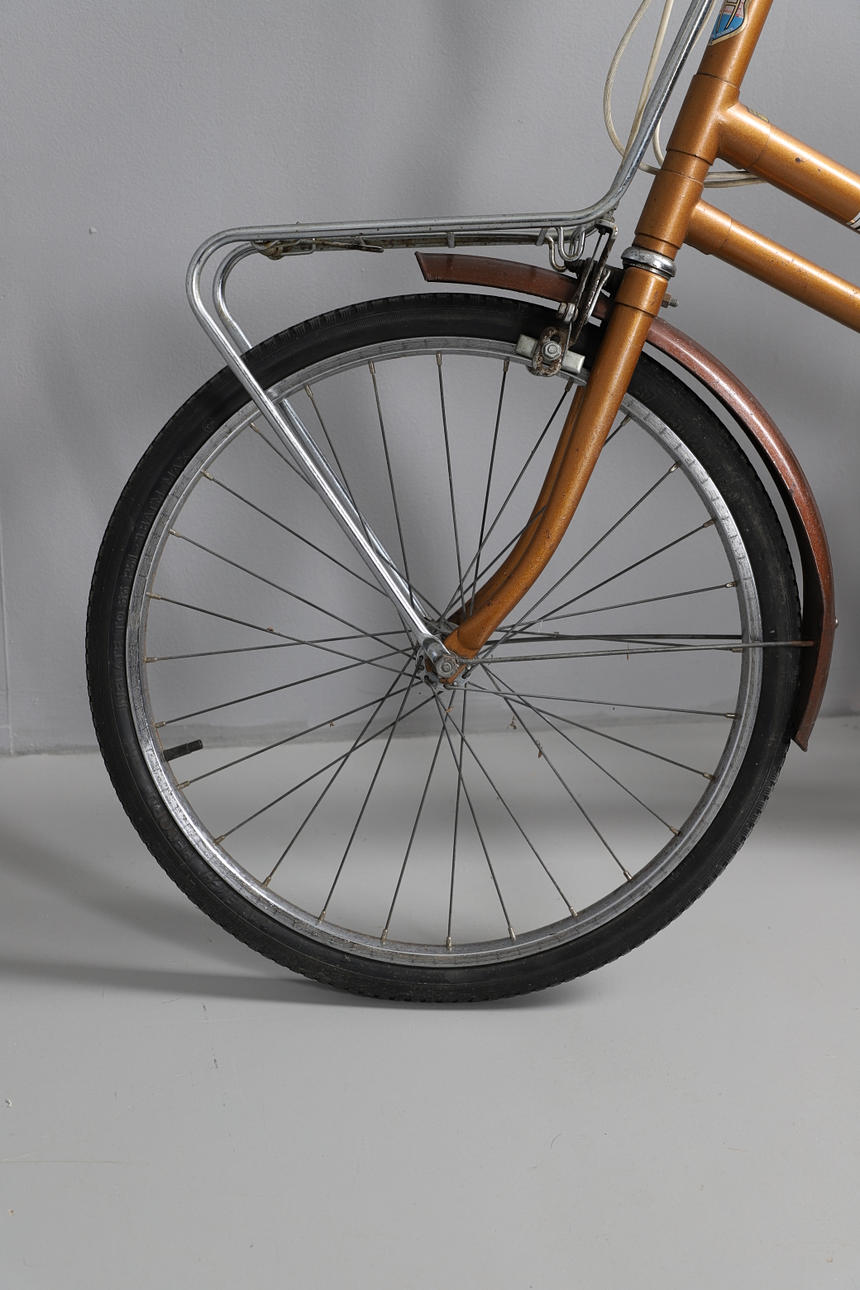 Bronze i farve, Rammestørrelse er 46 cm, hjuldiameter 18 tommer. Forhandlermærke for Castle Street Cycles, Trowbridge. Klokke og bagagestativ fastgjort.