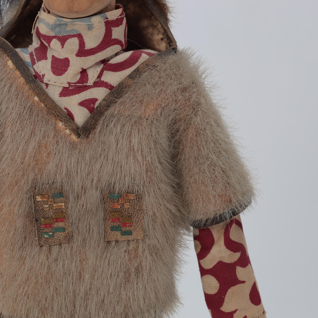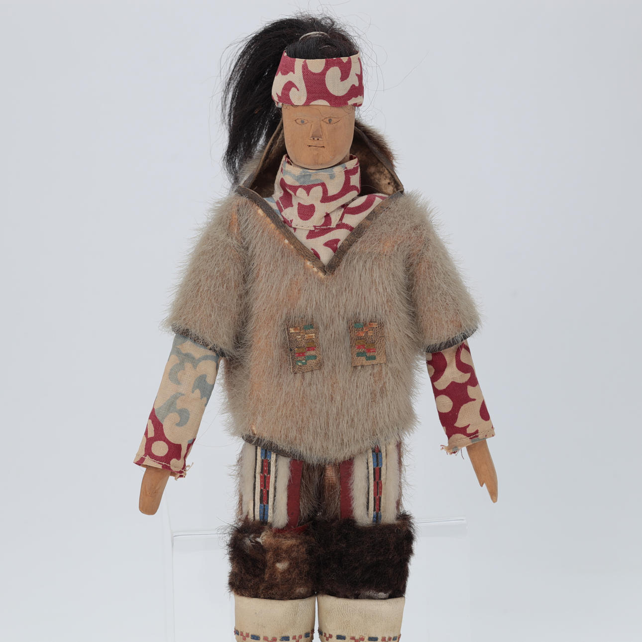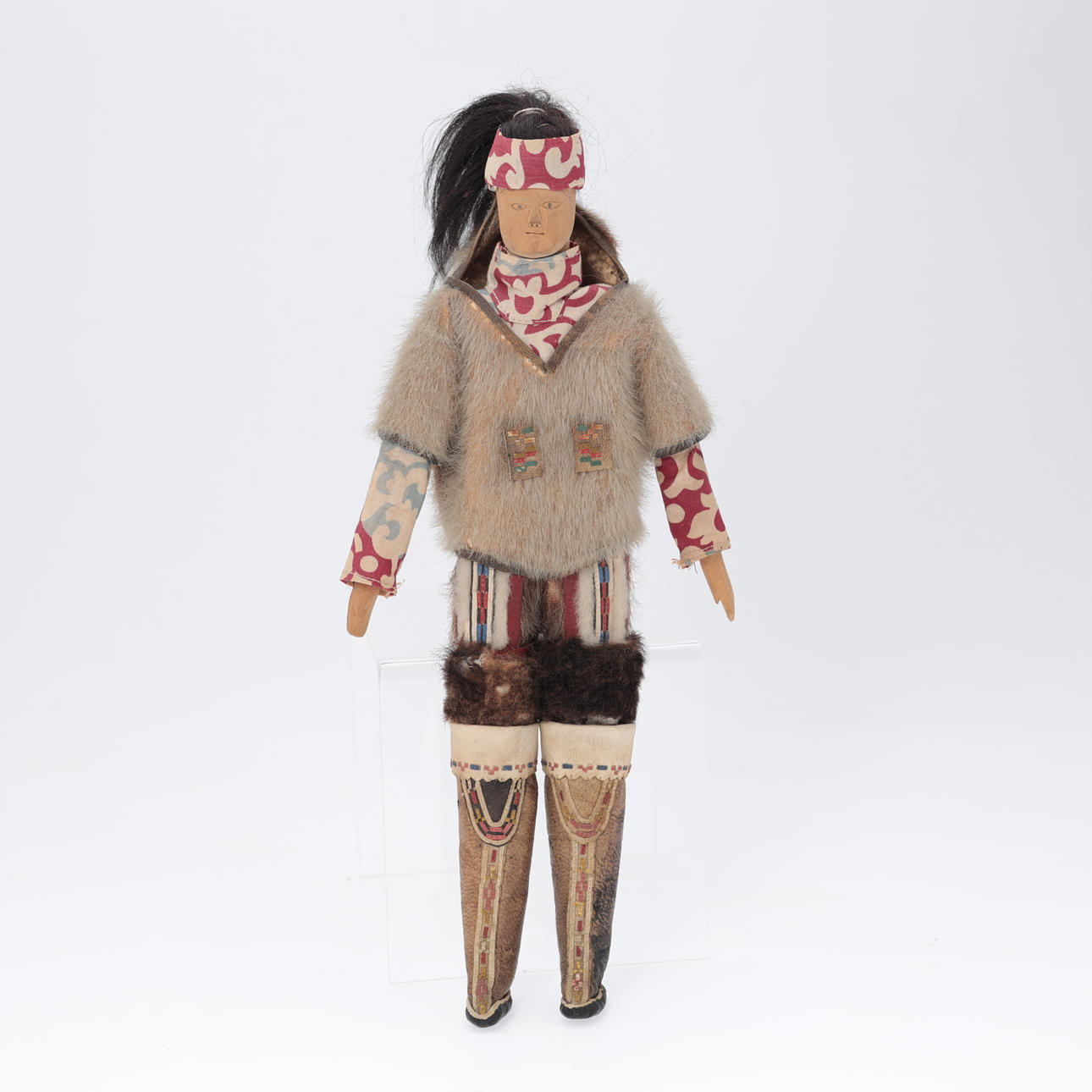 Dukke af træ iført grønlandsk dragt med sælskindsbukser, kamikker af sælskind , H. 34 cm.