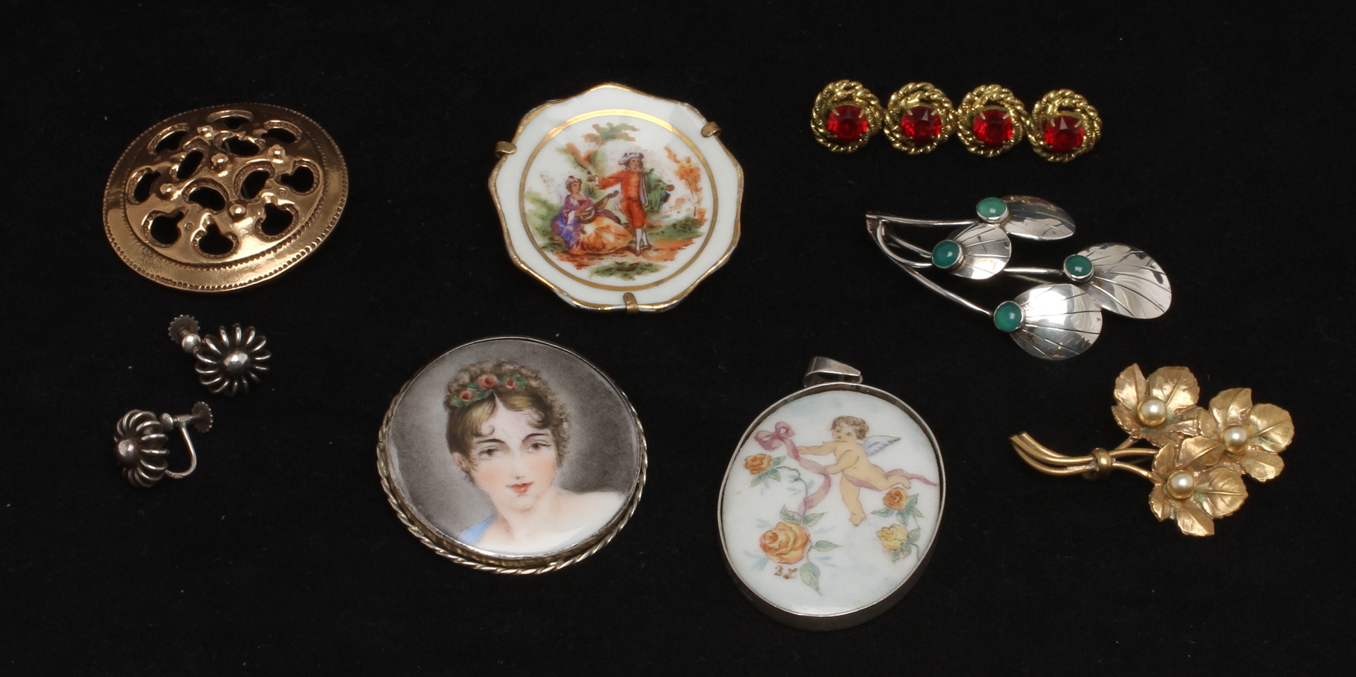 39954. SMYKKER, 8 dele, delvist sølv, 20. århundrede.