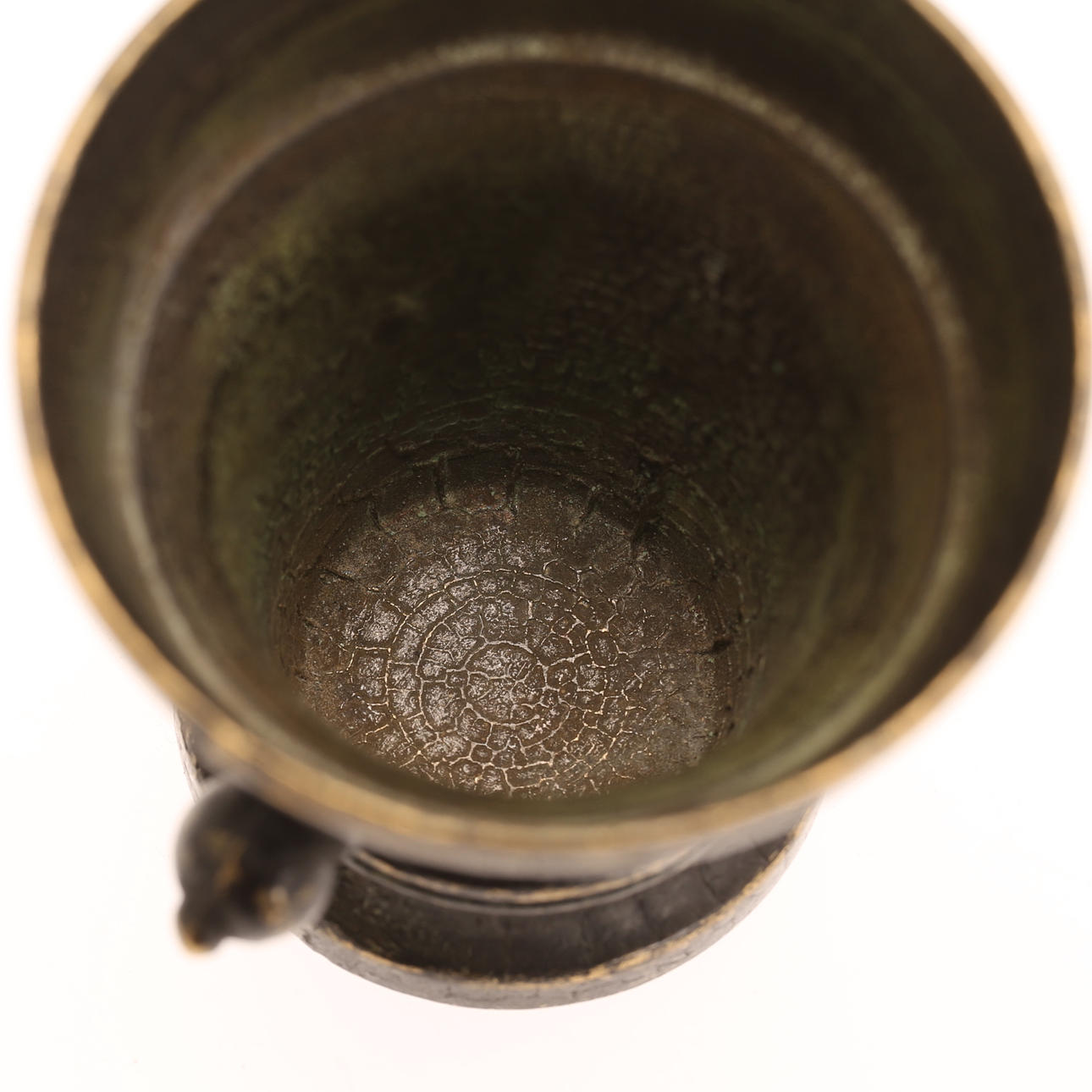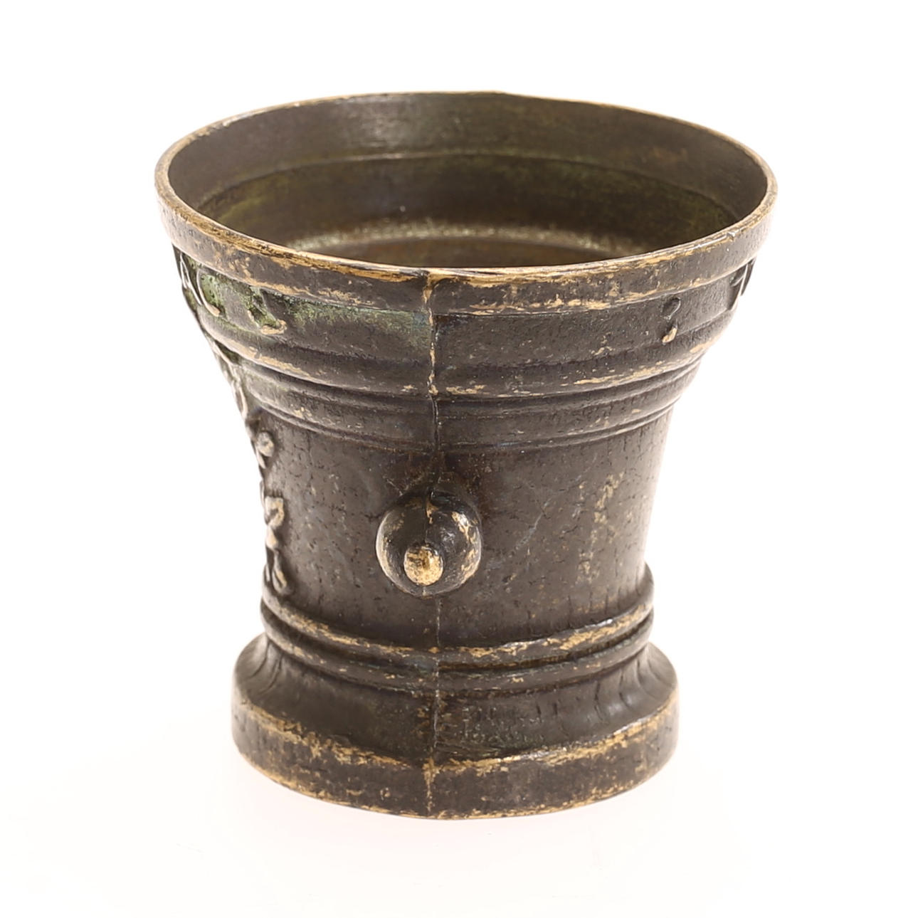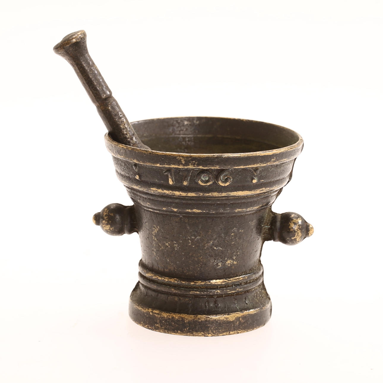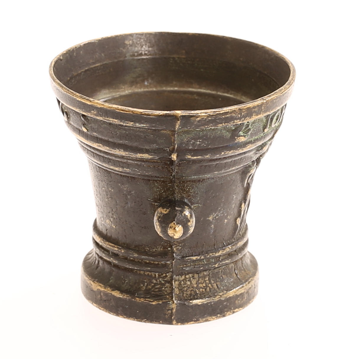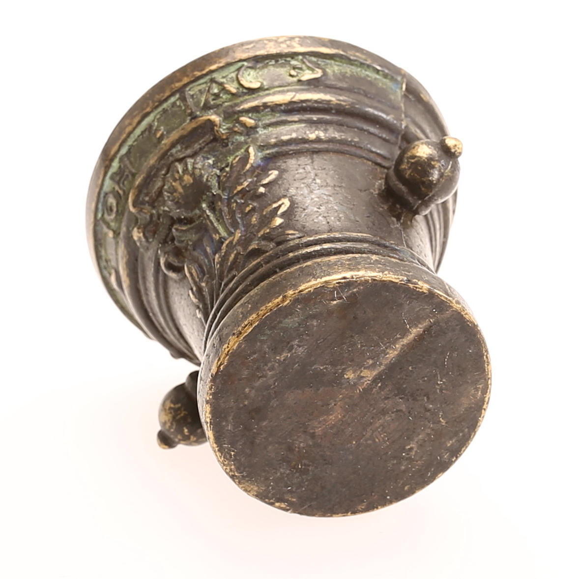 4001778. MORTEL med støder, miniature, bronze, dateret 1706.