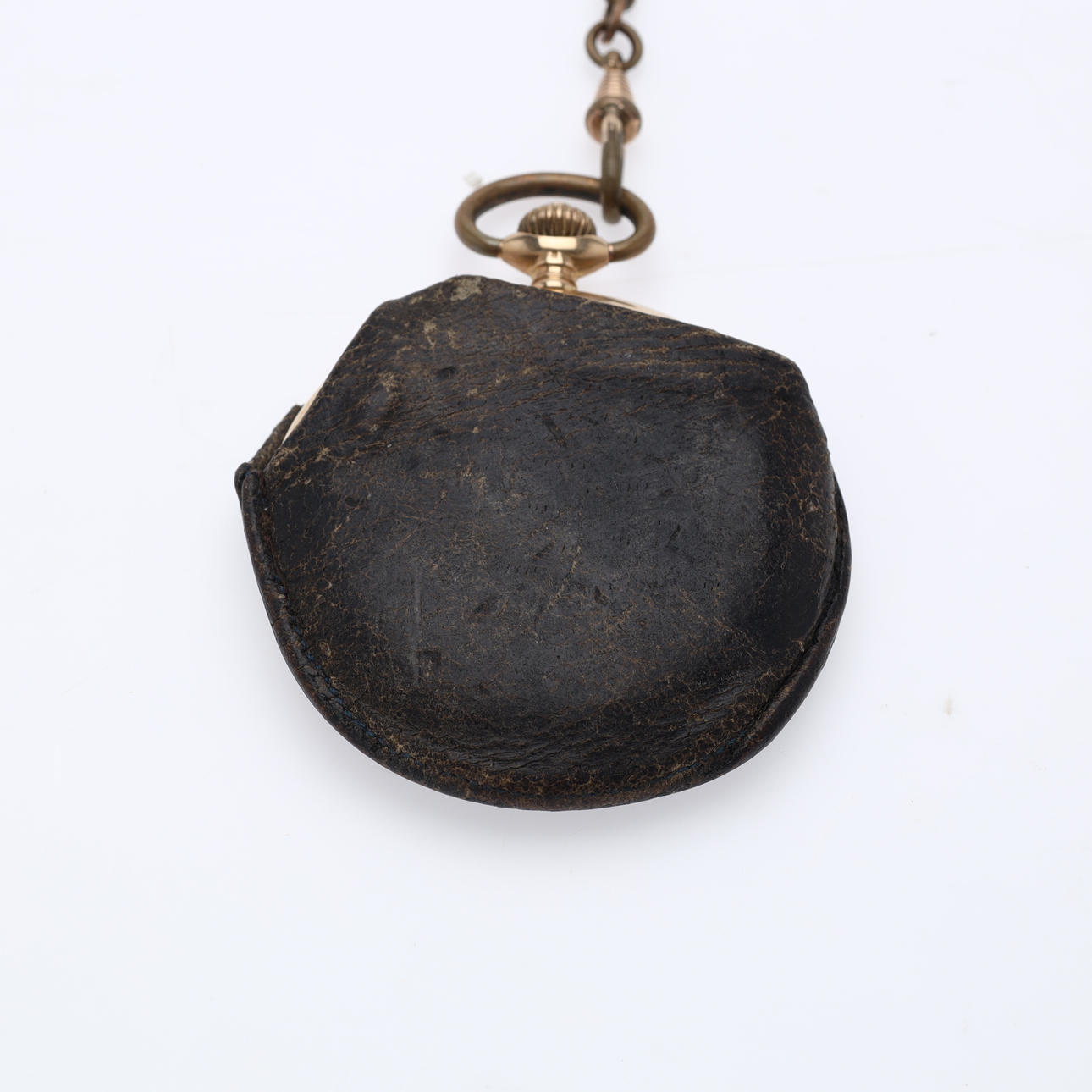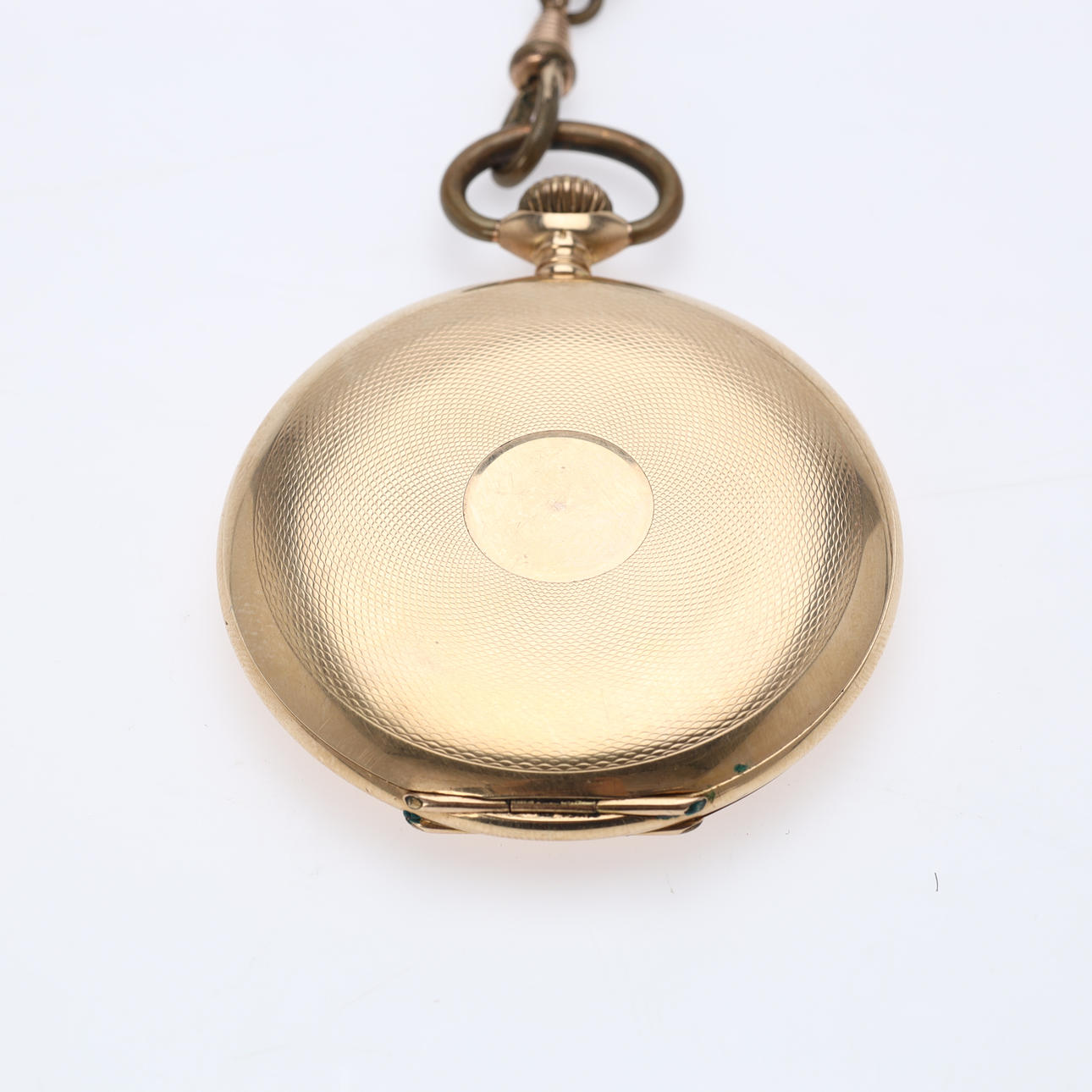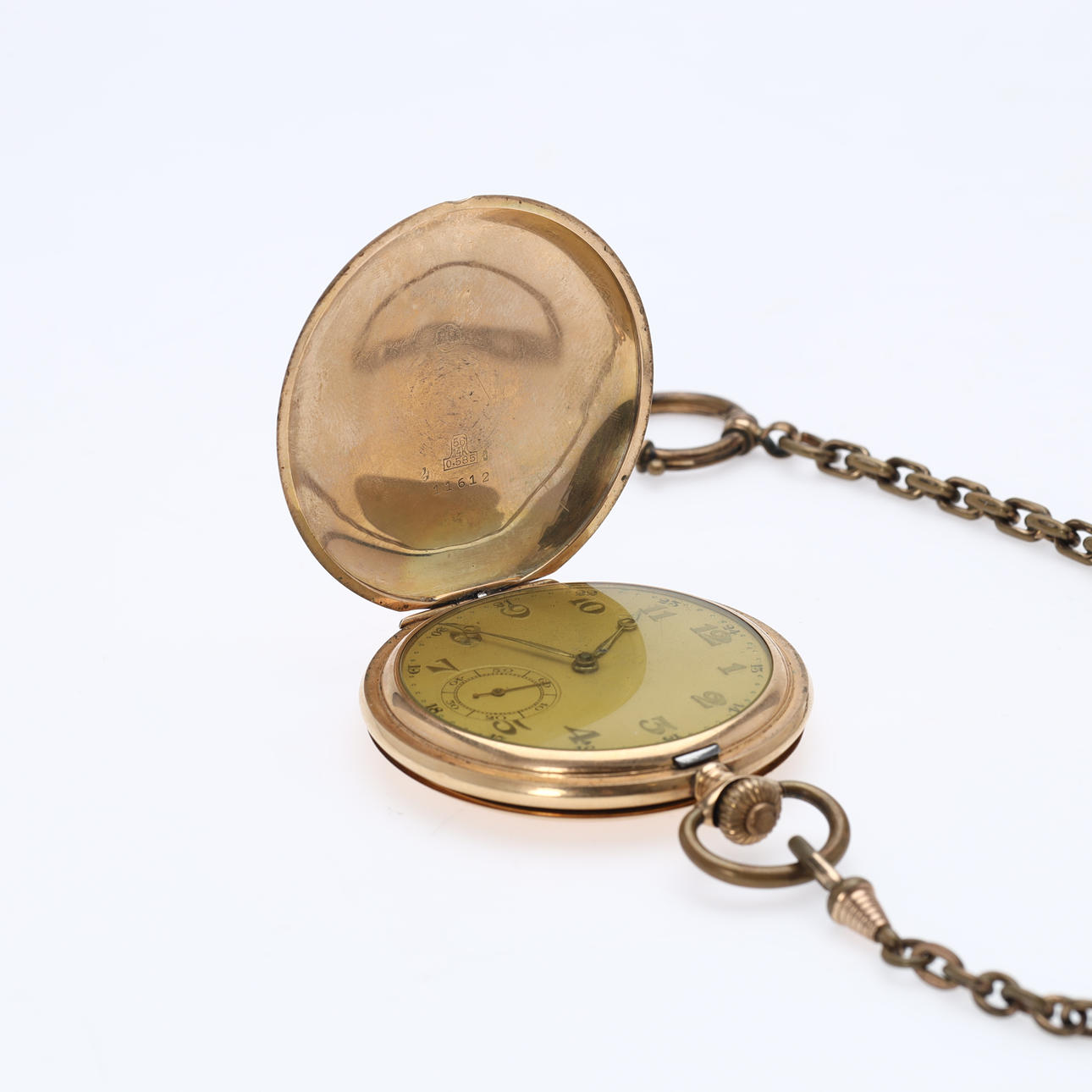 Dobbeltkapslet lommeur i 14 kt. guld. Gylden urskive med arabertal og tre visere. Ø 5 cm. Støvkapsel, optræksskrue og ophæng i forgyldt metal. Der medfølger en urkæde af double. Vægt 83,3 gr.