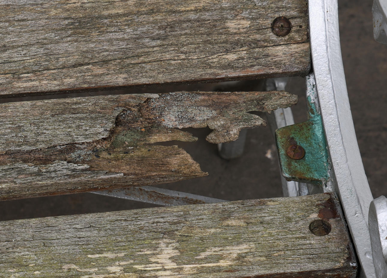 Slid og beskadigelse, snavs. Brædder skal udskiftes.