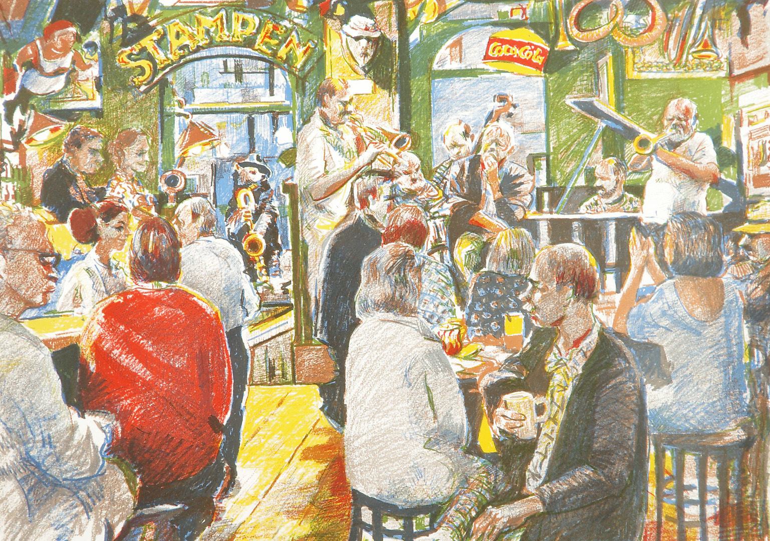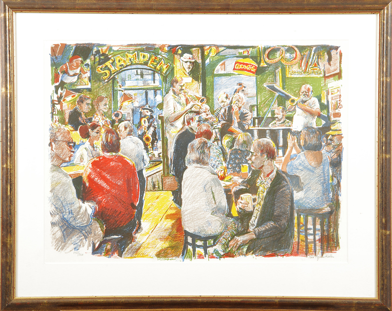 403245. PÄRA BJURSTRÖM. Barinteriør, farvelitografi, signeret.