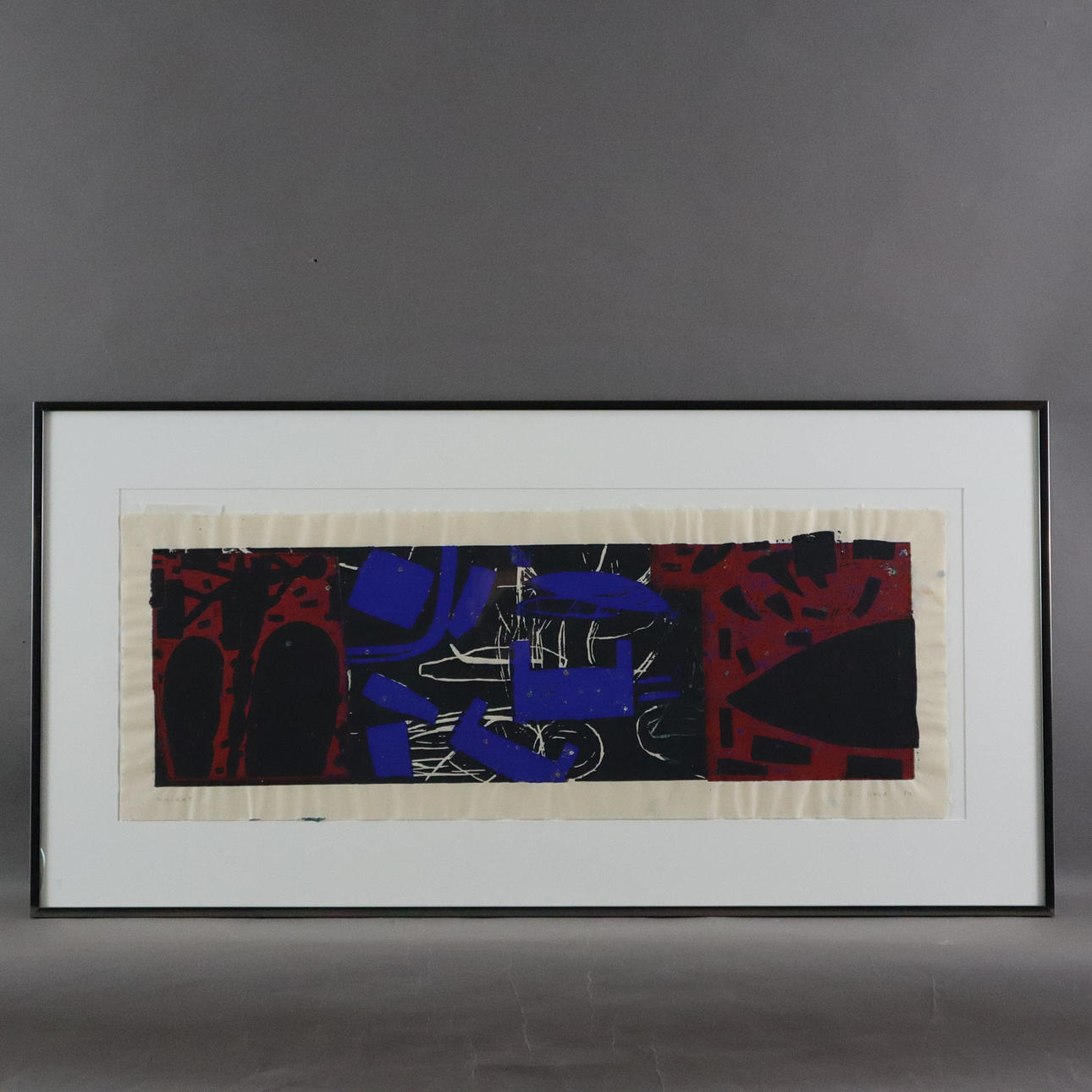 signeret og dateret nederst til højre, markeret som „unik“ nederst til venstre, arkstørrelse 33 x 88 cm, indrammet under glas, samlede mål ca. 55 x 109 cm,