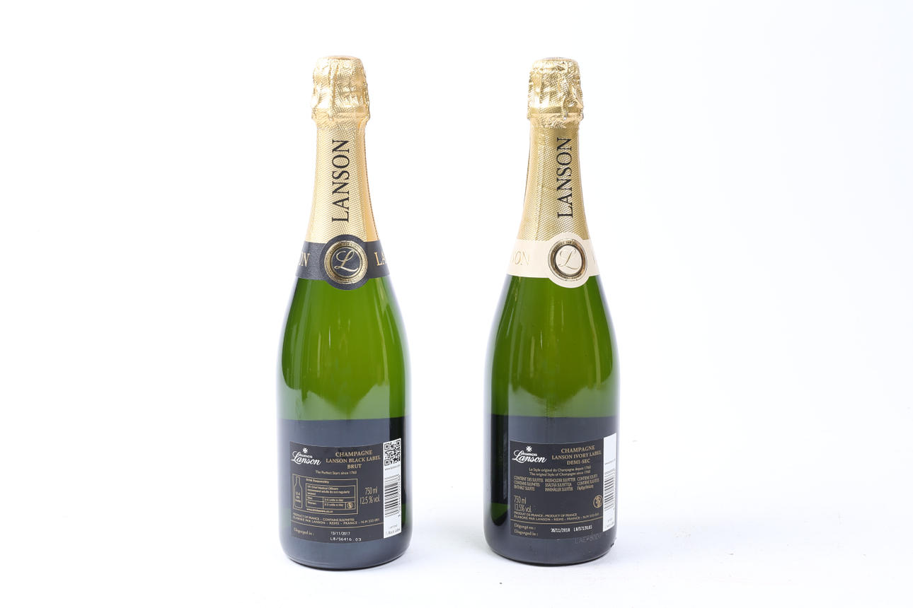 To flasker Lanson Champagne, herunder en Lanson Ivory Label Demi-Sec æske og en Lanson Black Label Brut Music Box i æske (2).