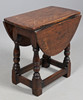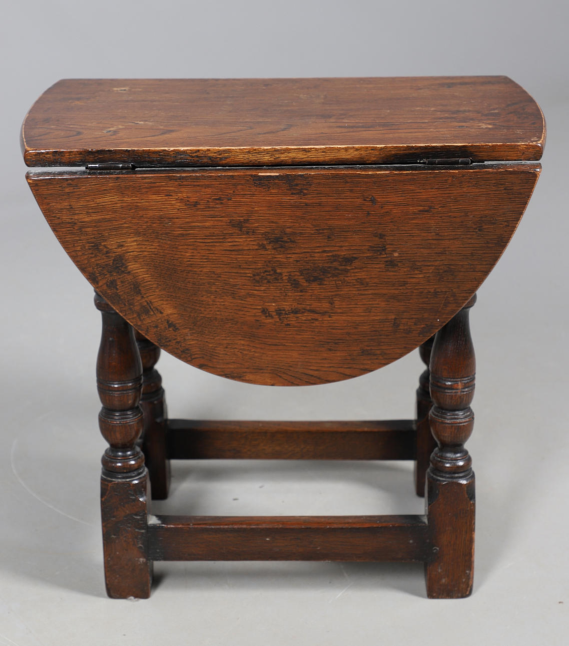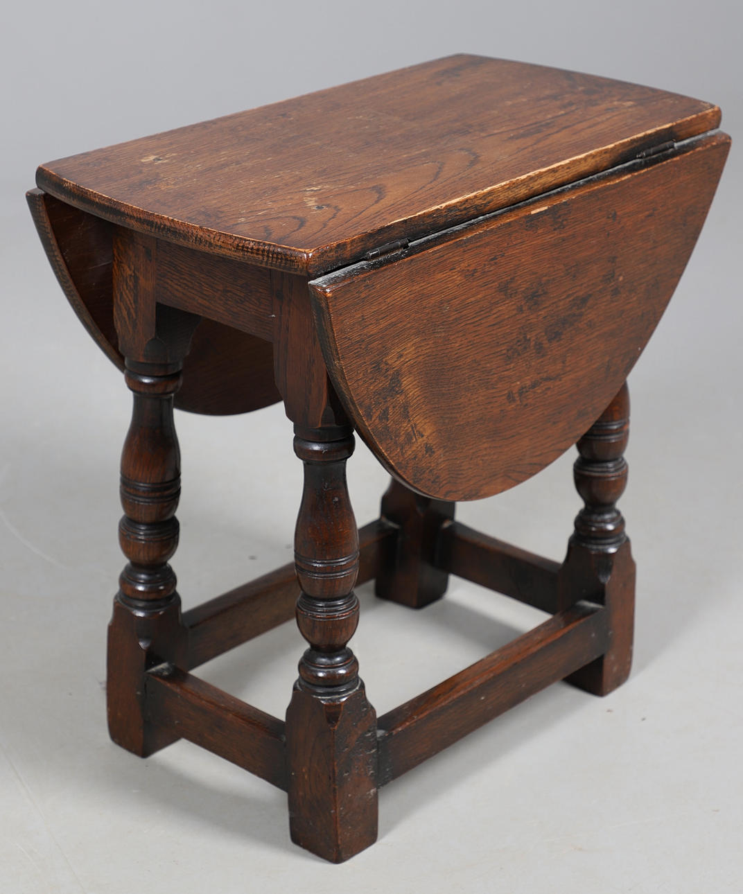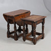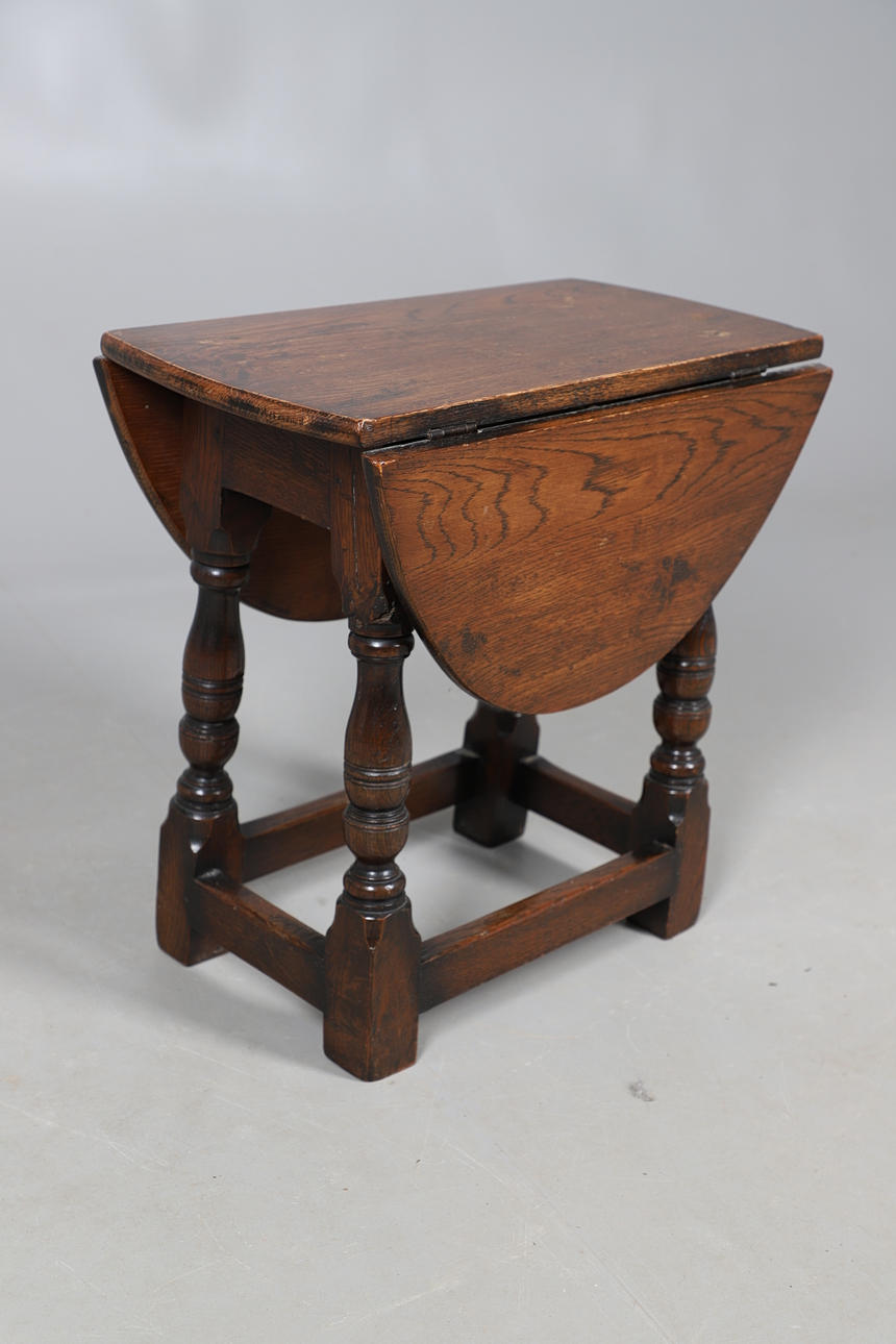 Inkluderer et lille firkantet bordbord og et ovalt foldeklaffbord, begge med drejede understøtninger og en firkantet båre. Dropklapbordet måler Højde 47,5 cm x Bredde 28 cm x Dybde 50 cm. Udvidet bredde 69cm. (2).
