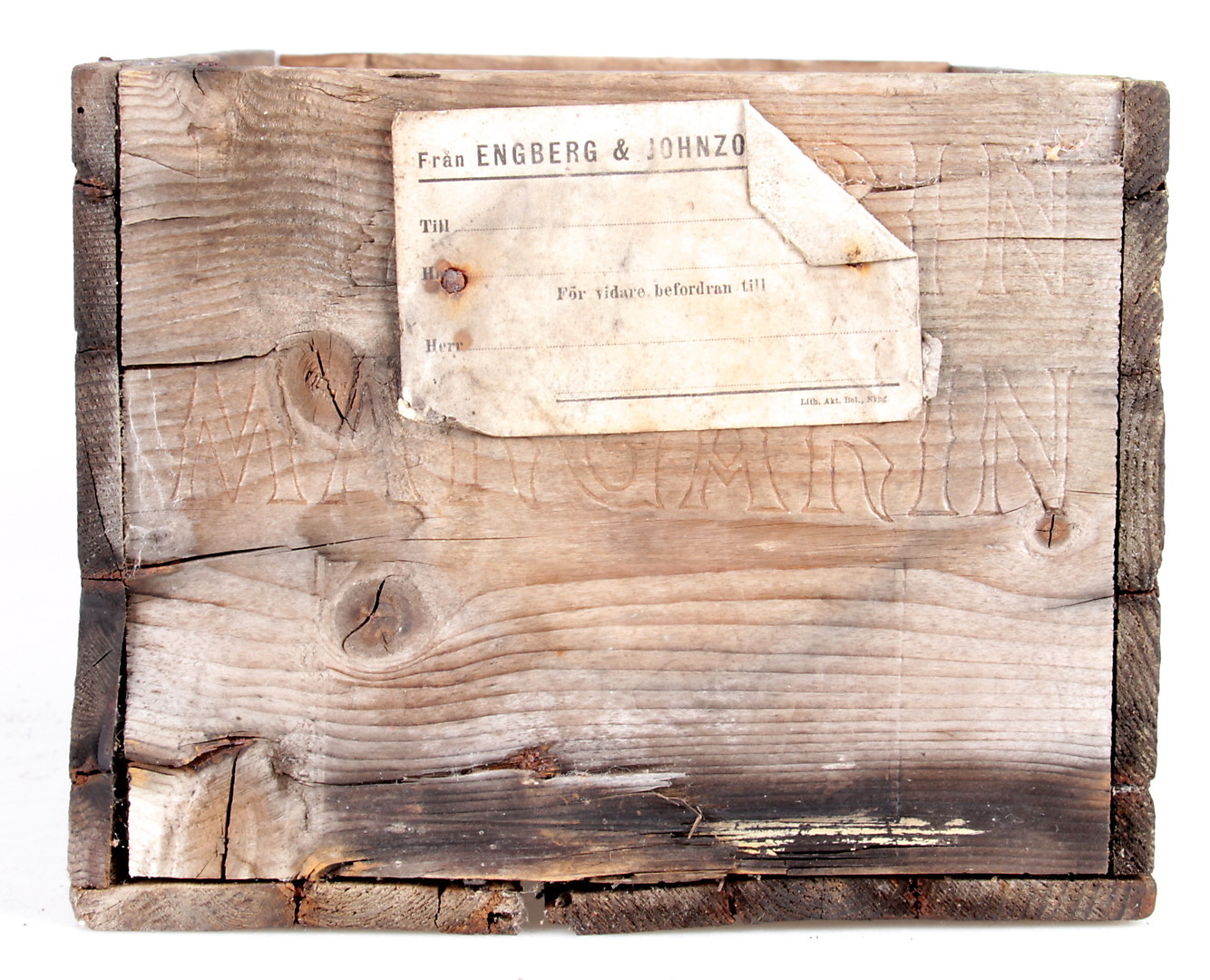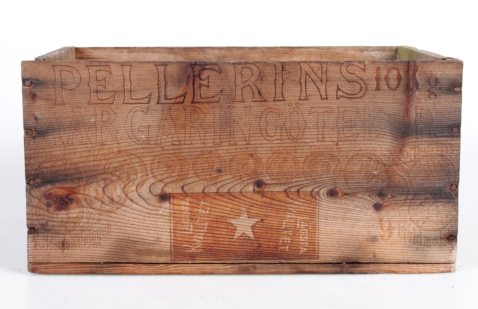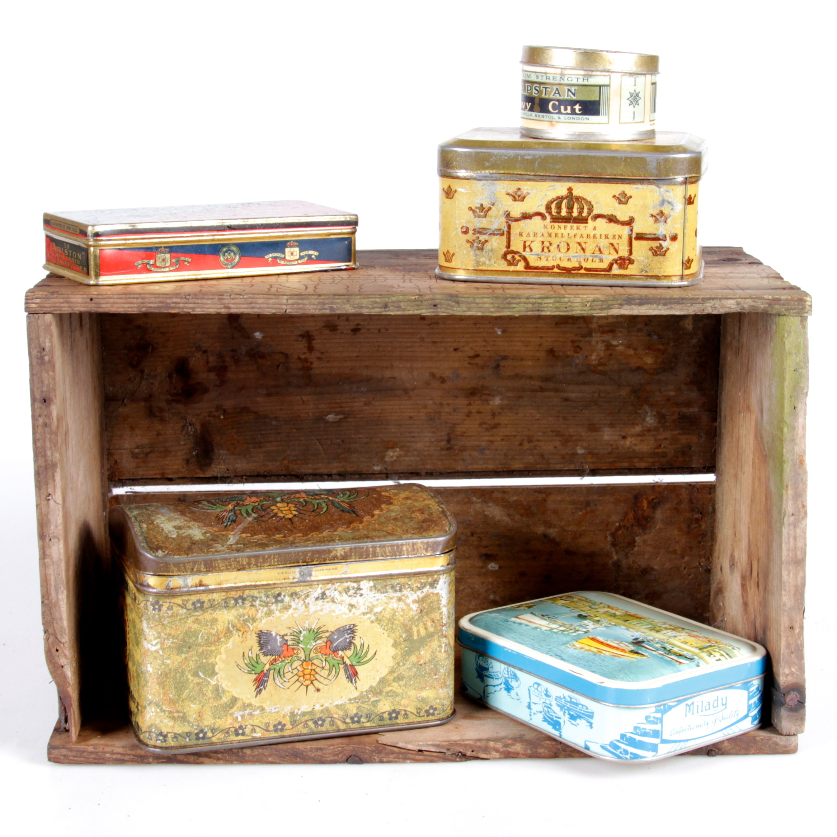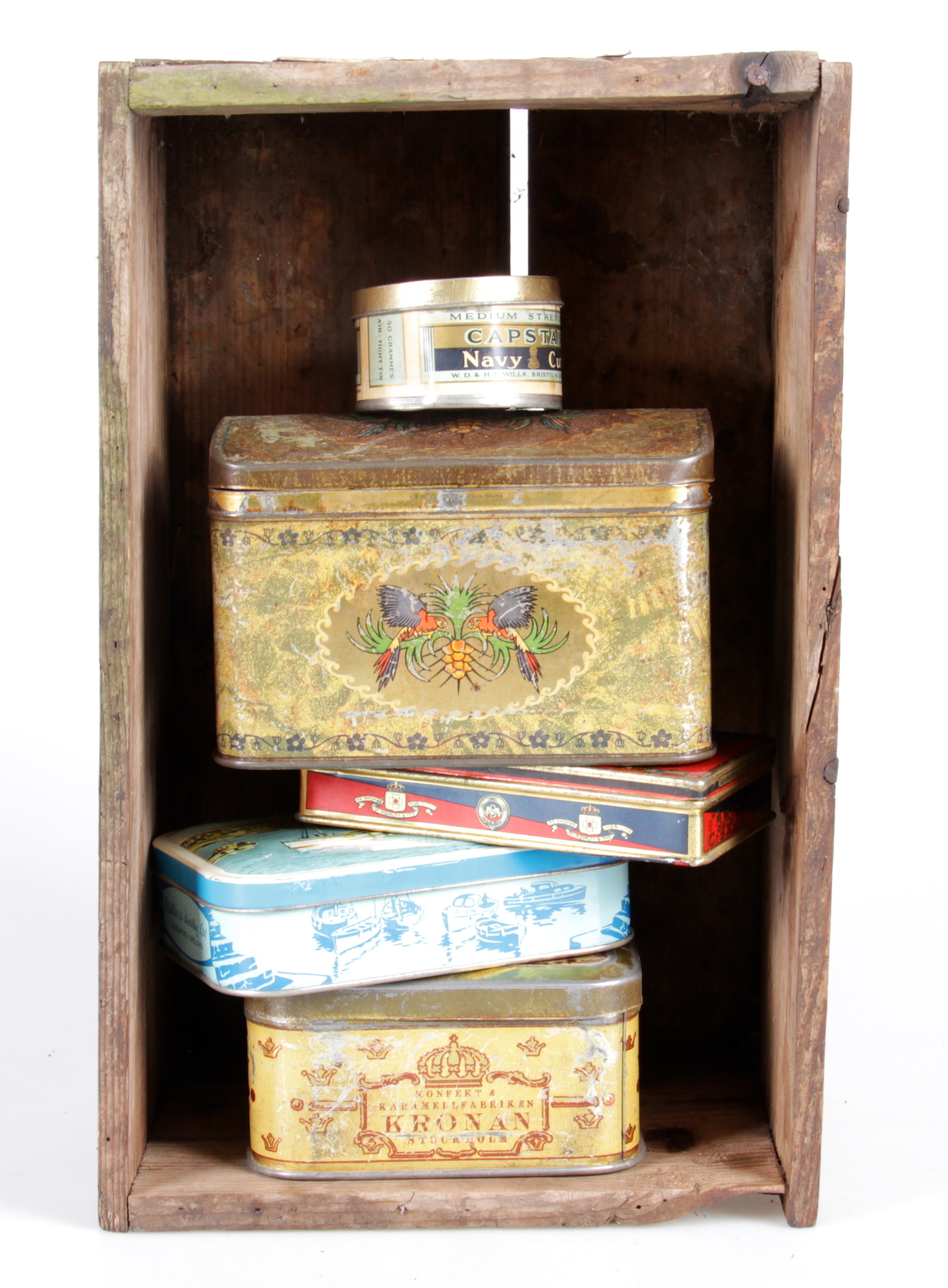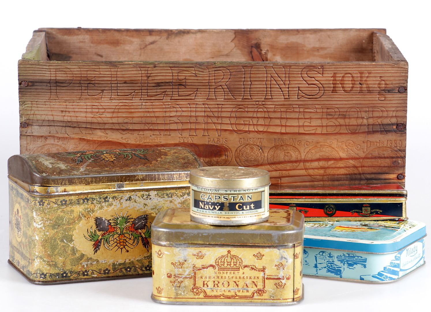 406975. Blikdåser og trækasse, 6 dele, 1900-tallet.