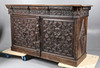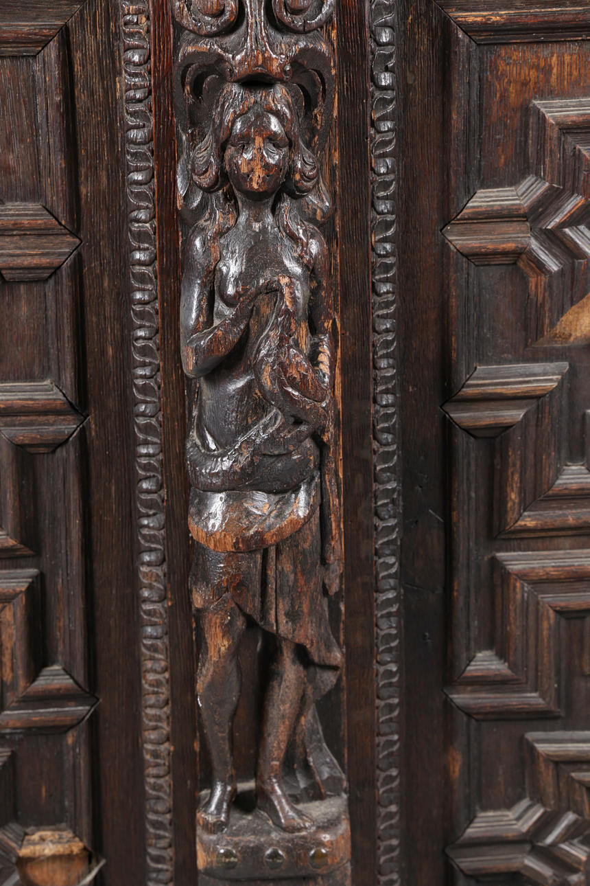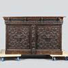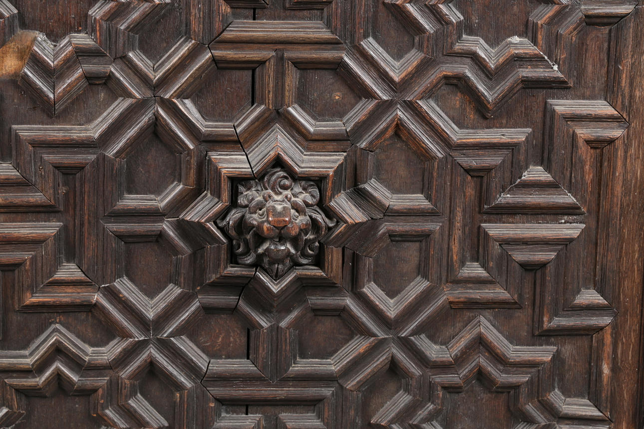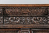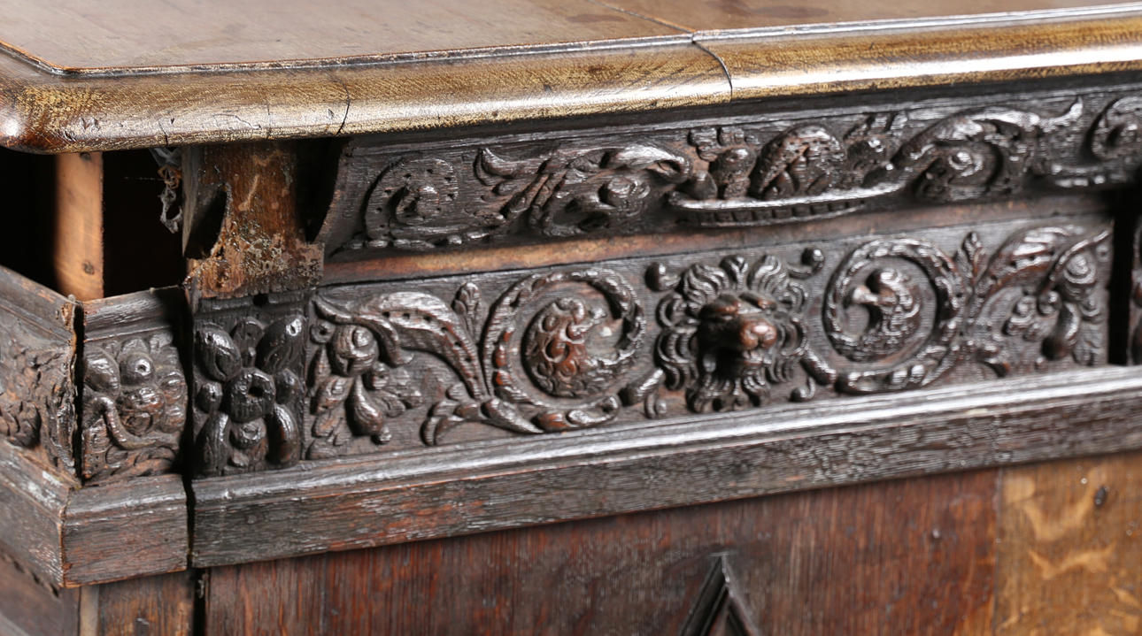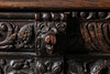 Den fregnformede top over en gadronet frise med løver maskerede korbeler og dateret „1639", over et par geometriske døre med løver i midten og en udskåret figurbetegnelse, 175 cm bred 105 cm høj 62 cm dyb.