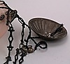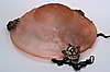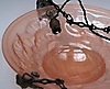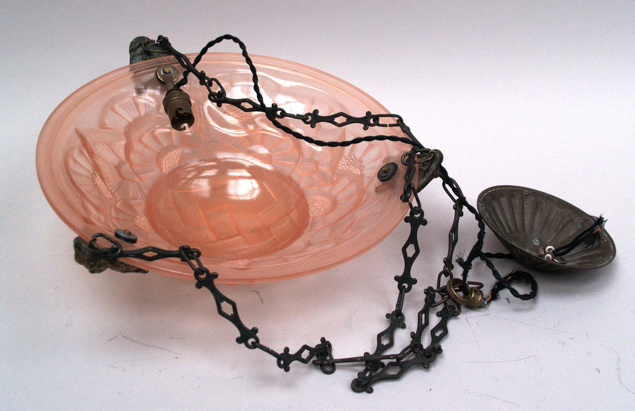 Art Déco loftlampe - 1920'erne/30'erne, rund skærm af rosafarvet matætset presset glas med stiliserede blomsterdekorationer, metalbeslag i form af damehoveder, enkeltflammet elektrificeret, sign. Degué, D. ca. 35,5, H 60 cm (inkl. kædeophæng).