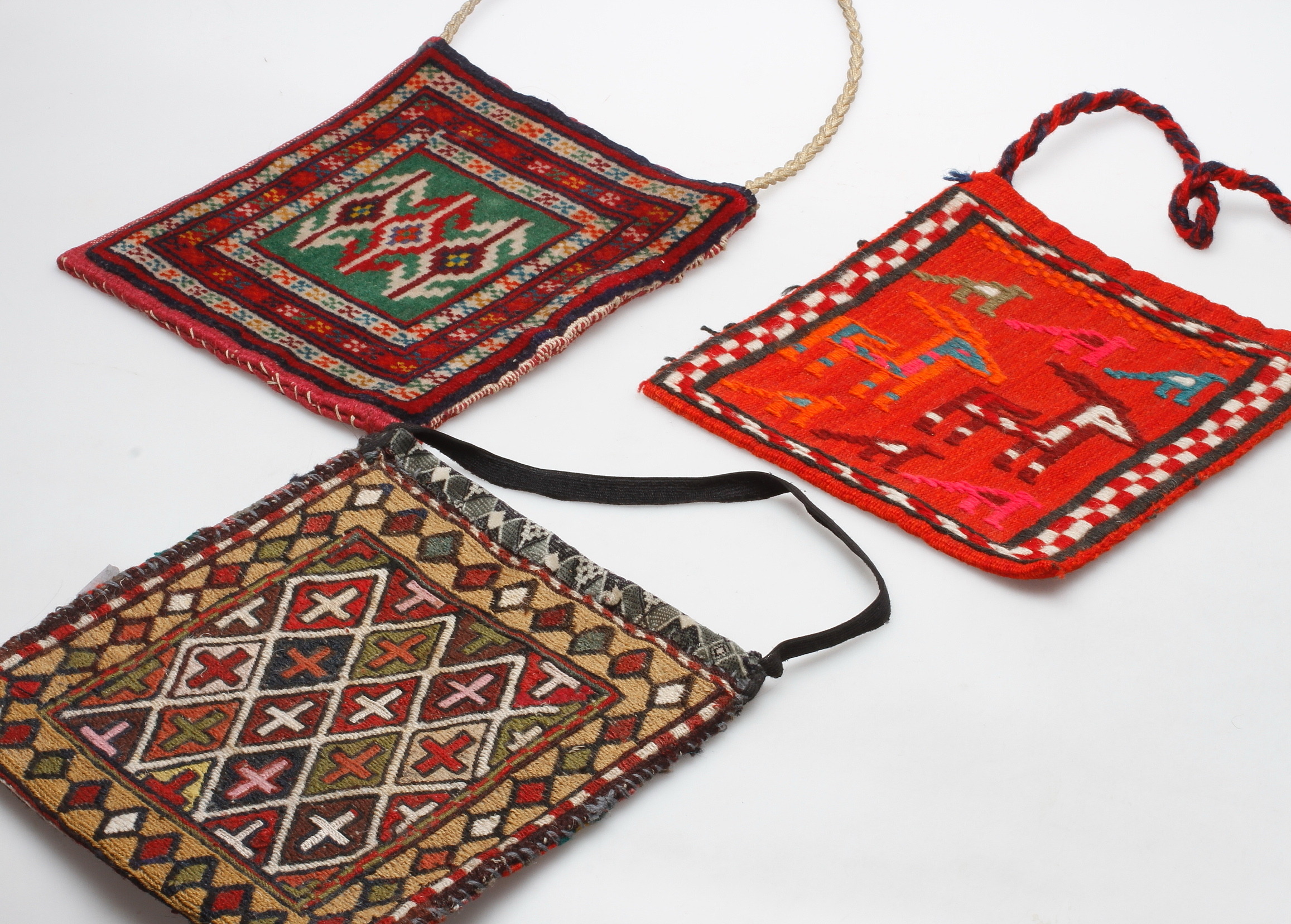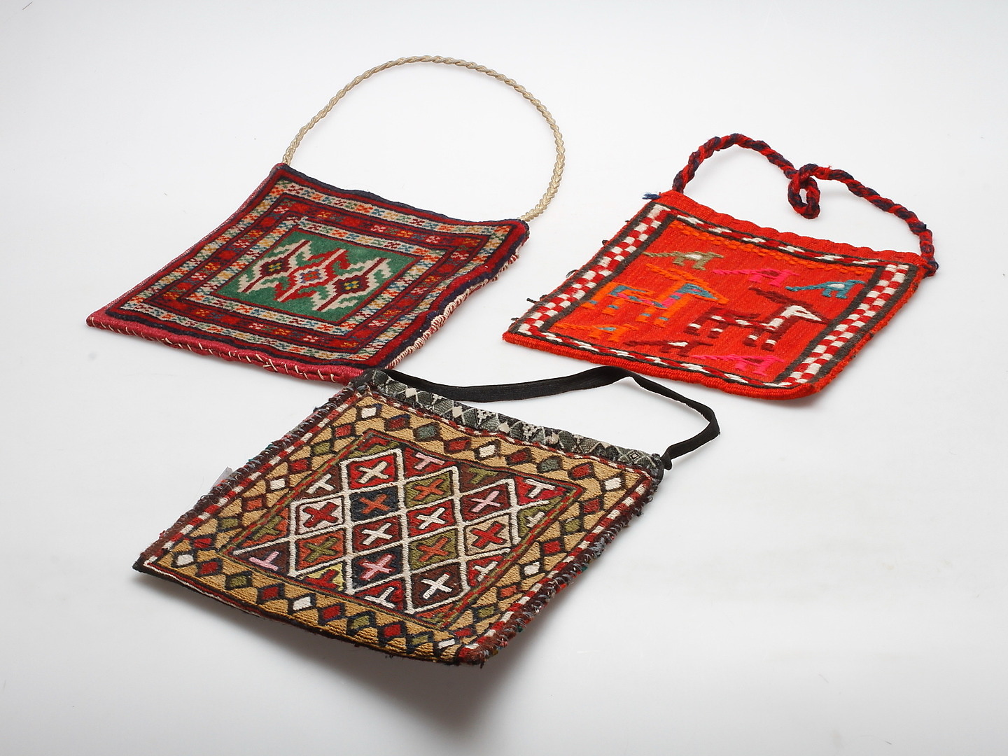 410330. TASKER/TEKSTILER med hanke, 3 stk, uld. Persien, 20. århundrede.