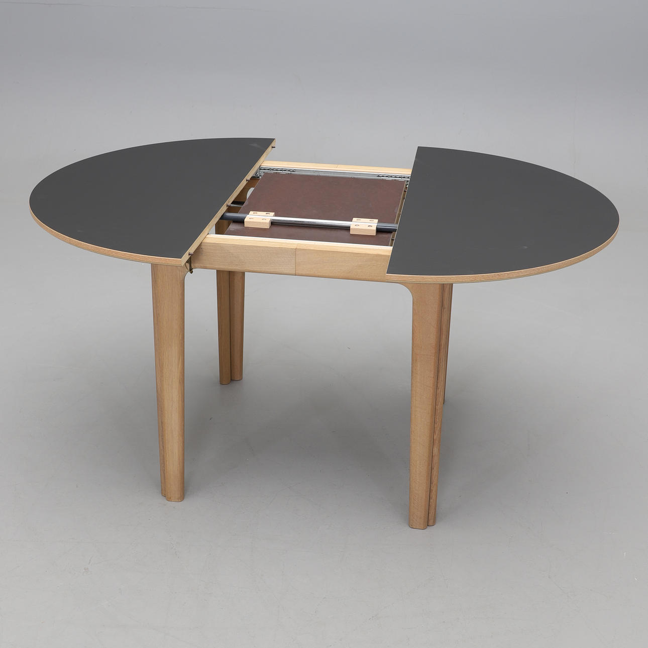 Ich. Rund sort lamineret delbar skive. Kan udvides med foldbar foldbar indsatsplade på 40 cm. Diam 105, højde 74 cm.