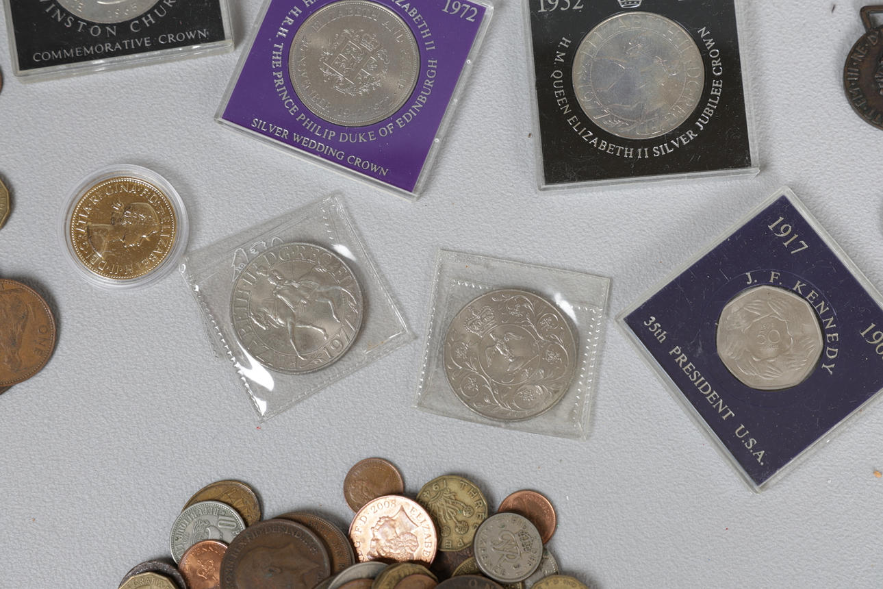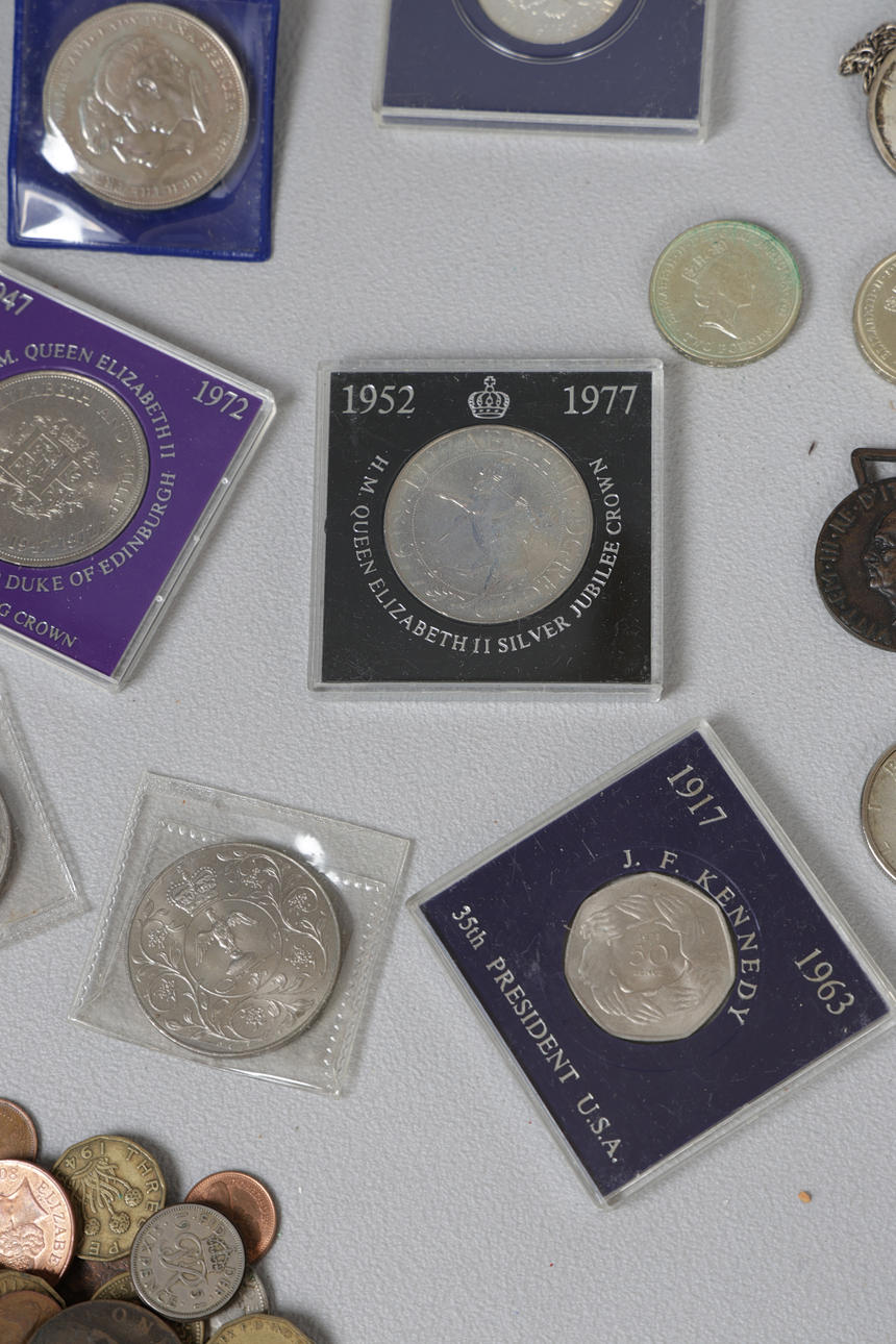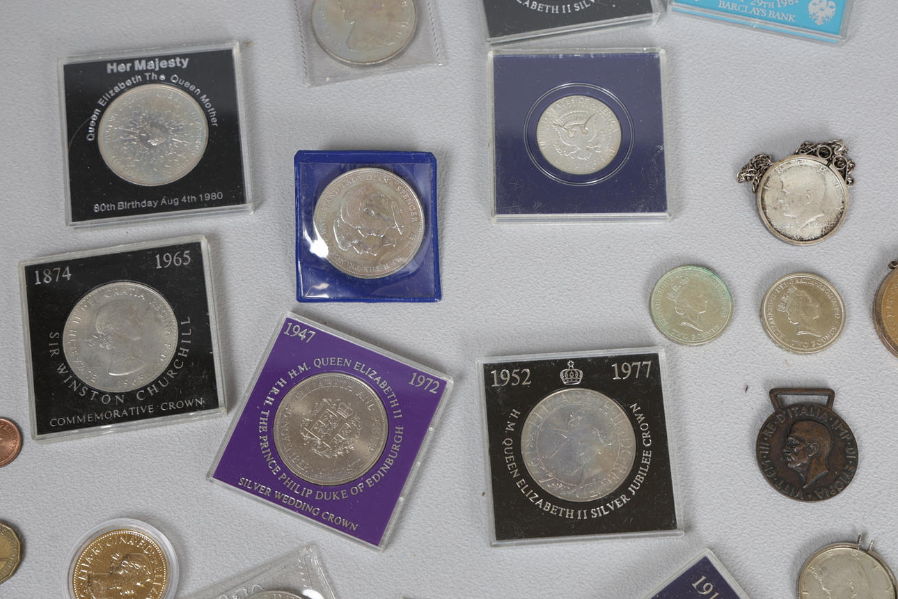 til inkluderet £2-mønter, 1951 Festival of Britain Crown, erindringskroner sammen med en stor samling eller GB og europæiske mønter.