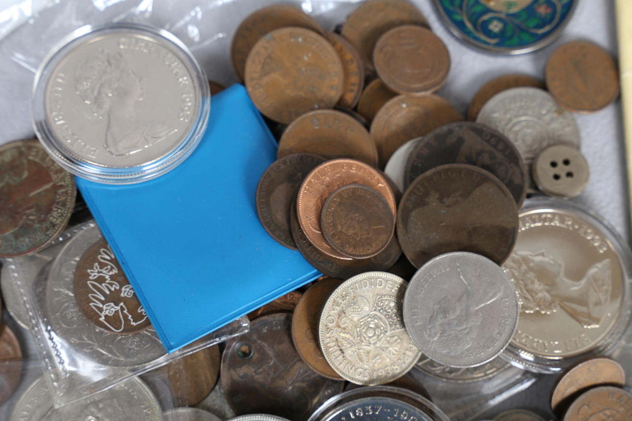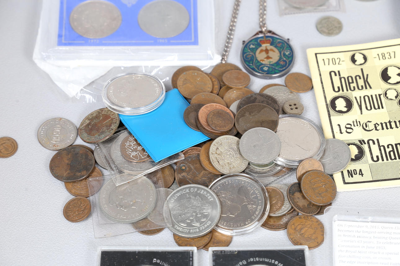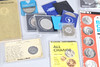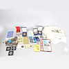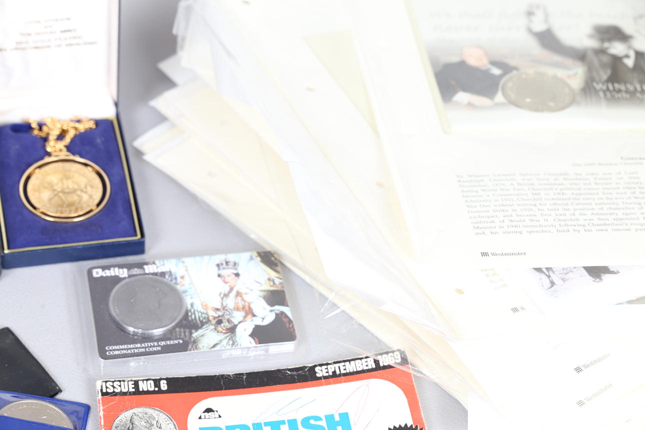 herunder dronningmor, Churchill og Diana omslag, erindringskroner, Frankrig 1998 Medallion, Storbritanniens første decimalmøntsæt, sammen med frimærker penny redds noteret.