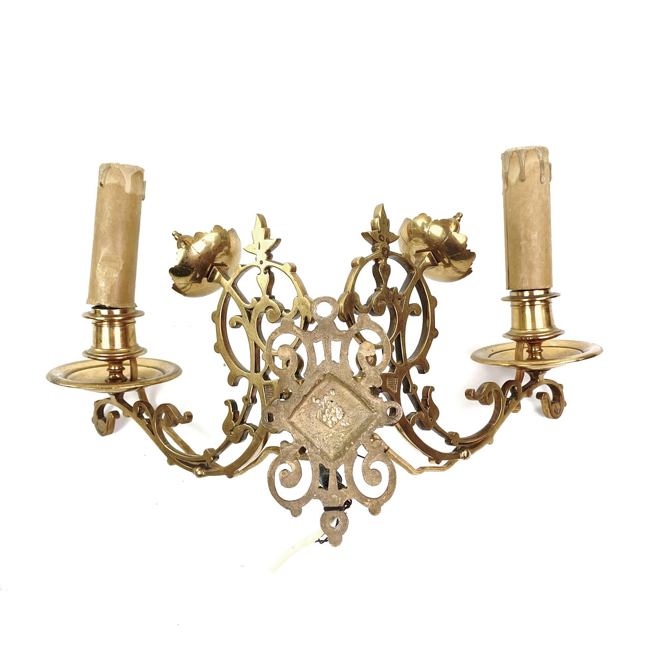 1 par lyslamper/væglamper i messing med dekorative detaljer. Toarmet. Ca. 26 x 20 x 17 cm.